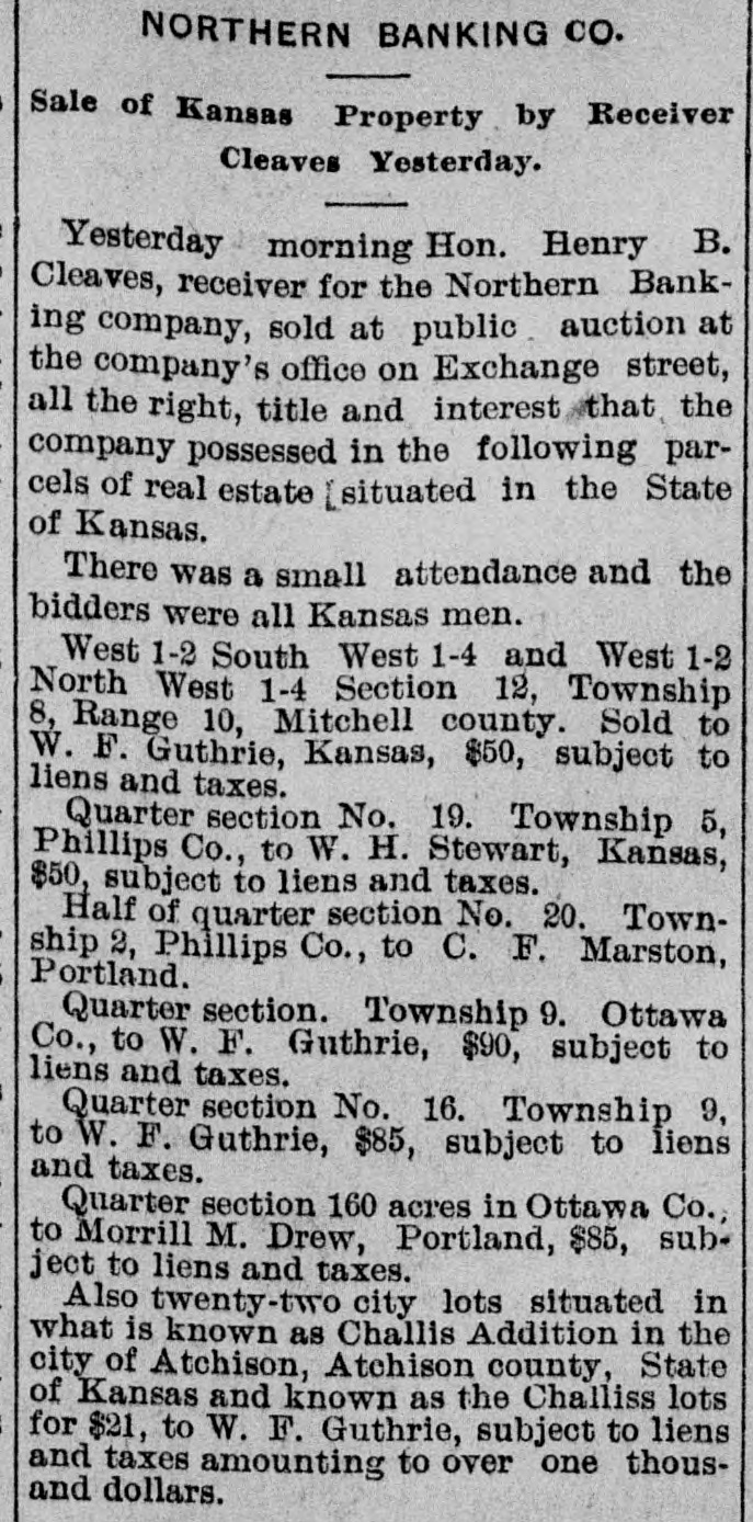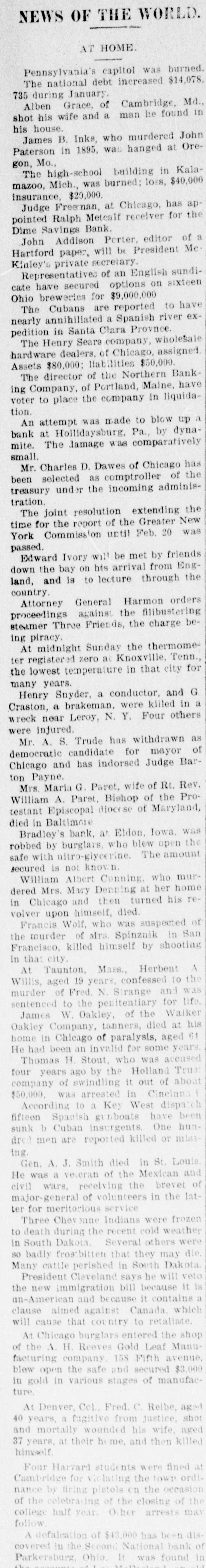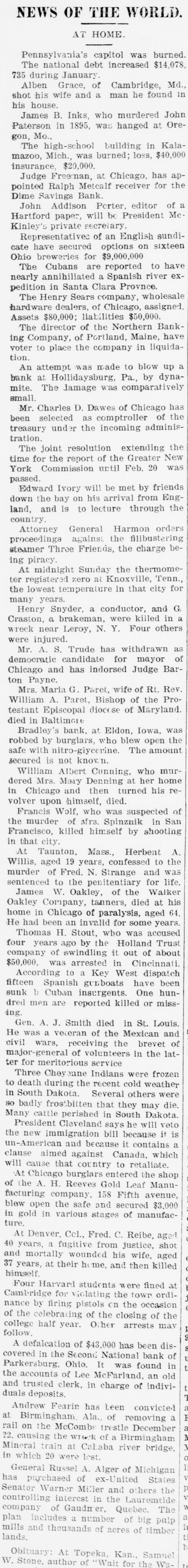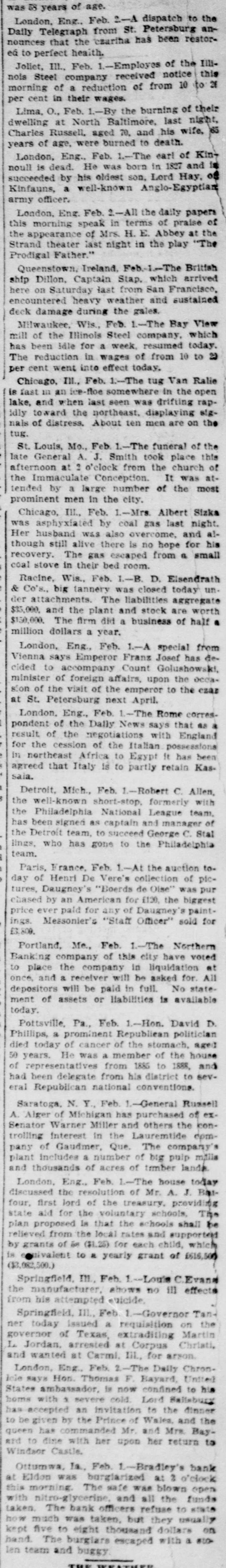 was is years of age. London, Eng., Feb. 2-A dispatch to the Daily Telegraph from St. Petersburg announces that the ceariha has been restorea to perfect health. Joliet, III., Feb. 1.-Employes of the Illinois Steel company received notice this morning of a reduction of from 10 to 26 per cent in their wages. Lima, O., Feb. 1.-By the burning of their dwelling at North Baltimore, last night, Charles Russell, aged 70. and his wife, 65 years of age, were burned to death. London, Eng., Feb. 1.-The earl of Kinnoull is dead. He was born in 1827 and is succeeded by his eldest son, Lord Hay, of Kinfauns, a well-known Anglo-Egyptian army officer. London, Eng. Feb. 2-All the daily papers this morning speak in terms of praise of the appearance of Mrs. H. E. Abbey at the Strand theater last night in the play "The Prodigal Father." Queenstown, Ireland, Feb-1.-The British ship Dillon, Captain Stap. which arrived here on Saturday last from San Francisco, encountered heavy weather and sustained deck damage during the gales. Milwaukee, Wis., Feb. 1.-The Bay View mill of the Illinois Steel company, which has been idle for a week, resumed today. The reduction in wages of from 10 to 2) per cent went into effect today. Chicago, III., Feb. 1.-The tug Van Ralie is fast in an ice-floe somewhere in the open lake, and when last seen was drifting rapidly toward the northeast, displaying signals of distress. About ten men are on the tug. St. Louis, Mo., Feb. 1.-The funeral of the late General A. J. Smith took place this afternoon at : o'clock from the church of the Immaculate Conception. It was attended by a large number of the most prominent men in the city. Chicago, III., Feb. 1.-Mrs. Albert Sizka was asphyxiated by coal gas last night. Her husband was also overcome, and although still alive there is no hope for his recovery. The gas escaped from a small coal stove in their bed room. Racine, Wis., Feb. 1.-B. D. Elsendrath & Co's., big tannery was closed today under attachments. The liabilities aggregate $35,000. and the plant and stock are worth $150,000. The firm did a business of half a million dollars a year. London, Eng., Feb. 1.-A special from Vienna says Emperor Franz Josef has decided to accompany Count Golushowski, minister of foreign affairs, upon the occasion of the visit of the emperor to the ezar at St. Petersburg next April. London. Eng., Feb. L-The Rome correspondent of the Daily News says that as a result of the negotiations with England for the cession of the Italian possessions in northeast Africa to Egypt It has been agreed that Italy is to partly retain Kassala. Detroit, Mich., Feb. 1.-Robert C. Allen, the well-known short-stop, formerly with the Philadelphia National League team. has been signed as captain and manager of the Detroit team, to succeed George C. Stal lings, who has gone to the Philadelphia team. Paris, France, Feb. 1.-At the auction today of Henri De Vere's collection of pictures. Daugney's "Boerds de Olse" was pur chased by an American for £120, the biggest price ever paid for any of Daugney's paintings. Messonier's "Staff Officer" sold for £3,800. Portland, Me., Feb. 1.-The Northern Banking company of this city have voted to place the company In liquidation at once. and a receiver will be asked for. All depositors will be paid in full. No statement of assets or liabilities is available today. Pottsville, Pa., Feb. 1.-Hon. David D. Phillips, a prominent Republican politician died today of cancer of the stomach, aged 50 years. He was a member of the house of representatives from 1885 to 1888, and had been delegate from his district to several Republican national conventions. Saratoga, N. Y., Feb. 1.-General Russell A. Alger of Michigan has purchased of exSenator Warner Miller and others the controlling interest in the Lauremtide company of Gaudmer, Que. The company's plant includes a number of big pulp mills and thousands of acres of tember lands. London, Eng., Feb. L-The house today discussed the resolution of Mr. A. J. Baifour, first lord of the treasury, providing state aid for the voluntary schools, The plan proposed Is that the schools shall be relieved from the local rates and supported by grants of in ($1.25) for each child, which is equivalent to & yearly grant of £616,500 ($3,082,500.) Springfield, m., Feb. 1.-Louis C.Evana the manufacturer, shows no ill effects from his attempted suicide, Springfield, III, Feb. 1.-Governor Tanner today issued a requisition on the governor of Texas, extraditing Martin L Jordan, arrested at Corpus Christi, and wanted at Carmi. Iil, for arson. London, Eng., Feb. 2-The Daily ChronIcle says Hon. Thomas F Bayard, United States ambassador, is now confined to his homs with 1 severe cold Lord Ballsbury has accepted an invitation to the dinner to be given by the Prince of Wales, and the queen has commanded Mr. and Mrs. Bayand to dine with her upon her return to Windsor Castle. Ottumwa, la., Feb. 1.-Bradley's bank at Eldon was burgiarized at 3 o'clock this morning. The wafe was blown open with nitro-glycerine, and all the funds taken. The bank officers refuse to state how much was taken, but they usually kept five to eight thousand dollars on hand. The burgiars escaped with a #10len team and buggy THE
