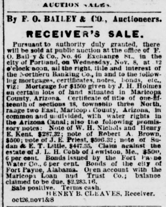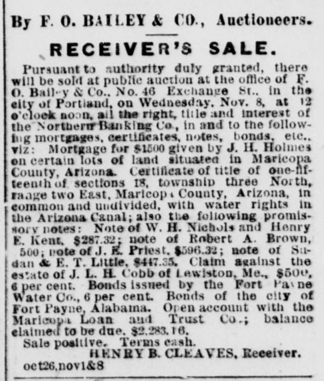 By F. 0. BAILEY & CO., Auctioneers. RECEIVER'S SALE. Pursuant to authority duly granted, there will be sold at public auction at the office of F. O. Bailey & Co., No. 46 Exchange St., in the city of Portland, on Wednesday. Nov. 8, at 12 o'clock noon, all the right, title and interest of the Northern Banking Co., in and to the followIng mortgages, certificates, notes, bonds, etc., viz: Mortgage for $1500 given by J. H. Holmes on certain lots of land situated in Maricopa County, Arizona. Certificate of title of one-fifteenth of sections 18, township three North, range two East, Maricop County, Arizona, in common and undivided, with water rights in the Arizona Canal; also the following promissory notes: Note of W. H. Nichols and Henry E. Kent. $287.32; note of Robert A. Brown, 500; note of J. E. Priest. $596.32; note of Sudan & E. T. Little, $447.35. Claim against the estate of J. L. H. Cobb of Lewiston, Me., $500, 6 per cent. Bonds issued by the Fort Payne Water Co., 6 per cent. Bonds of the city of Fort Payne, Álabama. Open account with the Maricopa Loan and Trust Co.; balance claimed to be due. $2,283.16. Sale positive. Terms cash. HENRY B. CLEAVES, Receiver. oct26,nov1&8
