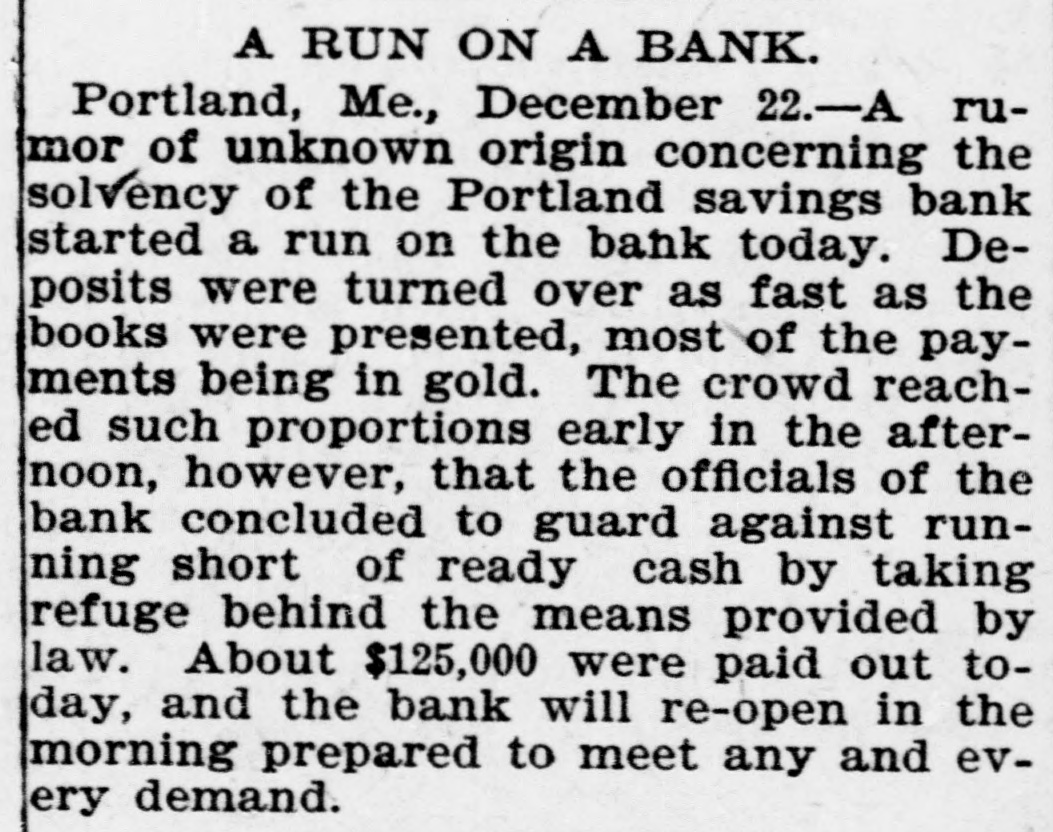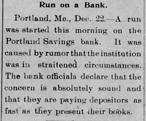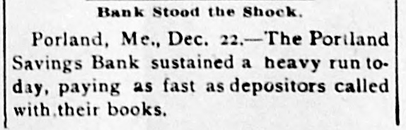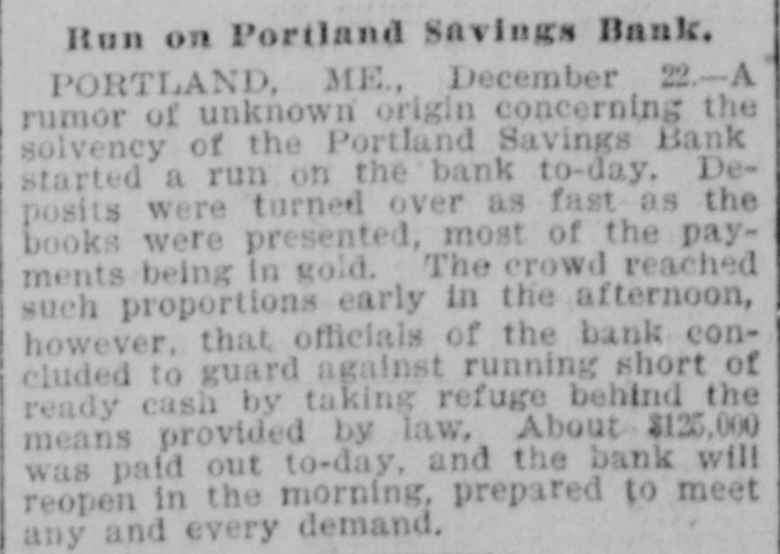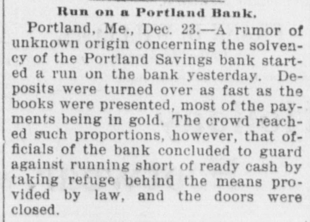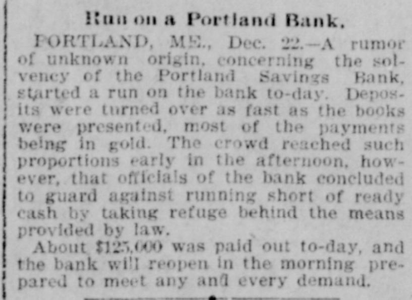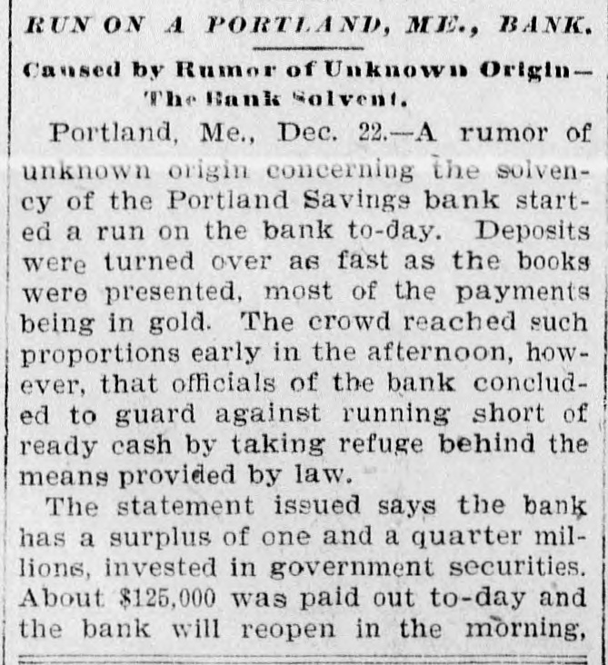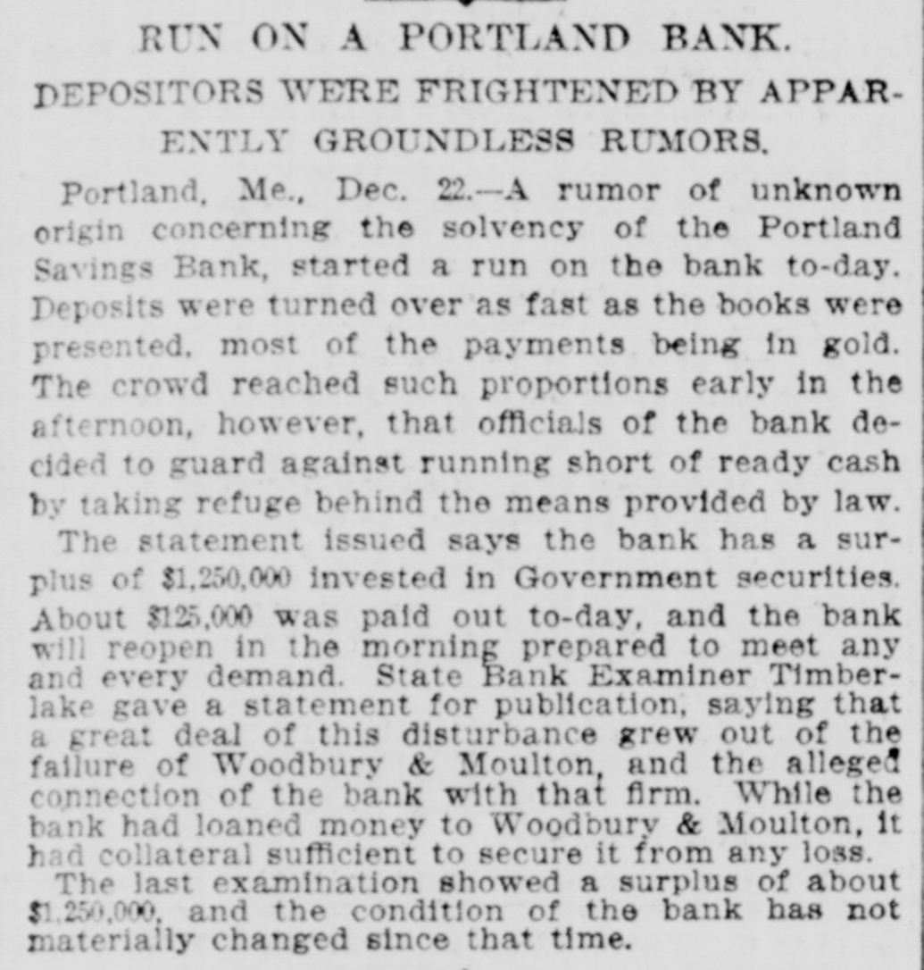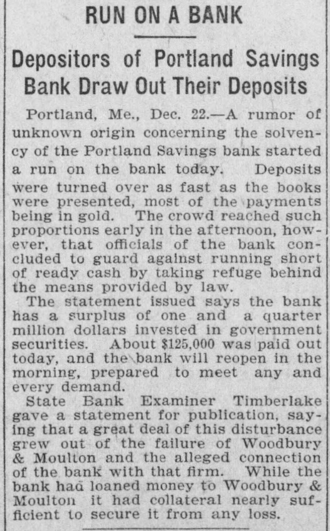 RUN ON A BANK Depositors of Portland Savings Bank Draw Out Their Deposits Portland, Me., Dec. 22.-A rumor of unknown origin concerning the solvency of the Portland Savings bank started a run on the bank today. Deposits were turned over as fast as the books were presented, most of the payments being in gold. The crowd reached such proportions early in the afternoon, however, that officials of the bank concluded to guard against running short of ready cash by taking refuge behind the means provided by law. The statement issued says the bank has a surplus of one and a quarter million dollars invested in government securities. About $125,000 was paid out today, and the bank will reopen in the morning, prepared to meet any and every demand. State Bank Examiner Timberlake gave a statement for publication, saying that a great deal of this disturbance grew out of the failure of Woodbury & Moulton and the alleged connection of the bank with that firm. While the bank had loaned money to Woodbury & Moulton it had collateral nearly sufficient to secure it from any loss.