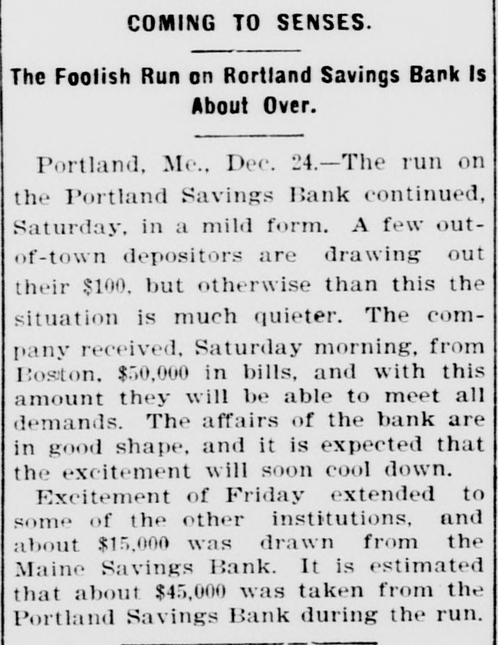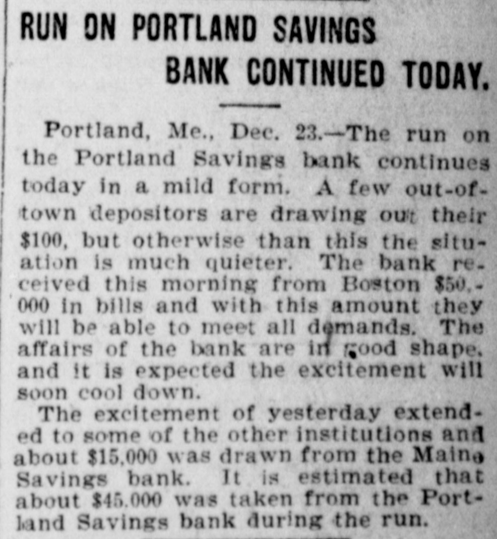 RUN ON PORTLAND SAVINGS BANK CONTINUED TODAY. Portland, Me., Dec. 23.-The run on the Portland Savings bank continues today in a mild form. A few out-oftown depositors are drawing out their $100, but otherwise than this the situation is much quieter. The bank received this morning from Boston $50.000 in bills and with this amount they will be able to meet all demands. The affairs of the bank are in good shape. and it is expected the excitement will soon cool down. The excitement of yesterday extended to some of the other institutions and about $15,000 was drawn from the Maine Savings bank. It is estimated that about $45,000 was taken from the Portland Savings bank during the run.