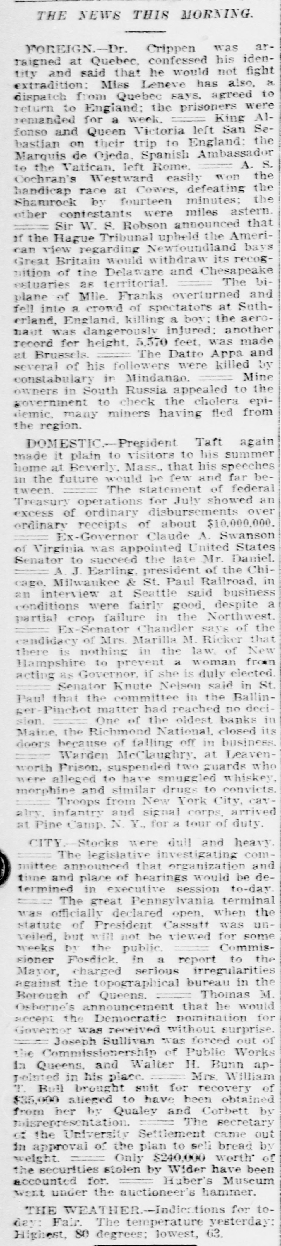 THE NEWS THIS MORNING. FOREIGN.-Dr. Crippen was arraigned at Quebec, confessed his identity and said that he would not fight extradition: Miss Leneve has also, a dispatch from Quebec says. agreed to return to England: the prisoners were remanded for a week. King Alfonso and Queen Victoria left San Sebastian on their trip to England: the Marquis de Ojeda, Spanish Ambassador to the Vatican. left Rome. A. S. Cochran's Westward easily won the handicap race at Cowes, defeating the Shamrock by fourteen minutes: the other contestants were miles astern. Sir W. S. Robson announced that if the Hague Tribunal upheld the American view regarding Newfoundland bays Great Britain would withdraw its recognition of the Delaware and Chesapeake estuaries as territorial. The biplane of Mile. Franks overturned and fell into a crowd of spectators at Sutherland, England, killing a boy: the aeromaut was dangerously injured: another record for height, 5,570 feet, was made at Brussels. The Datto Appa and several of his followers were killed by constabulary in Mindanao. Mine owners in South Russia appealed to the government to check the cholera epidemic. many miners having fled from the region. DOMESTIC-President Taft again made it plain to visitors to his summer home at Beverly, Mass., that his speeches in the future would be few and far between. The statement of federal Treasury operations for July showed an excess of ordinary disbursements over ordinary receipts of about $10,000,000. Ex-Governor Claude A. Swanson of Virginia was appointed United States Senator to succeed the late Mr. Daniel. A J. Earling, president of the Chicago, Milwaukee & St. Paul Railroad. in an interview at Seattle said business conditions were fairly good. despite a partial crop failure in the Northwest. Ex-Senator Chandler says of the candidacy of Mrs. Marilla M. Ricker that there is nothing in the law. of New Hampshire to prevent a woman from acting as Governor, if she is duly elected. Senator Knute Nelson said in St. Paul that the committee in the Ballinger-Pinchot matter had reached no decision. One of the oldest banks in Maine, the Richmond National. closed its doors because of falling off in business. Warden McClaughry, at Leavenworth Prison, suspended two guards who were alleged to have smuggled whiskey, morphine and similar drugs to convicts. Troops from New York City, cavalry. infantry and signal corps. arrived at Pine Camp. N. Y., for a tour of duty. CITY.-Stocks were dull and heavy. The legislative investigating committee announced that organization and time and place of hearings would be determined in executive session to-day. === The great Pennsylvania terminal was officially declared open, when the statute of President Cassatt was unveiled, but will not be viewed for some Commisweeks Dy the public. sioner Fosdick. in a report to the Mayor, charged serious irregularities against the topographical bureau in the Borough of Queens. Thomas M. Oshorne's announcement that he would accept the Democratic nomination for Governor was received without surprise. Joseph Sullivan was forced out of the Commissionership of Public Works In Queens, and Walter H. Bunn appointed in his place. Mrs. William T. Bull brought suit for recovery of $35,000 slieged to have been obtained from her by Qualey and Corbett by misrepresentation. The secretary of the University Settlement came out in approval of the plan to sell bread by