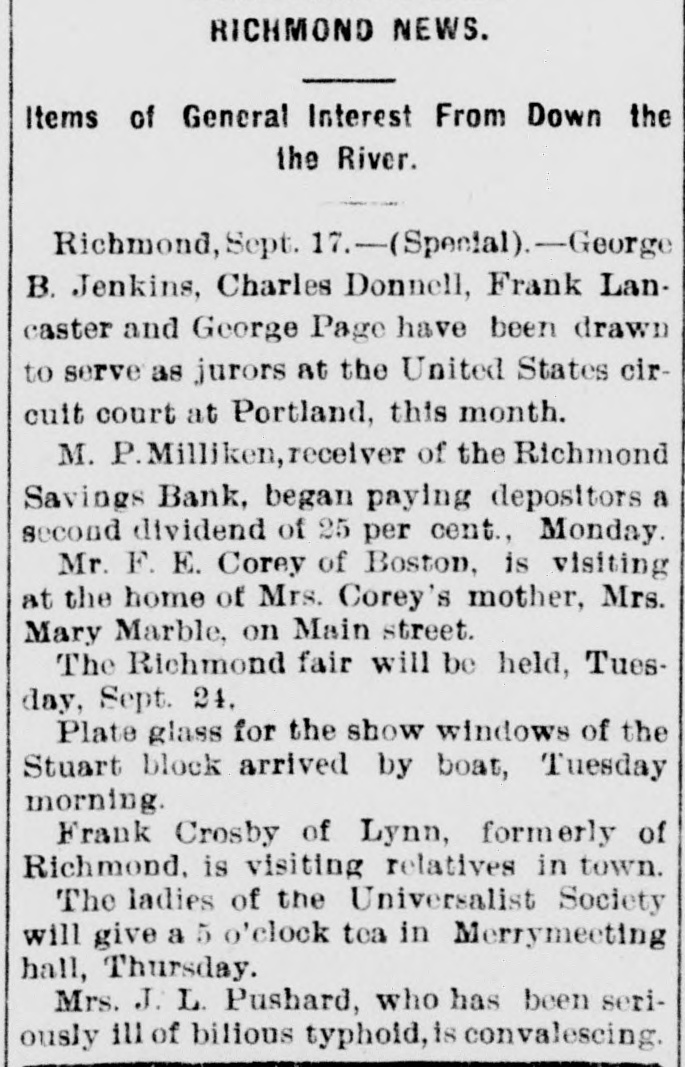 RICHMOND NEWS. Items of General Interest From Down the the River. Richmond, Sept. 17.-(Special).-George B. Jenkins, Charles Donnell, Frank Lan. caster and George Page have been drawn to serve as jurors at the United States circuit court at Portland, this month. M. P.Milliken, receiver of the Richmond Savings Bank, began paying depositors a second dividend of 25 per cent., Monday. Mr. F. E. Corey of Boston, is visiting at the home of Mrs. Corey's mother, Mrs. Mary Marble, on Main street. The Richmond fair will be held, Tuesday, Sept. 24. Plate glass for the show windows of the Stuart block arrived by boat, Tuesday morning. Frank Crosby of Lynn, formerly of Richmond, is visiting relatives in town. The ladies of the Universalist Society will give a 5 o'clock tea in Merrymeeting hall, Thursday. Mrs. J. L. Pushard, who has been seriously ill of bilious typhoid, is convalescing.