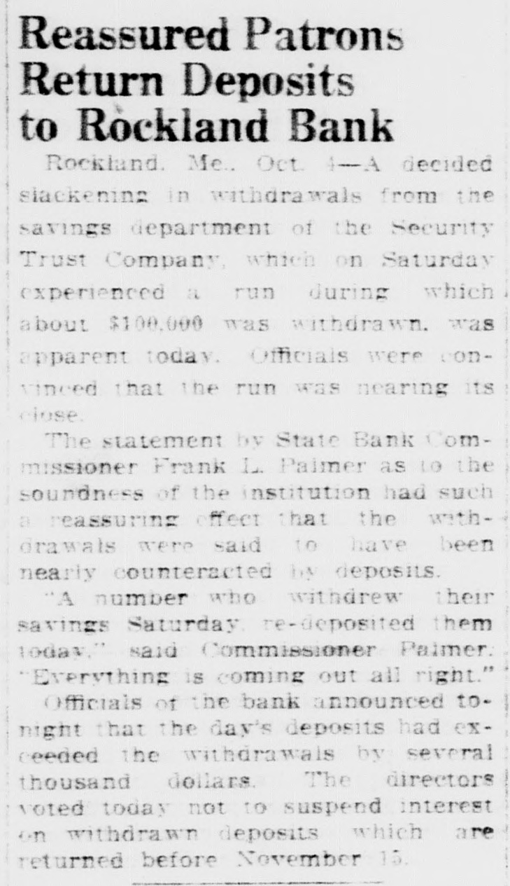 Reassured Patrons Return Deposits to Rockland Bank Rockland. Me.. Oct. 1-A decided slackening in withdrawals from the savings department of the Security Trust Company which on Saturday experienced a run during which about $100.000 was withdrawn. was apparent today. Officials were convinced that the run was nearing its close. The statement by State Bank Commissioner Frank L. Palmer as LO the soundness of the institution had such a reassuring effect that the withdrawals were said to have been nearly counteracted by deposits. "A number who withdrew their savings Saturday re-deposited them today." said Commissioner Palmer: Everything is coming out all right." Officials of the bank announced tonight that the day's deposits had exceeded the withdrawals by several thousand dollars. The directors voted today not to suspend interest on withdrawn deposits which are returned before November 15.