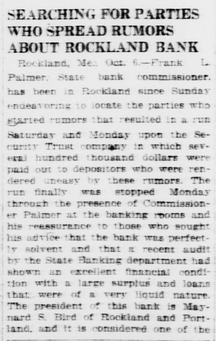 SEARCHING FOR PARTIES WHO SPREAD RUMORS ABOUT ROCKLAND BANK Rockland, Me.: Oct. 6.-Frank L. Palmer, State bank commissioner. has been in Rockland since Sunday endeavoring 10 locate the parties who started rumors that resulted in a run Saturday and Monday upon the Security Trust company in which several hundred thousand dollars were paid out to depositors who were rendered uneasy by these rumors. The run finally was stopped Monday through the presence of Commissioner Palmer at the banking rooms and his reassurance to those who sought his advice that the bank was perfectly solvent and that a recent audit by the State Banking department had shown an excellent financial condition with a large surplus and loans that were of & very liquid nature. The president of this bank is Maynard S. Bird of Rockland and Portland. and it is considered one of the