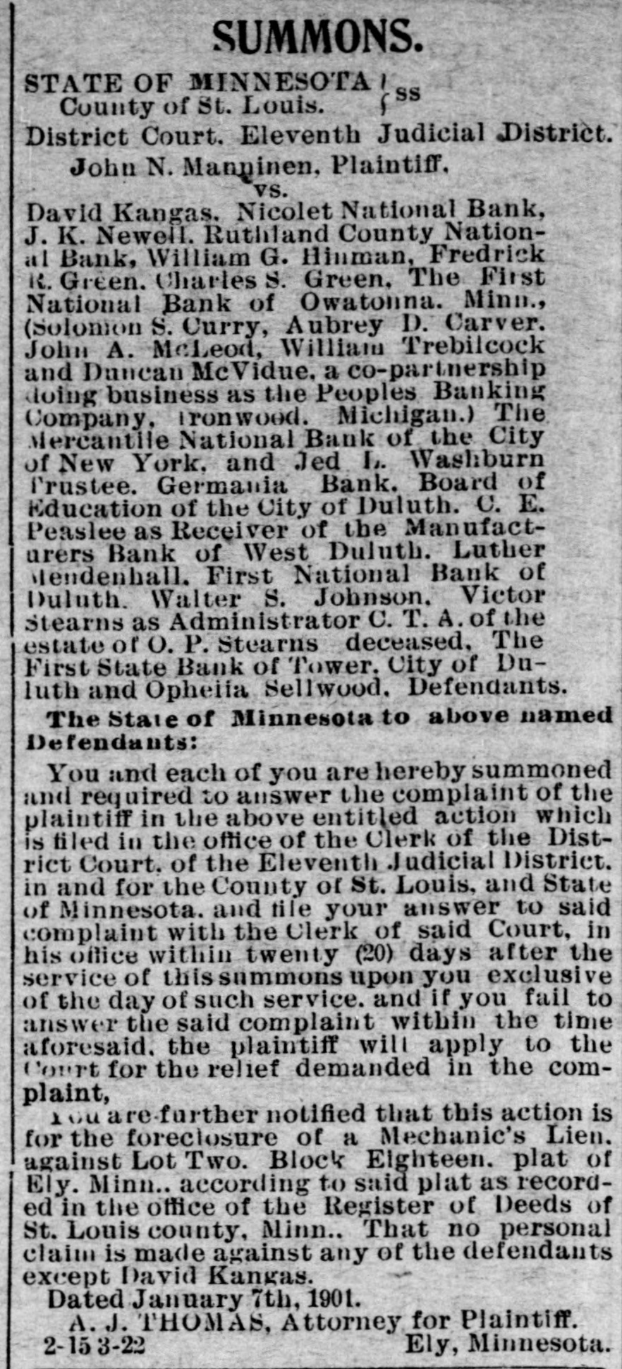 You and each of you are hereby summoned and required to answer the complaint of the plaintiffs in the above entitled action, which is filed in the office of the clerk of the district court of the Eleventh Judicial District in and for the County of St. Louis and State of Minnesota; and to serve a copy of your answer to the said complaint on the subscriber at his office in rooms 500-505 in the Lonsdale building in the City of Duluth in the County of St. Louis and State of Minnesota, within twenty days after service of this summons upon you, exclusive of the day of service, and if you fail to answer said complaint within the time aforesaid, the plaintiffs in this action will apply to the court for the relief demanded in the complaint.