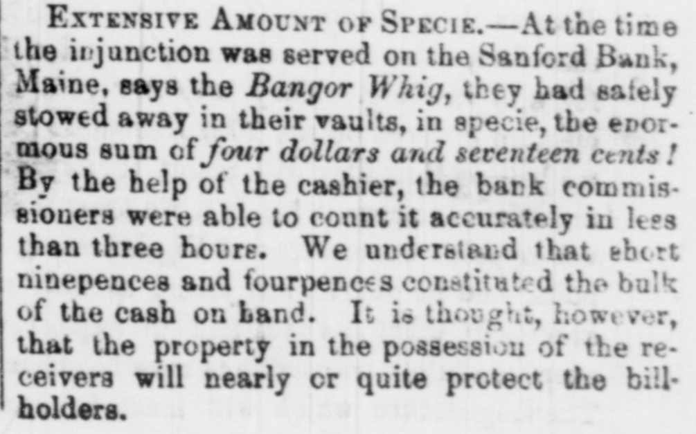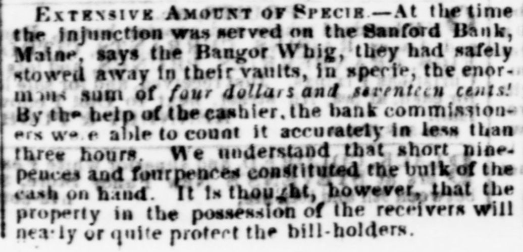 # EXTENSIVE AMOUNT OF SPECIE. At the time the injunction was served on the Sanford Bank, Maine, says the Bangor Whig, they had safely stowed away in their vaults, in specie, the enormous sum of four dollars and seventeen cents! By the help of the cashier, the bank commissioners were able to count it accurately in less than three hours. We understand that short ninepences and fourpences constituted the bulk of the cash on hand. It is thought, however, that the property in the possession of the receivers will nearly or quite protect the bill-holders.