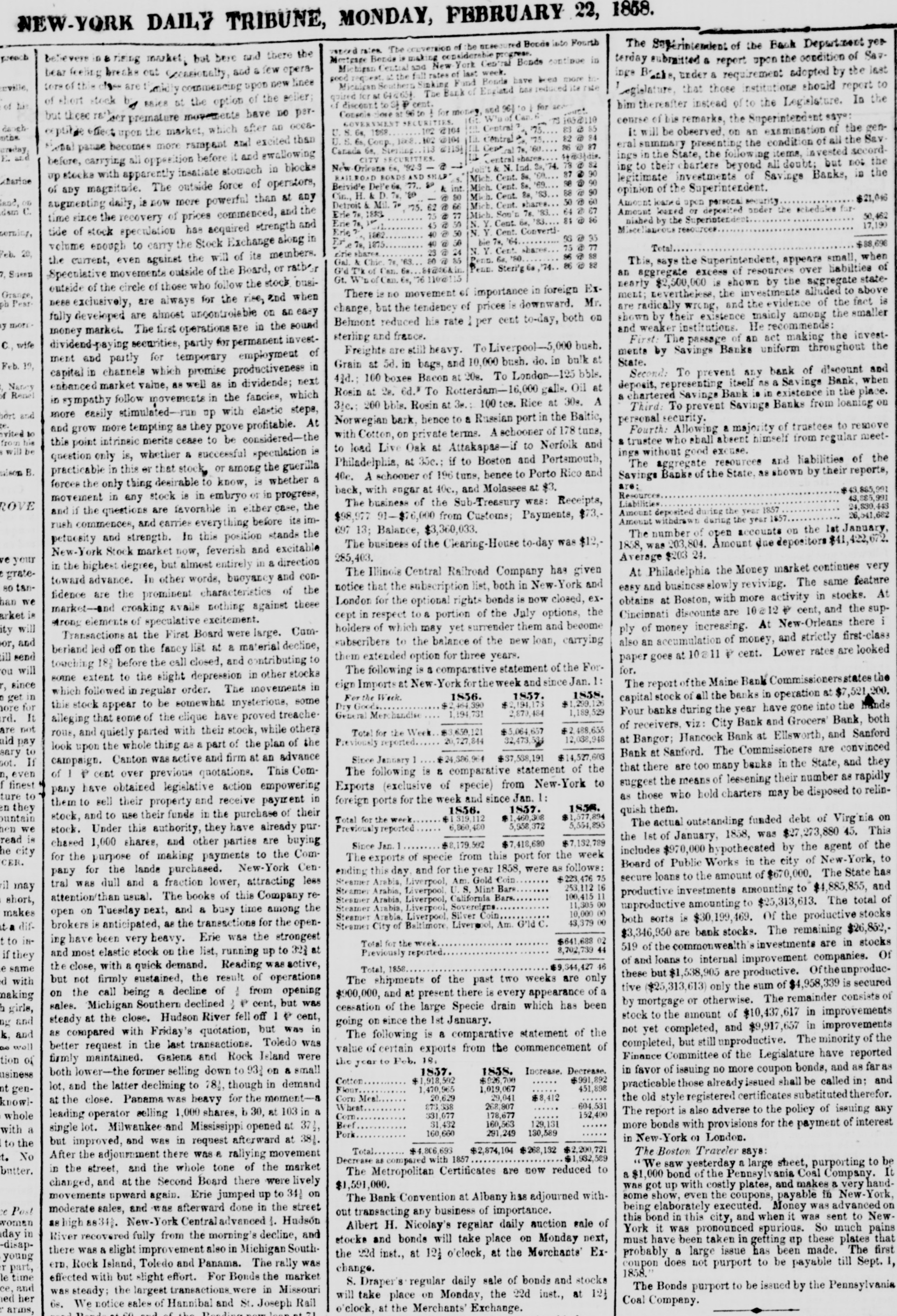 NEW-YORK DAILY TRIBUNE, MONDAY, FEBRUARY 22, 1858. The Superintenment of the Bank Department yea stords The convension of the BCK red Bonds Fourth preech in Mortgage Benda is making considerable progress. believers D & rising market, but bere and there the terday submitted & report upon the condition of SavMichigan Central and New York Central Bonds continue request the fall rates of last week. bear feeling breake out Secreicially, and a few operainge Banks, under a requirement adopted by the last Michigan Southern Sinking Fund Bonds have bee more in eville, of th are midy commencing upon new Knee Legislature, that those institutions should report to quired for (446) The Back of orland 008 reduc its rate of discount cent. of him thereafter instead of to the Legislature. In the of short stock s BRICE at the option of the seller; Councile for money, and 961 to for Can. of W'n Gt. TS 103@110 but these premature movements have DO perSECURITIES. course of his remarks, the Superintendent saye: GOVERNMENT Central inch 85 @ 83 75. @104 102 1858 it will be observed. on an examination of the genplate the upon the market, which after an oceaother 82 @ 84 75 central Coop. 188 102 @104 87 @ 86 eral summary presenting the condition of all the Sav '60 Cent 7s. was pause becomes more rampant and excited than orders, Canada 6s. Sterling 113 @11SA . and ings in the State, the follow ing items, invested secordCentral shares CITY SECURITIES. before, carrying all opposition before it and ewallowing N. Ind. 3s. 74. 78 @ 82 Origane 68, '92.3 ing to their chartere beyond all doubt; but not the 90 87 @ RAILBOAD FONDS AND SHAP Mich. Cent. 8s. '60 upstocks with apparently insatiate stomach in blocks legitimate investments of Savings Backs, in the 90 88 @ Beivid'e Del'e 6's 77.. a Mich. Cent. 8s. '69 int & 90 of any magnitude. The outside force of operators, @ opinion of the Superintendent. Mich Cent. 8s, '83 88 80 Cin., H. & 7w. 80 @ $21,046 60 @ 50 Amount learned upon personal security Detroit & Mil. 7. Mich. Cent. shares 66 augmenting daily, is now more powerful than at any 62 75. C. Amount leased or deposited under the schedules Erie 7s. 1883 Mich. Son's 7s. '83 64 77 @ 75 50,462 86 time since the recovery of prices commenced, and the nished by the Superistendent N. Y. Cent. 68, '83 8: @ 45 50 Erie 7s, 17,190 resources N. Y. Cent. ConvertiErie terming, 40 @ 50 1862 tide of stock epeculation has acquired strength and @ 95 93 bie 7s. '64 50 40 $88,696 1875 75 @ 77 Total volume enough to carry the Stock Exchange along in N. Y. Cent. shares 24 23 citie shares 20, 88 86 85 Penn. 6s. '80 so a Gal. & Chic 7F. '63 the current, even against the will of its members. This, says the Superintendent, appears small, when Penn. Steri'g 86 @ 88 G'd of Can. 6a 84@5kin an aggregate excess of resources over liabilities of Sam Speculative movements outside of the Board, or ratbs Gt. Can. Es, '76 110@115 nearly $2,500,000 is shown by the sggregate stateoutside of the circle of those who follow the stock busiment; Levertheless, the investments alluded to above Grange, There is no movement of importance in foreign ExPear DESS exclusively, are always for the rice, and when are radically wrong, and the evidence of the fact is change, but the tendency of prices is downward. Mr fully developed are almost uncontrolable on & easy shown by their existence maicly among the smaller Behmont reduced his rate 1 per cent to-day, both on hymore and weaker institutions. He recommends: money market. The first operations are in the sound sterling and france. First: The passage of an act making the investC., wife dividend-paying securities, partly for permanent investments by Savings Banks uniform throughout the Freights are still heavy. To Liverpool-5,000 bush. ment and partly for temporary employment of State. Feb.19, Grain at 5d. in bags, and 10,000 bush. do. in bulk at capital in channels which promise productiveness in Second: To prevent any bank of discount and 43d. 100 boxes Bacon at 20s. To London-125 bbls. deposit, representing itself 88 a Savings Bank, when Nancy enhanced market value, as well as in dividende; next Rosin at 28. 6d.' To Rotterdam-16,000 galls. Oil at of Renel a chartered Savings Bank is in existence in the place. in sympathy follow movements in the fancies, which 31c. 200 bbls. Rosin at 100 tes. Rice at 30s. A Third: To prevent Savings Banks from loaning on hort and more easily stimulated-run up with elastic steps, personal security. Norwegian bark hence to a Russian port in the Baltic, and grow more tempting as they prove profitable. At Fourth: Allowing a majority of trustees to remove vited to with Cotton, on private terms. A schooner of 178 tuns, trustee who shall absent himself from regular meetfrom his this point intrinsic merits cease to be considered-the be to load Live Oak at Attakapas-if to Norfolk and ings without good excuse. question only is, whether a successful peculation is The aggregate resources and liabilities of the Philadelphia, at 35c.: if to Boston and Portsmouth, mison B. practicable in this or that stock or among the guerilla Savings Banks of the State, as shown by their reports, 40e. A schooner of tuns, bence to Porto Rico and a are: forces the only thing desirable to know, is whether $43,885,991 back, with engar at 40e., and Molasses at $3. Resources 43,885,991 movement in any stock is in embryo or in progress, Liabilities 24,830,448 The business of the Sub-Treasury was: Receipts, ROVE Amount deposited during the year 1857 and if the questions are favorable in either case, the 26,541,682 $98,977 91-$76,000 from Customs; Payments, $73, Amount withdrawn during the year 1857 rush commences, and carries everything before its im697 13; Balance, $3,360,033. The number of open accounts on the 1st January, petuosity and strength. In this position stands the 1858, was 203,804. Amount due depositors $41,422,672. The business of the Clearing-House to-day was $12,New-York Stock market now, feverish and excitable 