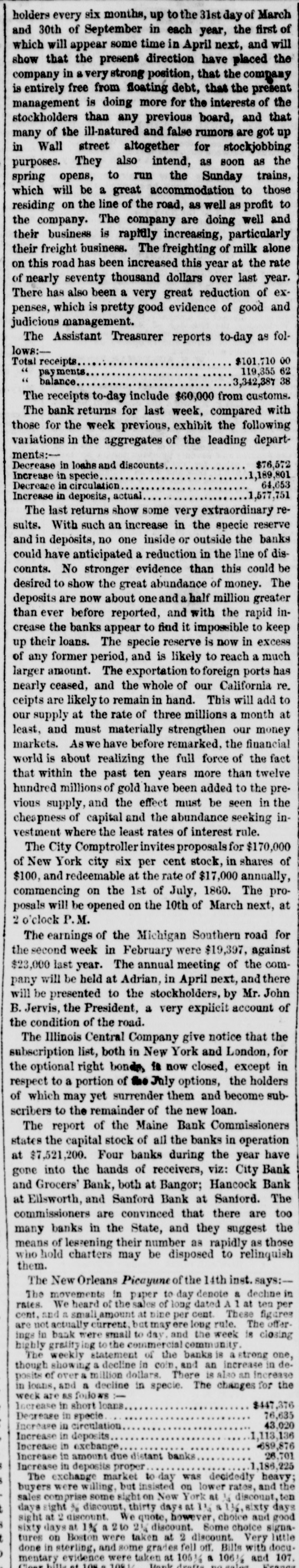 holders every six months, up to the 31st day of March and 30th of September in each year, the first of which will appear some time in April next, and will show that the present direction have placed the company in a very strong position, that the company is entirely free from floating debt, that the present management is doing more for the interests of the stockholders than any previous board, and that many of the ill-natured and false rumors are got up in Wall street altogether for stockjobbing purposes. They also intend, as soon as the spring opens, to run the Sunday trains, which will be a great accommodation to those residing on the line of the road, as well as profit to the company. The company are doing well and their business is rapidly increasing, particularly their freight business. The freighting of milk alone on this road has been increased this year at the rate of nearly seventy thousand dollars over last year. There has also been a very great reduction of expenses, which is pretty good evidence of good and judicious management. The Assistant Treasurer reports to-day as follows:$101.710 00 Total receipts 119,355 62 " payments " balance 3,342,387 38 The receipts to-day include $60,000 from customs. The bank returns for last week, compared with those for the week previous, exhibit the following variations in the aggregates of the leading departments:-Decrease in loans and discounts $76,572 1,189,801 Increase in specie 64,653 Decrease in circulation 1,577,751 Increase in deposits, actual The last returns show some very extraordinary results. With such an increase in the specie reserve and in deposits, no one inside or outside the banks could have anticipated a reduction in the line of discounts. No stronger evidence than this could be desired to show the great abundance of money. The deposits are now about oneand a half million greater than ever before reported, and with the rapid increase the banks appear to find it impossible to keep up their loans. The specie reserve is now in excess of any former period, and is likely to reach a much larger amount. The exportation to foreign ports has nearly ceased, and the whole of our California re. ceipts are likely to remain in hand. This will add to our supply at the rate of three millions a month at least, and must materially strengthen our money markets. As we have before remarked, the financial world is about realizing the full force of the fact that within the past ten years more than twelve hundred millions of gold have been added to the previous supply, and the effect must be seen in the cheapness of capital and the abundance seeking investment where the least rates of interest rule. The City Comptroller invites proposals for $170,000 of New York city six per cent stock, in shares of $100, and redeemable at the rate of $17,000 annually, commencing on the 1st of July, 1860. The proposals will be opened on the 10th of March next, at 2 o'clock P.M. The earnings of the Michigan Southern road for the second week in February were $19,397, against $23,000 last year. The annual meeting of the company will be held at Adrian, in April next, and there will be presented to the stockholders, by Mr. John B. Jervis, the President, a very explicit account of the condition of the road. The Illinois Central Company give notice that the subscription list, both in New York and London, for the optional right bonds, is now closed, except in respect to a portion of the July options, the holders of which may yet surrender them and become subscribers to the remainder of the new loan. The report of the Maine Bank Commissioners states the capital stock of all the banks in operation at $7,521,200. Four banks during the year have gone into the hands of receivers, viz: City Bank and Grocers' Bank, both at Bangor; Hancock Bank at Ellsworth, and Sanford Bank at Sanford. The commissioners are convinced that there are too many banks in the State, and they suggest the means of lessening their number as rapidly as those who hold charters may be disposed to relinquish them. The New Orleans Picayune of the 14th inst. says:The movements in paper to day denote a decline in rates. We heard of the sales of long dated A 1 at ten per cent. and a small amount at nine per cent. These figures are not actually current, but may ere long rule. The offerings in bank were small to day. and the week is closing highly gratity log to the commercial community. The weekly statement of the banks is a strong one, though showing a decline in coin, and an increase in deposits of over & million dollars. There is also an increase in loans, and a decline in specie. The changes for the week are as follows :Increase in short loans $447,376 76,635 Decrease in specie 43,020 Increase in circulation 1,113,136 Increase in deposits -689,876 Increase in exchange 26,701 Increase in amount due distant banks 1,186,225 Increase in deposits proper The exchange market to day was decidedly heavy; buyers were willing, but insisted on lower rates, and the sales comprise some sight on New York at M discount, ten days sight % discount, thirty days at 1½ & sixty days sight at 2 discount. We quote, however, choice and good sixty days at 1% a 2to 2½ discount. Some choice signatures on Boston were taken at 2 discount. Very little done in sterling, and some grades fell off. Bills with documentary evidence were taken at 105% a 106% and 107. Closs et 108 a 1081
