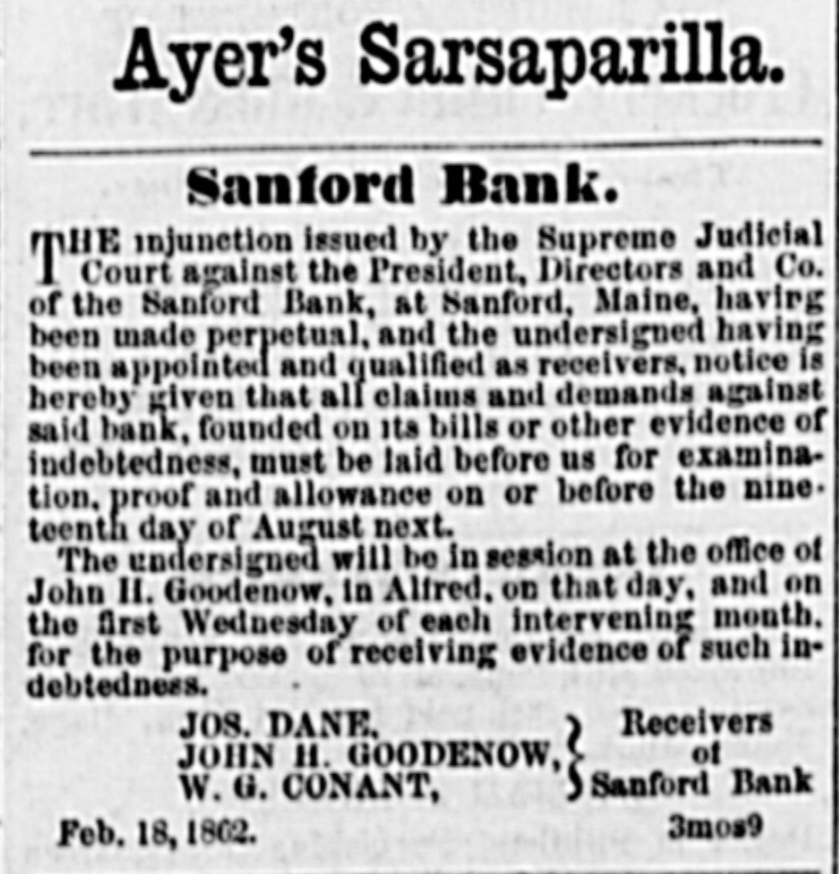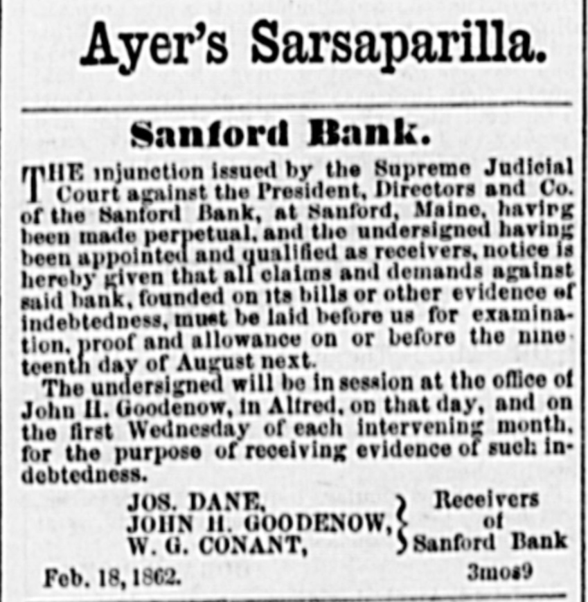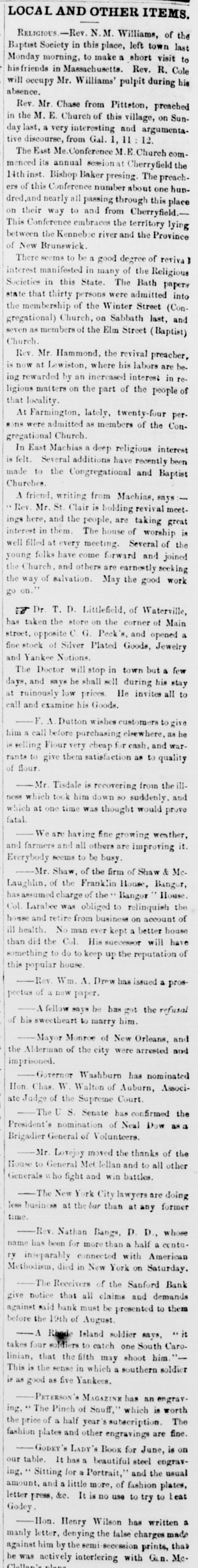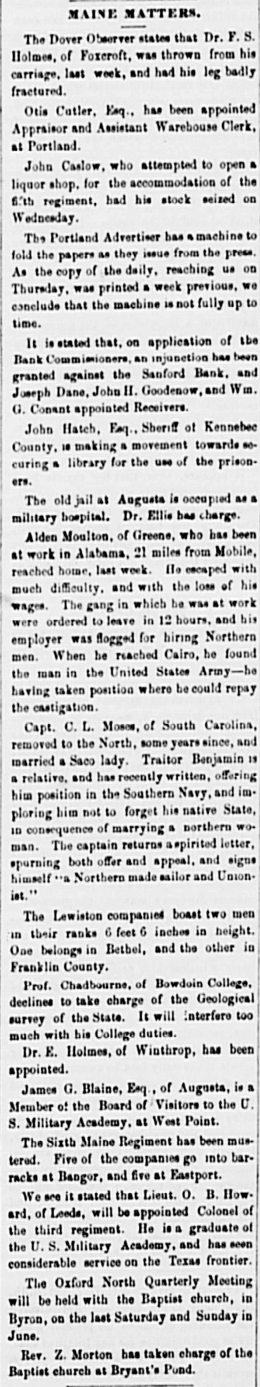 MAINE MATTERS. The Dover Observer states that Dr.F.S. Holmes, of Foxcroft, was thrown from his carriage. last week, and had his leg badly fractured. Otis Cutler. Esq., has been appointed Appraisor and Assistant Warehouse Clerk, at Portland. John Caslow, who attempted to open liquor shop. for the accommodation of the fifth regiment. had his stock seized on Wednesday. The Portland Advertiser has . machine to fold the papers as they issue from the press. As the copy of the daily, reaching us on Thursday. was printed a week previous. we conclude that the machine is not fully up to time. It is stated that, on application of the Bank Commissioners an injunction has been granted against the Sanford Bank. and Joseph Dane. John H. Goodenow, and Wm. G. Conant appointed Receivers. John Hatch, Esq., Sheriff of Kennebec County. 10 making a movement towards securing a library for the use of the prisoners. The old jail at Augusta is occupied as a military hospital. Dr. Ellie has charge. Alden Moulton, of Greene, who has been at work in Alabama, 21 miles from Mobile, reached home. last week. He escaped with much difficulty. and with the loss of his wages. The gang in which be was at work were ordered to leave in 12 hours. and his employer was flogged for hiring Northern men. When he reached Cairo, he found the man in the United States Army-he having taken position where be could repay the eastigation. Capt. C. L. Moses, of South Carolina, removed to the North, some years since, and married a Saco lady. Traitor Benjamin 19 a relative. and has recently written, offering him position in the Southern Navy, and im. ploring him not to forget his native State, in consequence of marrying a northern woman. The captain returns aspirited letter, spurning both offer and appeal. and signs himself Northern made sailor and Union. ist." The Lewiston companies boast two men in their ranks 6 feet 6 inches in height. One belongs in Bethel, and the other in Franklin County. Prof. Chadbourne, of Bowdoin College, deelines to take charge of the Geological survey of the State. It will interfere too much with his College duties. Dr.E. Holmes, of Winthrop, has been appointed. James G. Blaine, Esq., of Augusta, is a Member of the Board of Visitors to the U. S. Military Academy. at West Point. The Sixth Maine Regiment has been mustered. Five of the companies go into barracks at Bangor. and five at Eastport. We see it stated that Lieut. O. B. How. ard, of Leeds, will be appointed Colonel of the third regiment. He is a graduate of the U.S. Military Academy. and has seen considerable service on the Texas frontier. The Oxford North Quarterly Meeting will be held with the Baptist church, in Byron, on the last Saturday and Sunday in June. Rev. Z. Morton has taken charge of the Baptist church at Bryant's Pond.