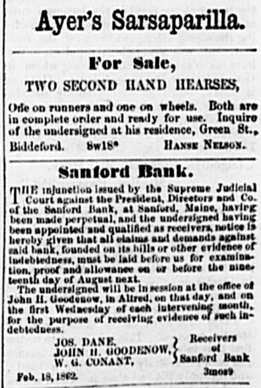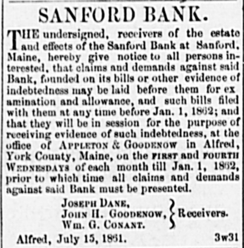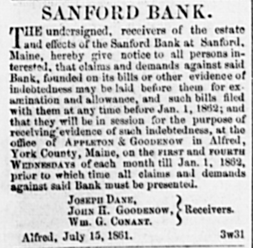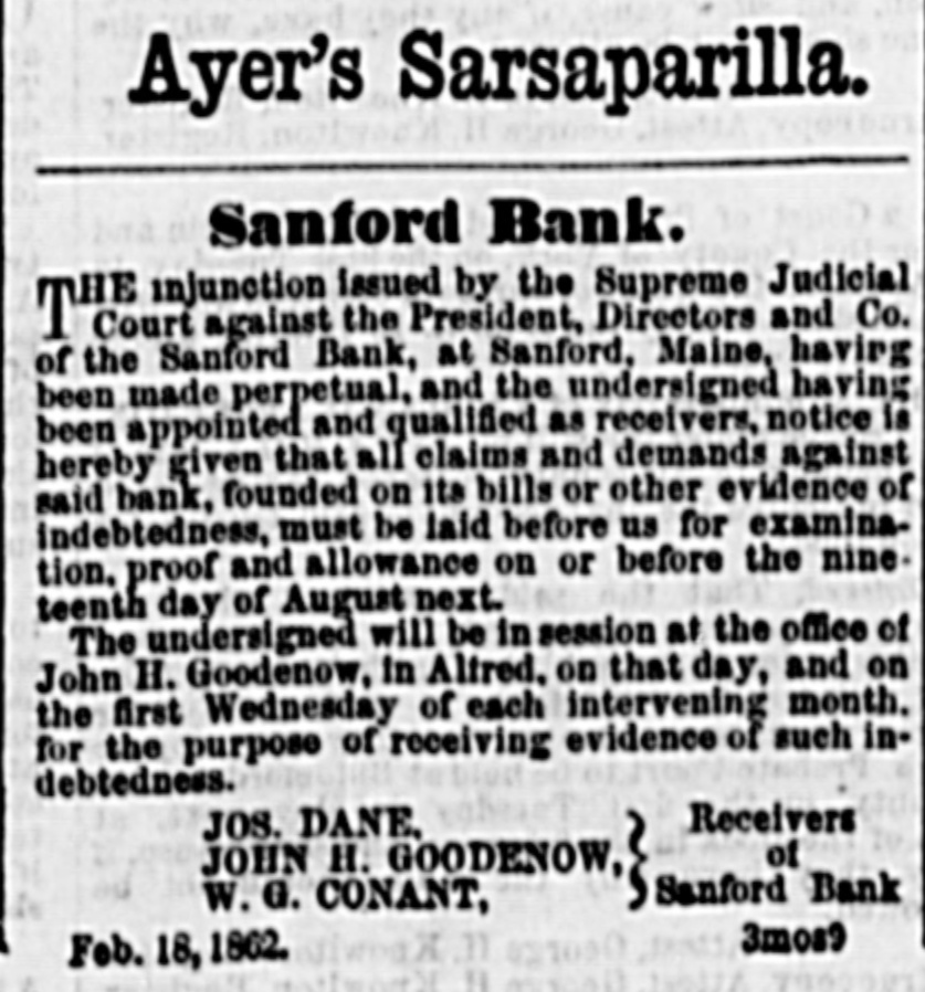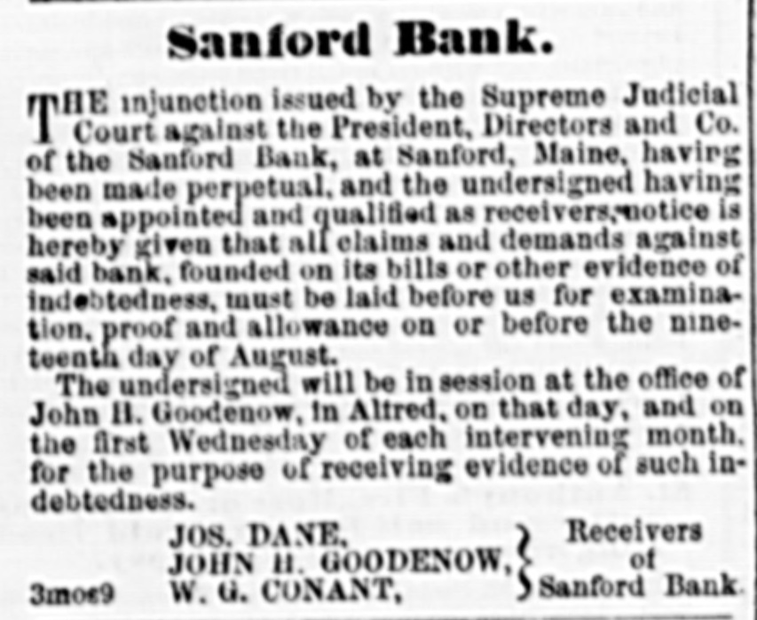 MAINE MATTERS. The Dover Observer states that Dr.F.S. Holmes, of Foxcroft, was thrown from his carriage. last week, and had his leg badly fractured. Otis Cutler. Esq., has been appointed Appraisor and Assistant Warehouse Clerk, at Portland. John Caslow, who attempted to open liquor shop. for the accommodation of the fifth regiment. had his stock seized on Wednesday. The Portland Advertiser has . machine to fold the papers as they issue from the press. As the copy of the daily, reaching us on Thursday. was printed a week previous. we conclude that the machine is not fully up to time. It is stated that, on application of the Bank Commissioners an injunction has been granted against the Sanford Bank. and Joseph Dane. John H. Goodenow, and Wm. G. Conant appointed Receivers. John Hatch, Esq., Sheriff of Kennebec County. 10 making a movement towards securing a library for the use of the prisoners. The old jail at Augusta is occupied as a military hospital. Dr. Ellie has charge. Alden Moulton, of Greene, who has been at work in Alabama, 21 miles from Mobile, reached home. last week. He escaped with much difficulty. and with the loss of his wages. The gang in which be was at work were ordered to leave in 12 hours. and his employer was flogged for hiring Northern men. When he reached Cairo, he found the man in the United States Army-he having taken position where be could repay the eastigation. Capt. C. L. Moses, of South Carolina, removed to the North, some years since, and married a Saco lady. Traitor Benjamin 19 a relative. and has recently written, offering him position in the Southern Navy, and im. ploring him not to forget his native State, in consequence of marrying a northern woman. The captain returns aspirited letter, spurning both offer and appeal. and signs himself Northern made sailor and Union. ist." The Lewiston companies boast two men in their ranks 6 feet 6 inches in height. One belongs in Bethel, and the other in Franklin County. Prof. Chadbourne, of Bowdoin College, deelines to take charge of the Geological survey of the State. It will interfere too much with his College duties. Dr.E. Holmes, of Winthrop, has been appointed. James G. Blaine, Esq., of Augusta, is a Member of the Board of Visitors to the U. S. Military Academy. at West Point. The Sixth Maine Regiment has been mustered. Five of the companies go into barracks at Bangor. and five at Eastport. We see it stated that Lieut. O. B. How. ard, of Leeds, will be appointed Colonel of the third regiment. He is a graduate of the U.S. Military Academy. and has seen considerable service on the Texas frontier. The Oxford North Quarterly Meeting will be held with the Baptist church, in Byron, on the last Saturday and Sunday in June. Rev. Z. Morton has taken charge of the Baptist church at Bryant's Pond.