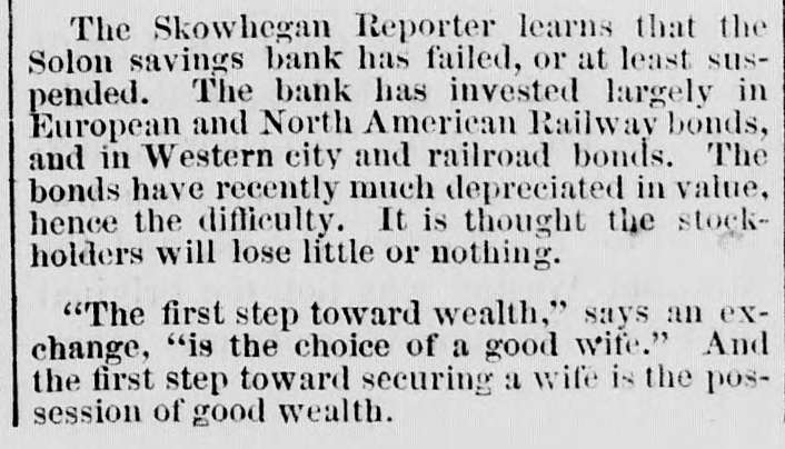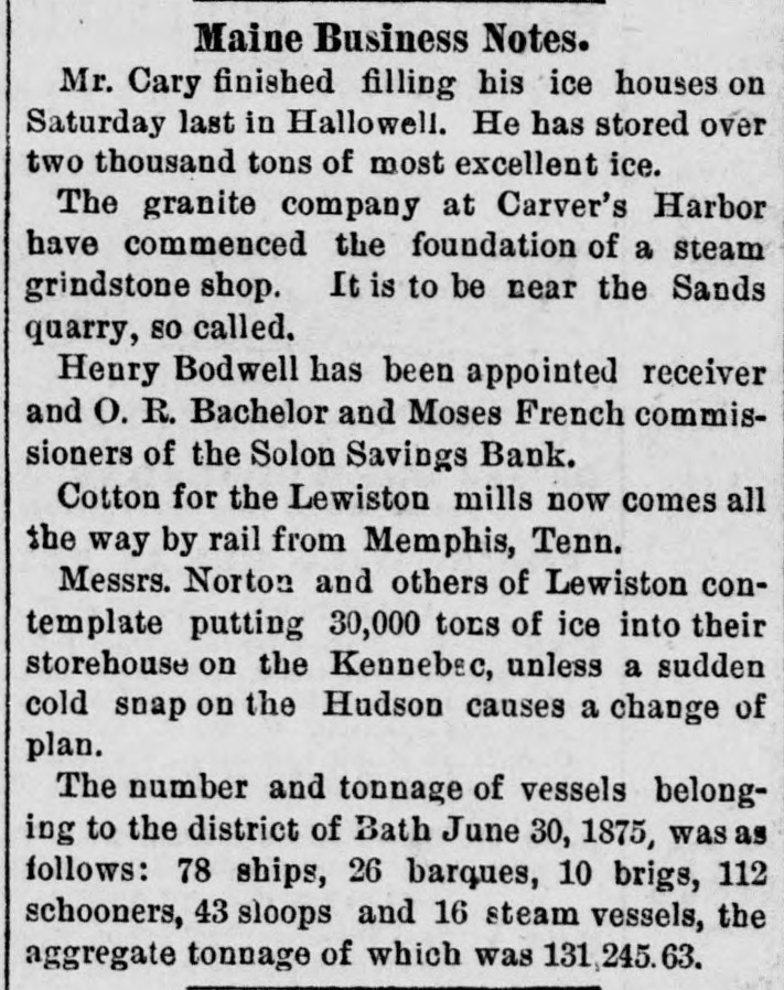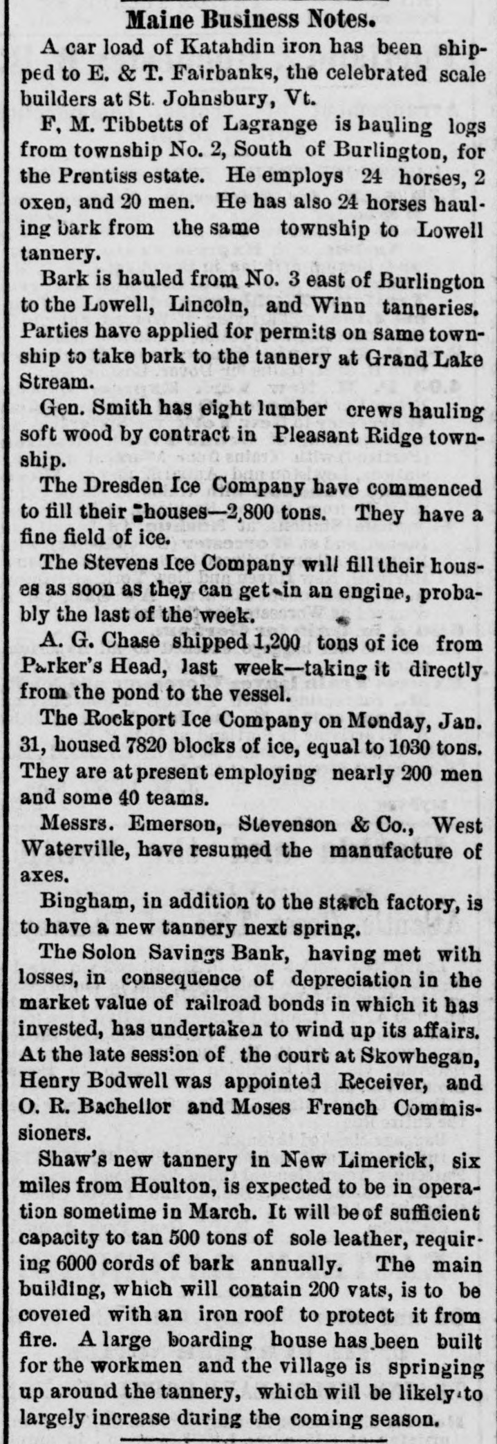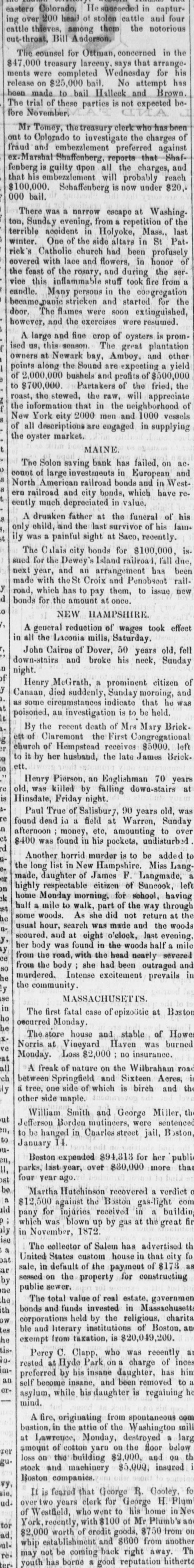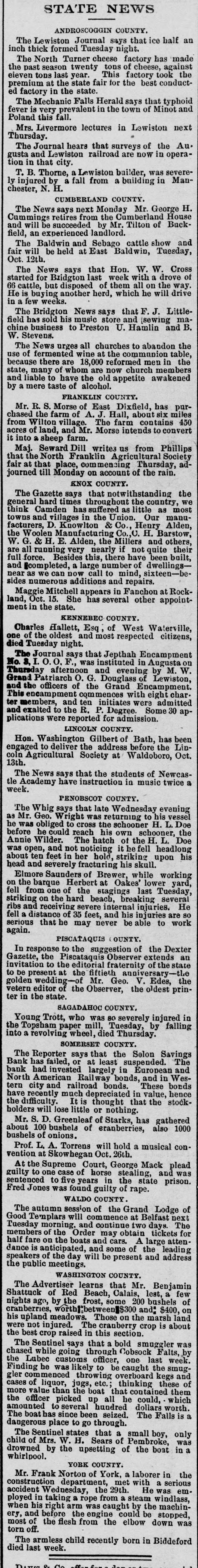 # STATE NEWS ANDROSCOGGIN COUNTY. The Lewiston Journal says that ice half an inch thick formed Tuesday night. The North Turner cheese factory has made the past season twenty tons of cheese, against eleven tons last year. This factory took the premium at the state fair for the best conducted factory in the state. The Mechanic Falls Herald says that typhoid fever is very prevalent in the town of Minot and Poland this fall. Mrs. Livermore lectures in Lewiston next Thursday. The Journal hears that surveys of the Augusta and Lewiston railroad are now in operation in that city. T. B. Thorne, a Lewiston builder, was severely injured by a fall from a building in Manchester, N. H. CUMBERLAND COUNTY. The News says next Monday Mr. George H. Cummings retires from the Cumberland House and will be succeeded by Mr. Tilton of Buckfield, an experienced landlord. The Baldwin and Sebago cattle show and fair will be held at East Baldwin, Tuesday, Oct. 12th. The News says that Hon. W. W. Cross started for Bridgton last week with a drove of 66 cattle, but disposed of them all on the way. He is buying another herd, which he will drive in a few weeks. The Bridgton News says that F. J. Littlefield has sold his music store and sewing machine business to Preston U. Hamlin and B. W. Stevens. The News urges all churches to abandon the use of fermented wine at the communion table, because there are 18,000 reformed men in the state, many of whom are now church members and liable to have the old appetite awakened by a mere taste of alcohol. FRANKLIN COUNTY. Mr. R. S. Morse of East Dixfield, has purchased the farm of A. J. Hall, about six miles from Wilton village. The farm contains 450 acres of land, and Mr. Morse intends to convert it into a sheep farm. Maj. Seward Dill writes us from Phillips that the North Franklin Agricultural Society fair at that place, commencing Thursday, adjourned till Monday on account of the rain. KNOX COUNTY. The Gazette says that notwithstanding the general hard times throughout the country, we think Camden has suffered as little as most towns and villages in the Union. Our manufacturers, D. Knowlton & Co., Henry Alden, the Woolen Manufacturing Co., C. H. Barstow, W. G. & H. E. Alden, the Millers and others, are all running very nearly if not quite their full force. Besides this, there have been built, and completed, a large number of dwellings-near as we can now call to mind, sixteen-besides numerous additions and repairs. Maggie Mitchell appears in Fanchon at Rockland, Oct. 15. She has several other appointment in the state. KENNEBEC COUNTY. Charles Hallett, Esq, of West Waterville, one of the oldest and most respected citizens, died Tuesday night. The Journal says that Jepthah Encampment No. 8, I. O. O, F., was instituted in Augusta on Thursday afternoon and evening by M. W. Grand Patriarch O. G. Douglass of Lewiston, and the officers of the Grand Encampment. This encampment commences with eight charter members, and ten initiates were admitted and exalted to the R. P. Degree. Some 30 applications were reported for admission. LINCOLN COUNTY. Hon. Washington Gilbert of Bath, has been engaged to deliver the address before the Lincoln Agricultural Society at Waldoboro, Oct. 13th. The News says that the students of Newcastle Academy have instruction in music twice a week. PENOBSCOT COUNTY. The Whig says that late Wednesday evening as Mr. Geo. Wright was returning to his vessel he was obliged to cross the schooner H. L. Doe before he could reach his own schooner, the Annie Wilder. The hatch of the H. L. Doe was open, and not noticing it he fell headlong about ten feet in her hold, striking upon his head and severely fracturing his skull. Elmore Saunders of Brewer, while working on the barque Herbert at Oakes' lower yard, fell from one of the stagings last Tuesday, striking on the hard beach, breaking several ribs and receiving severe internal injuries. He fell a distance of 35 feet, and his injuries are so serious that he may never be able to work again. PISCATAQUIS COUNTY. In response to the suggestion of the Dexter Gazette, the Piscataquis Observer extends an invitation to the editorial fraternity of the state to be present at the fiftieth anniversary-the golden wedding-of Mr. Geo. V. Edes, the vetern editor of the Observer, the oldest printer in the state. SAGADAHOC COUNTY. Young Trott, who was so severely injured in the Topsham paper mill, Tuesday, by falling into a revolving wheel, died Thursday. SOMERSET COUNTY. The Reporter says that the Selon Savings Bank has failed, or at least suspended. The bank had invested largely in European and North American Railway bonds, and in Western city and railroad bonds. These bonds have recently much depreciated in value, hence the difficulty. It is thought that the stockholders will lose little or nothing. Mr. S. D. Greenleaf of Starks, has gathered about 100 bushels of eranberries, also 1000 bushels of onions. Prof. L. A. Torrens will hold a musical convention at Skowhegan Oct. 26th. At the Supreme Court, George Mack plead guilty to one case of horse stealing, and was sentenced to five years in the state prison. Fred Jones was found guilty of rape. WALDO COUNTY. The autumn session of the Grand Lodge of Good Templars will commence at Belfast next Tuesday morning, and continue two days. The members of the Order may obtain tickets for half fare on the boats and cars. A large attendance is anticipated, and some of the leading speakers of the day will be present and address the public meetings. WASHINGTON COUNTY. The Advertiser learns that Mr. Benjamin Shattuck of Red Beach, Calais, lest, a few nights ago, by the frost, some 200 bushels of cranberries, worth between $300 and $400, on his upland meadows. Those on the marsh land were not injured. The cranberry crop is about the best crop raised in this section. The Sentinel says that a bold smuggler was chased while going through Cobsock Falts, by the Lubec customs officer, one last week. Finding he was lik