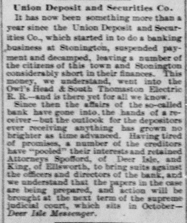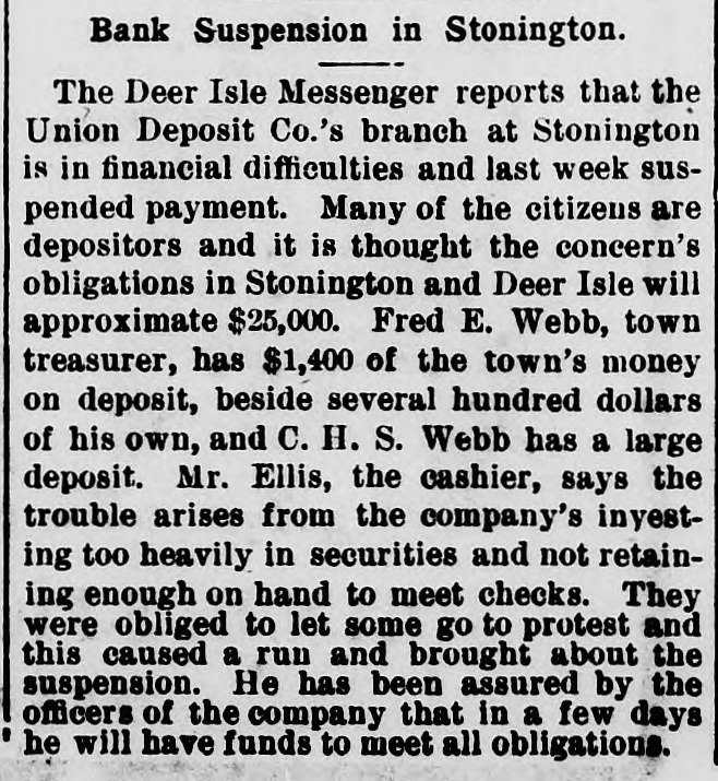 Bank Suspension in Stonington. The Deer Isle Messenger reports that the Union Deposit Co.'s branch at Stonington is in financial difficulties and last week suspended payment. Many of the citizens are depositors and it is thought the concern's obligations in Stonington and Deer Isle will approximate $25,000. Fred E. Webb, town treasurer, has $1,400 of the town's money on deposit, beside several hundred dollars of his own, and C. H. S. Webb has a large deposit. Mr. Ellis, the cashier, says the trouble arises from the company's inyesting too heavily in securities and not retaining enough on hand to meet checks. They were obliged to let some go to protest and this caused a run and brought about the suspension. He has been assured by the officers of the company that in a few days he will have funds to meet all obligations.