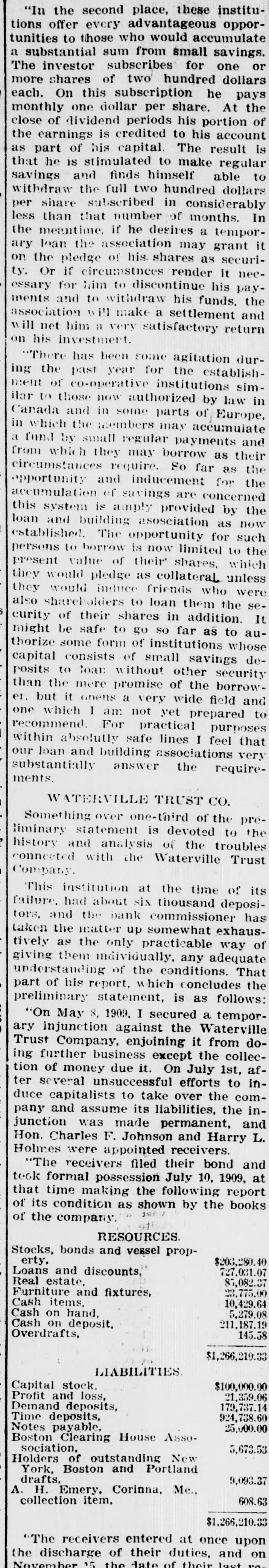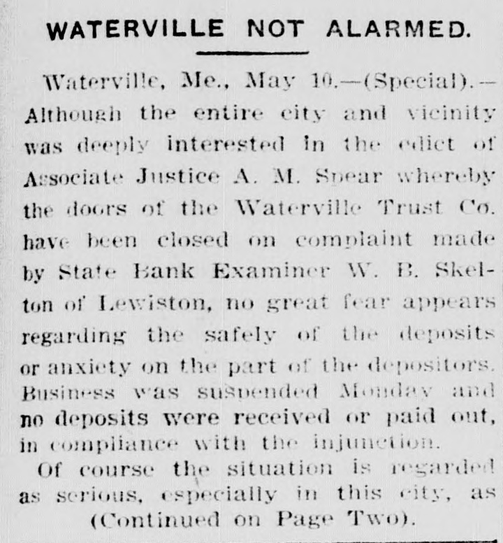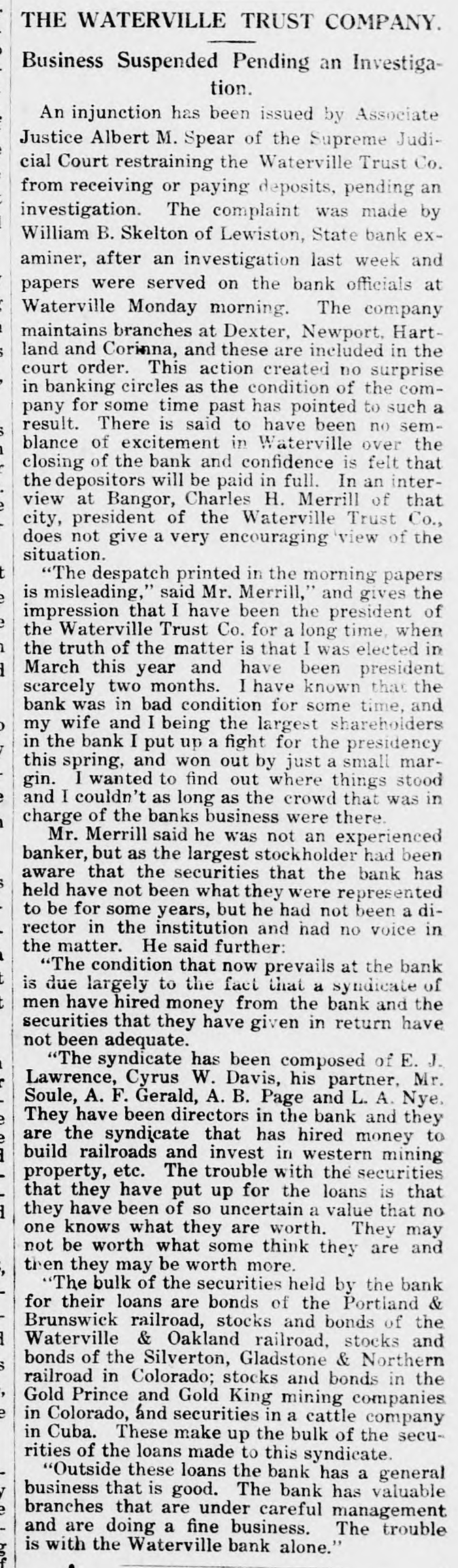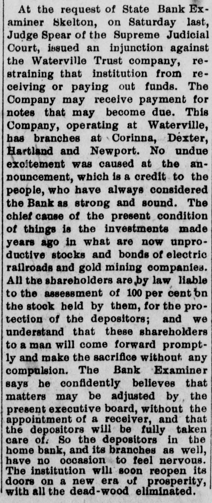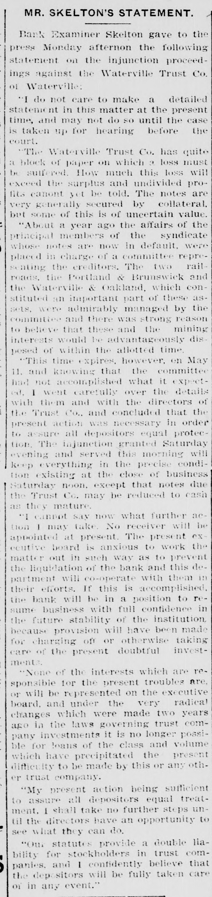 MR. SKELTON'S STATEMENT. Bank Examiner Skelton gave to the press Monday afternon the following statement on the injunction proceedings against the Waterville Trust Co. of Waterville: "I do not care to make a detailed statemer in this matter at the present time, and may not do so until the case is taken up for hearing before the court. "The Waterville Trust Co. has quite a block of paper on which a loss must be suffered. How much this loss will exceed the surplus and undivided profits canont yet be told. The notes are very generally secured by collateral. but some of this is of uncertain value. "About a year ago the affairs of the principal members of the syndicate whose notes are now in default. were placed in charge of a committee representing the creditors. The two railroads, the Portland & Brunswick and the Waterville & Oakland, which constituted an important part of these assets, were admirably managed by the committee and there was strong reason to believe that these and the mining interests would be advantageously disposed of within the allotted time. "This time expires, however, on May 11. and knowing that the committee had not accomplished what it expected, I went carefully over the details with them and with the directors of the Trust Co., and concluded that the present action was necessary in order to assure all depositors equal protection. The injunction granted Saturday evening and served this morning will keep everything in the precise condition existing at the close of business Saturday noon, except that notes due the Trust Co. may be reduced to cash as they mature. "I cannot say now what further action I may take. No receiver will be appointed at present. The present executive board is anxious to work the matter out in such way as to prevent the liquidation of the bank and this department will co-operate with them in their efforts. If this is accomplished, the bank will be in a position to resume business with full confidence in the future stability of the institution, because provision will have been made for charging off or otherwise taking care of the present doubtful investments. "None of the interests which are responsible for the present troubles are, or will be represented on the executive board. and under the very radical changes which were made two years ago in the laws governing trust company investments it is no longer possible for loans of the class and volume which have precipitated the present difficulty to be made by this or any other trust company.
