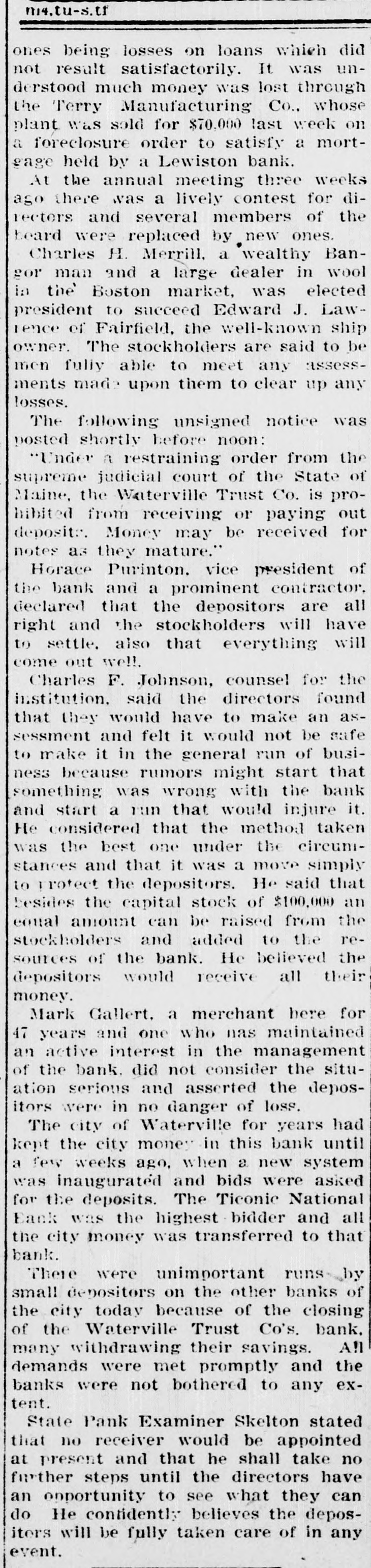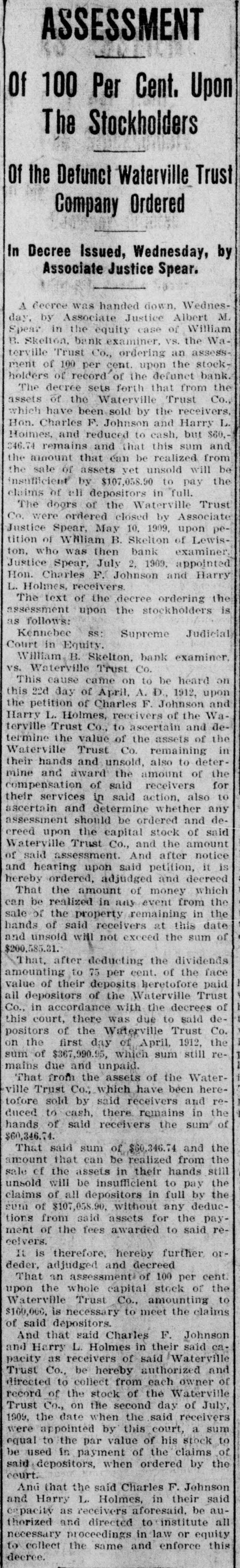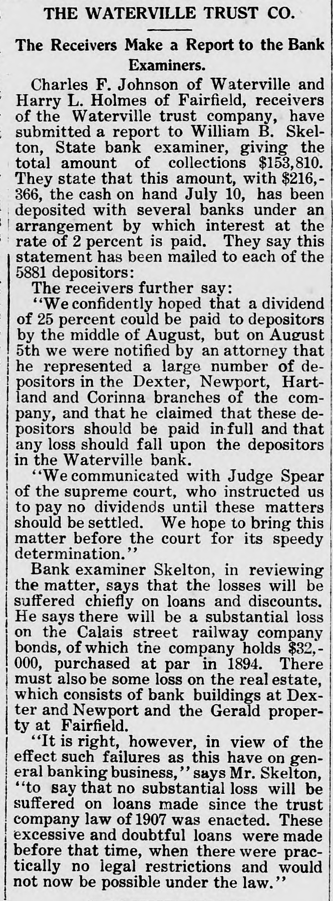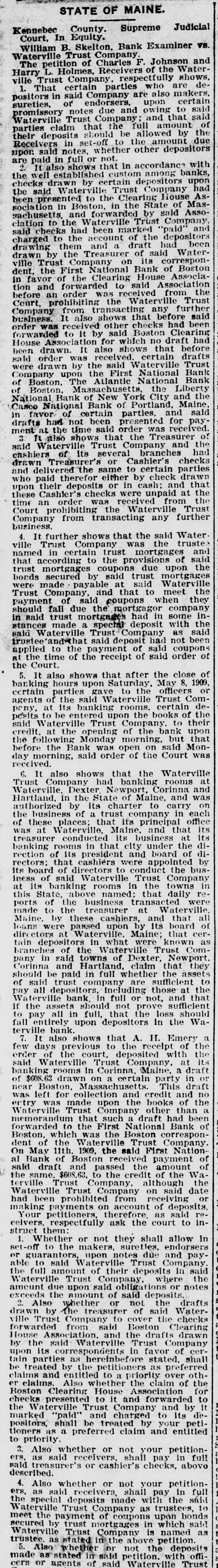 MR. SKELTON'S STATEMENT. Bank Examiner Skelton gave to the press Monday afternon the following statement on the injunction proceedings against the Waterville Trust Co. of Waterville: "I do not care to make a detailed statemer in this matter at the present time, and may not do so until the case is taken up for hearing before the court. "The Waterville Trust Co. has quite a block of paper on which a loss must be suffered. How much this loss will exceed the surplus and undivided profits canont yet be told. The notes are very generally secured by collateral. but some of this is of uncertain value. "About a year ago the affairs of the principal members of the syndicate whose notes are now in default. were placed in charge of a committee representing the creditors. The two railroads, the Portland & Brunswick and the Waterville & Oakland, which constituted an important part of these assets, were admirably managed by the committee and there was strong reason to believe that these and the mining interests would be advantageously disposed of within the allotted time. "This time expires, however, on May 11. and knowing that the committee had not accomplished what it expected, I went carefully over the details with them and with the directors of the Trust Co., and concluded that the present action was necessary in order to assure all depositors equal protection. The injunction granted Saturday evening and served this morning will keep everything in the precise condition existing at the close of business Saturday noon, except that notes due the Trust Co. may be reduced to cash as they mature. "I cannot say now what further action I may take. No receiver will be appointed at present. The present executive board is anxious to work the matter out in such way as to prevent the liquidation of the bank and this department will co-operate with them in their efforts. If this is accomplished, the bank will be in a position to resume business with full confidence in the future stability of the institution, because provision will have been made for charging off or otherwise taking care of the present doubtful investments. "None of the interests which are responsible for the present troubles are, or will be represented on the executive board. and under the very radical changes which were made two years ago in the laws governing trust company investments it is no longer possible for loans of the class and volume which have precipitated the present difficulty to be made by this or any other trust company.