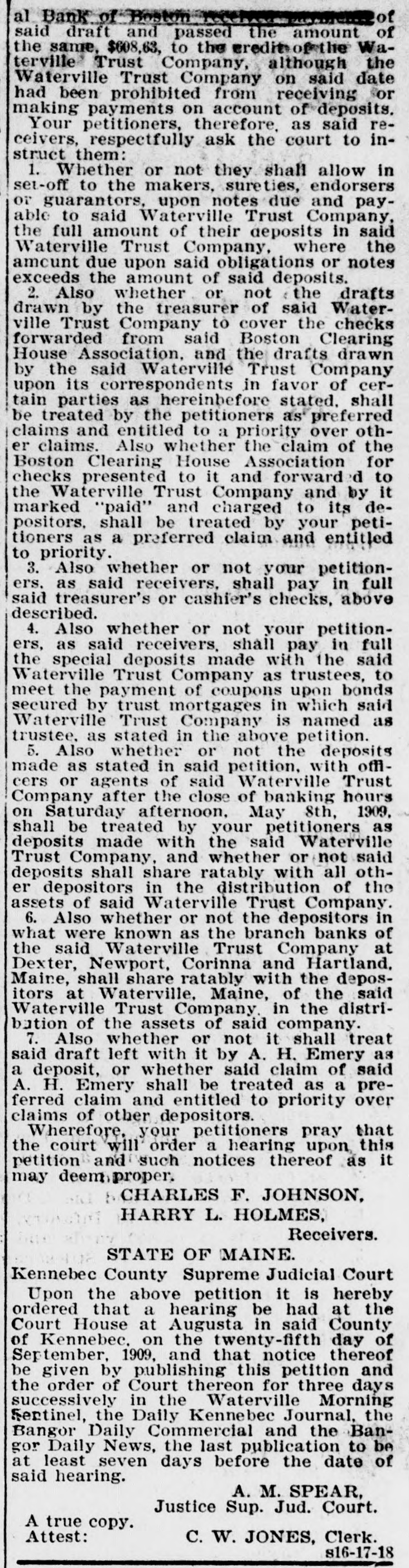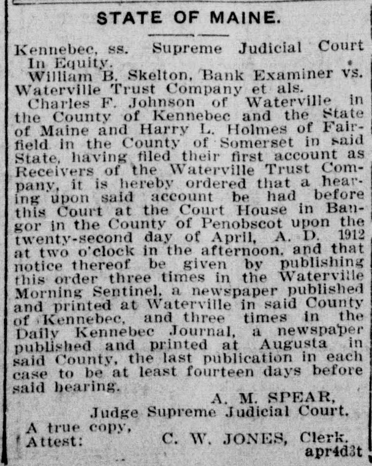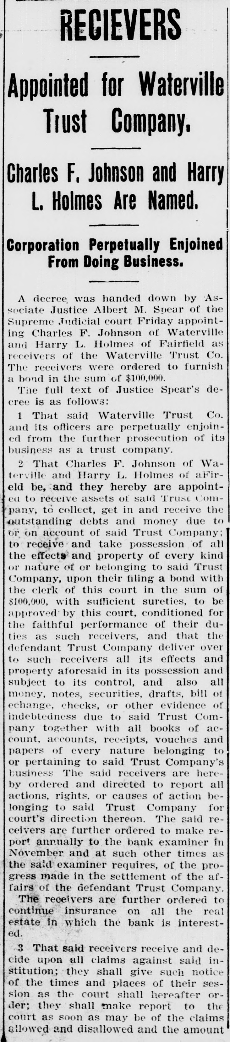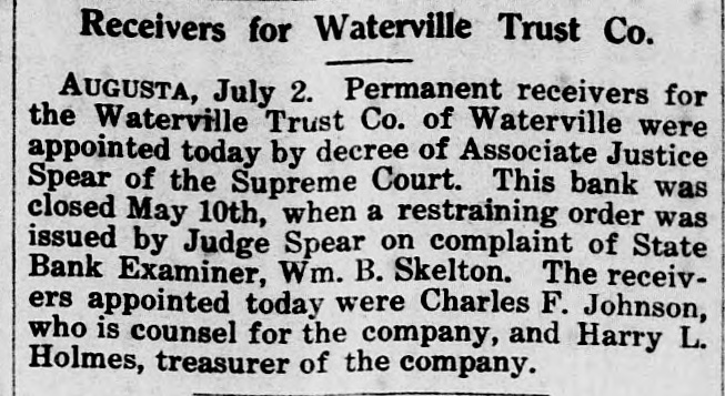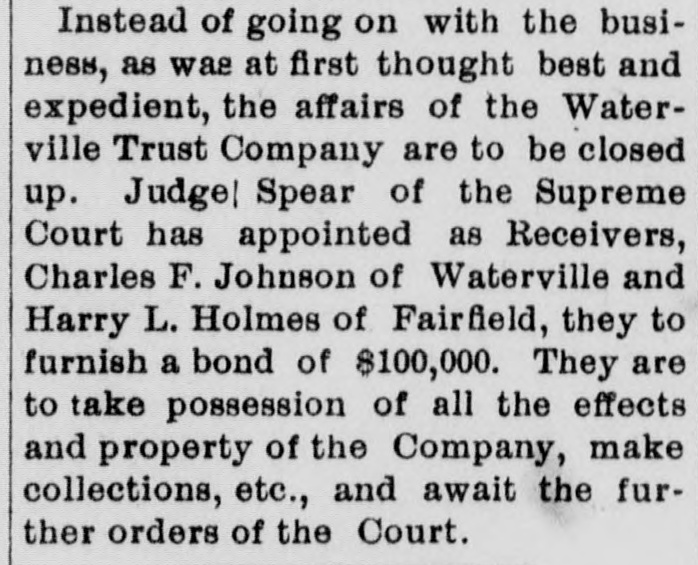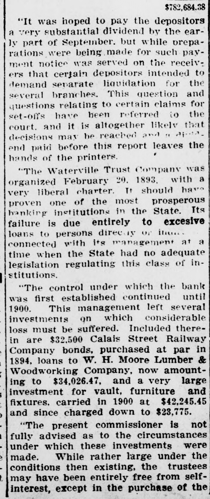 MR. SKELTON'S STATEMENT. Bank Examiner Skelton gave to the press Monday afternon the following statement on the injunction proceedings against the Waterville Trust Co. of Waterville: "I do not care to make a detailed statemer in this matter at the present time, and may not do so until the case is taken up for hearing before the court. "The Waterville Trust Co. has quite a block of paper on which a loss must be suffered. How much this loss will exceed the surplus and undivided profits canont yet be told. The notes are very generally secured by collateral. but some of this is of uncertain value. "About a year ago the affairs of the principal members of the syndicate whose notes are now in default. were placed in charge of a committee representing the creditors. The two railroads, the Portland & Brunswick and the Waterville & Oakland, which constituted an important part of these assets, were admirably managed by the committee and there was strong reason to believe that these and the mining interests would be advantageously disposed of within the allotted time. "This time expires, however, on May 11. and knowing that the committee had not accomplished what it expected, I went carefully over the details with them and with the directors of the Trust Co., and concluded that the present action was necessary in order to assure all depositors equal protection. The injunction granted Saturday evening and served this morning will keep everything in the precise condition existing at the close of business Saturday noon, except that notes due the Trust Co. may be reduced to cash as they mature. "I cannot say now what further action I may take. No receiver will be appointed at present. The present executive board is anxious to work the matter out in such way as to prevent the liquidation of the bank and this department will co-operate with them in their efforts. If this is accomplished, the bank will be in a position to resume business with full confidence in the future stability of the institution, because provision will have been made for charging off or otherwise taking care of the present doubtful investments. "None of the interests which are responsible for the present troubles are, or will be represented on the executive board. and under the very radical changes which were made two years ago in the laws governing trust company investments it is no longer possible for loans of the class and volume which have precipitated the present difficulty to be made by this or any other trust company.