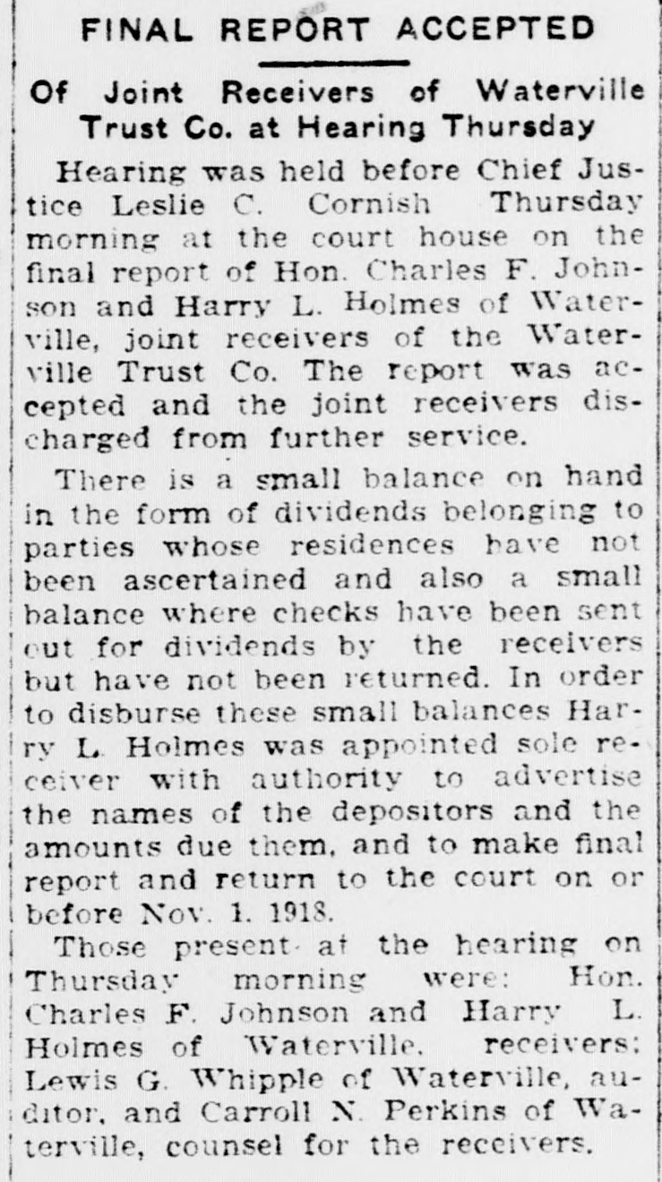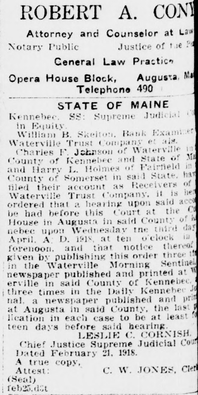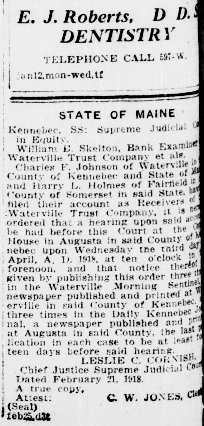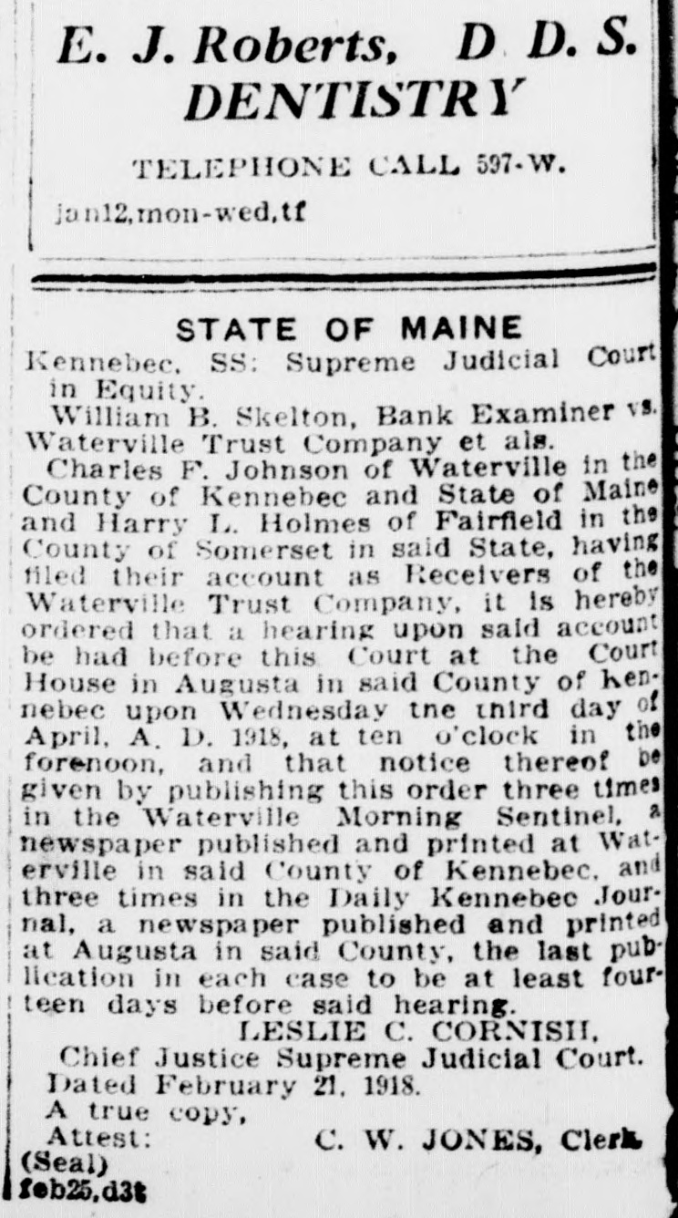 E. J. Roberts, D.D.S. DENTISTRY TELEPHONE CALL 597-W. jan12,mon-wed.tf STATE OF MAINE Kennebec. SS: Supreme Judicial Court in Equity. William B. Skelton, Bank Examiner vs. Waterville Trust Company et als. Charles F. Johnson of Waterville in the County of Kennebec and State of Maine and Harry L. Holmes of Fairfield in the County of Somerset in said State, having filed their account as Receivers of the Waterville Trust Company, it is hereby ordered that a hearing upon said account be had before this Court at the Court House in Augusta in said County of hennebec upon Wednesday the third day of April, A. D. 1918, at ten o'clock in the forenoon, and that notice thereof be given by publishing this order three times in the Waterville Morning Sentinel, a newspaper published and printed at Waterville in said County of Kennebec. and three times in the Daily Kennebec Journal, a newspaper published and printed at Augusta in said County, the last publleation in each case to be at least fourteen days before said hearing. LESLIE C. CORNISH. Chief Justice Supreme Judicial Court. Dated February 21. 1918. A true copy, Attest: C. W. JONES, Clerk (Seal) feb25,d3t