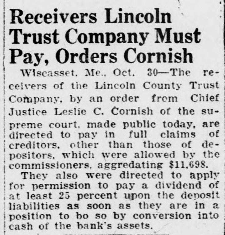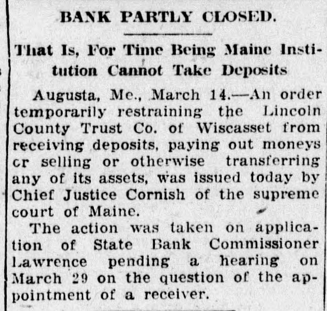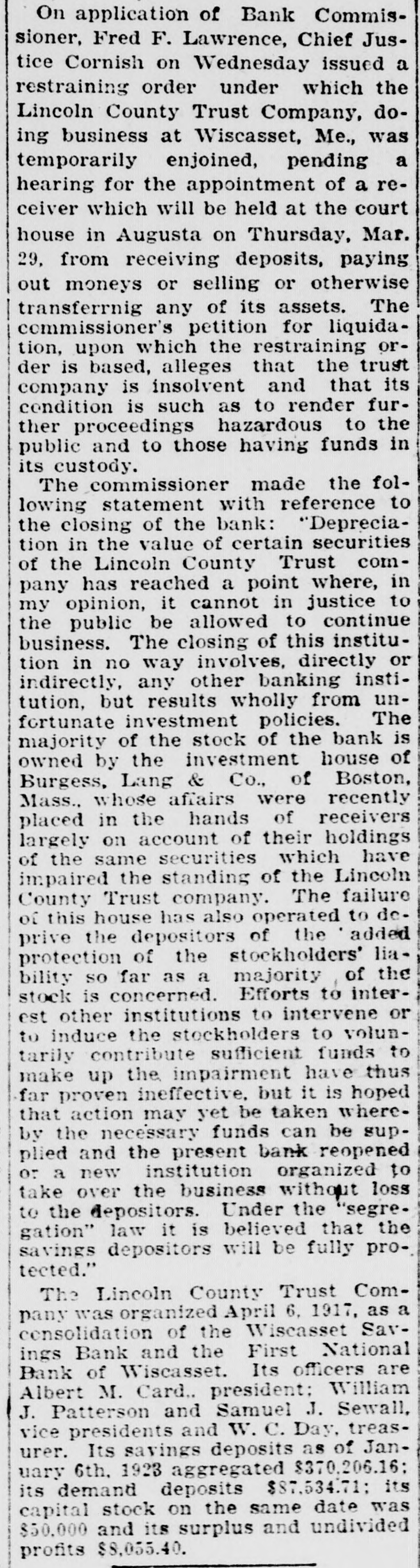 On application of Bank Commissioner, Fred F. Lawrence, Chief Justice Cornish on Wednesday issued a restraining order under which the Lincoln County Trust Company, doing business at Wiscasset, Me., was temporarily enjoined, pending a hearing for the appointment of a receiver which will be held at the court house in Augusta on Thursday, Mar. 29, from receiving deposits, paying out moneys or selling or otherwise transferrnig any of its assets. The commissioner's petition for liquidation, upon which the restraining order is based, alleges that the trust company is insolvent and that its condition is such as to render further proceedings hazardous to the public and to those having funds in its custody. The commissioner made the following statement with reference to the closing of the bank: "Depreciation in the value of certain securities of the Lincoln County Trust company has reached a point where, in my opinion, it cannot in justice to the public be allowed to continue business. The closing of this institution in no way involves, directly or indirectly, any other banking institution, but results wholly from unfortunate investment policies. The majority of the stock of the bank is owned by the investment house of Burgess, Lang & Co., of Boston, Mass., whose affairs were recently placed in the hands of receivers largely on account of their holdings of the same securities which have impaired the standing of the Lincoln County Trust company. The failure of this house has also operated to deprive the depositors of the 'added protection of the stockholders' liability so far as a majority I of the stock is concerned. Efforts to interest other institutions to intervene or to induce the stockholders to voluntarily contribute sufficient funds to make up the impairment have thus far proven ineffective, but it is hoped that action may yet be taken whereby the necessary funds can be supplied and the present bank reopened or a new institution organized to take over the business without loss to the depositors. Under the "segregation" law it is believed that the savings depositors will be fully protected." The Lincoln County Trust Company was organized April 6. 1917, as a consolidation of the Wiscasset Savings Bank and the First National Bank of Wiscasset. Its officers are Albert M. Card.. president: William J. Patterson and Samuel J. Sewall, vice presidents and W. C. Day, treasurer. Its savings deposits as of January 6th. 1923 aggregated $370,206.16: its demand deposits $87,534.71: its capital stock on the same date was $50,000 and its surplus and undivided profits $8,055.40.