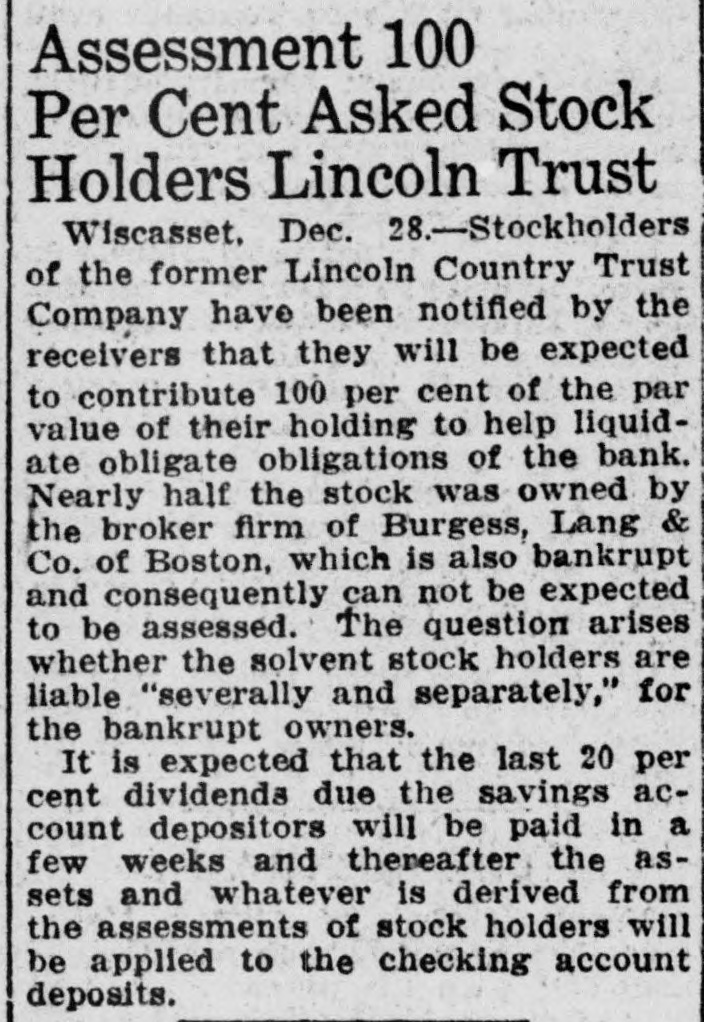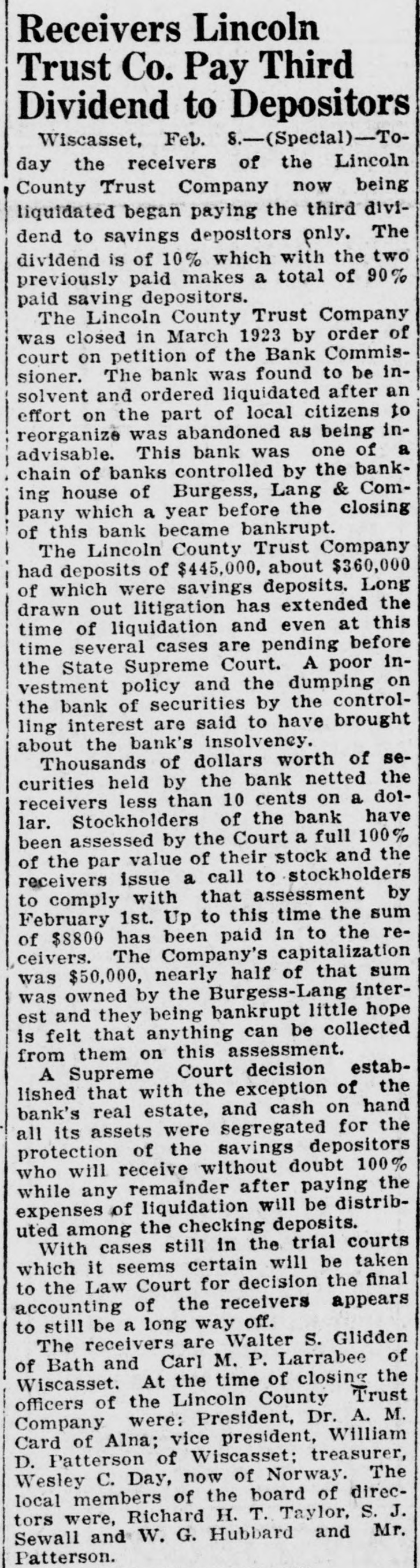 Receivers Lincoln Trust Co. Pay Third Dividend to Depositors Wiscasset, Feb. 8.-(Special)-Today the receivers of the Lincoln County Trust Company now being liquidated began paying the third dividend to savings depositors only. The dividend is of 10% which with the two previously paid makes a total of 90% paid saving depositors. The Lincoln County Trust Company was closed in March 1923 by order of court on petition of the Bank Commissioner. The bank was found to be insolvent and ordered liquidated after an effort on the part of local citizens to reorganize was abandoned as being inadvisable. This bank was one of a chain of banks controlled by the banking house of Burgess, Lang & Company which a year before the closing of this bank became bankrupt. The Lincoln County Trust Company had deposits of $445,000, about $360,000 of which were savings deposits. Long drawn out litigation has extended the time of liquidation and even at this time several cases are pending before the State Supreme Court. A poor investment policy and the dumping on the bank of securities by the controlling interest are said to have brought about the bank's insolvency. Thousands of dollars worth of securities held by the bank netted the receivers less than 10 cents on a doflar. Stockholders of the bank have been assessed by the Court a full 100% of the par value of their stock and the receivers issue a call to stockholders to comply with that assessment by February 1st. Up to this time the sum of $8800 has been paid in to the receivers. The Company's capitalization was $50,000, nearly half of that sum was owned by the Burgess-Lang interest and they being bankrupt little hope is felt that anything can be collected from them on this assessment. A Supreme Court decision established that with the exception of the bank's real estate, and cash on hand all its assets were segregated for the protection of the savings depositors who will receive without doubt 100% while any remainder after paying the expenses of liquidation will be distributed among the checking deposits. With cases still in the trial courts which it seems certain will be taken to the Law Court for decision the final accounting of the receivers appears to still be a long way off. The receivers are Walter S. Glidden of Bath and Carl M. P. Larrabee of Wiscasset. At the time of closing the officers of the Lincoln County Trust Company were: President, Dr. A. M. Card of Alna; vice president, William D. Patterson of Wiscasset: treasurer, Wesley C. Day, now of Norway. The local members of the board of directors were, Richard H. T. Taylor, S. J. Sewall and W. G. Hubbard and Mr. Patterson.
