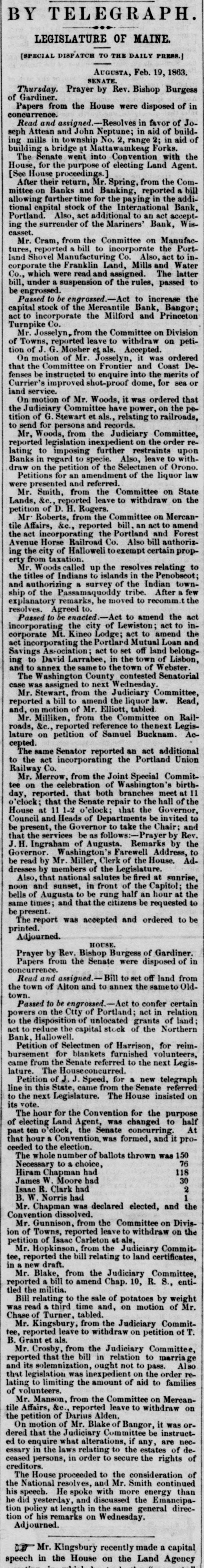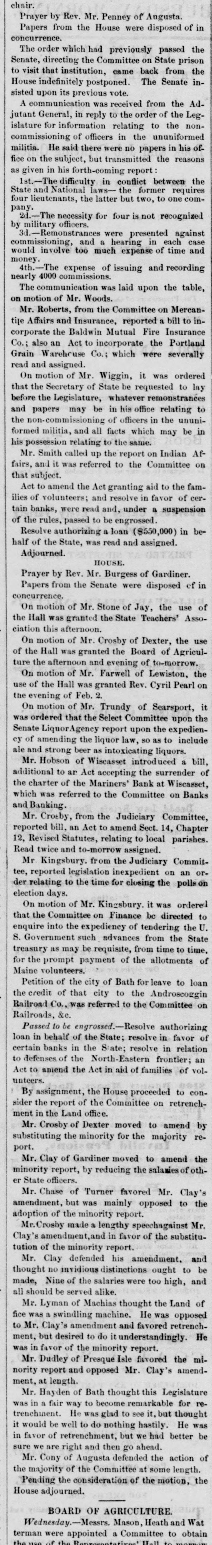 Penney Papers from the House were disposed of in concurrence. The order which had previously passed the Senate, directing the Committee on State prison to visit that institution, came back from the House indefinitely postponed. The Senate insisted upon its previous vote. A communication was received from the Adjutant General, in reply to the order of the Legislature for information relating to the noncommissioning of officers in the ununiformed militia. He said there were no papers in his office on the subject, but transmitted the reasons as given in his forth-coming report 1st.-The difficulty in conflict between the State and National laws- the former requires four lieutenants, the latter but two, to one company. 2d.-The necessity for four is not recognized by military officers. 3d.-Remonstrances were presented against commissioning, and a hearing in each case would involve too much expense of time and money. 4th.-The expense of issuing and recording nearly 4000 commissions. The communication was laid upon the table, on motion of Mr. Woods. Mr. Roberts, from the Committee on Mercantite Affairs and Insurance, reported a bill to incorporate the Baldwin Mutual Fire Insurance Co.; also an Act to incorporate the Portland Grain Warehouse Co.; which were severally read and assigned. On motion of Mr. Wiggin, it was ordered that the Secretary of State be requested to lay before the Legislature, whatever remonstrances and papers may be in his office relating to the non-commissioning of officers in the ununiformed militia, and all facts which may be in his possession relating to the same. Mr. Smith called up the report on Indian Affairs, and it was referred to the Committee on that subject. Act to amend the Act granting aid to the families of volunteers; and resolve in favor of certain banks, were read and, under a suspension of the rules, passed to be engrossed. Resolve authorizing a loan ($550,000) in behalf of the State, was read and assigned. Adjourned. HOUSE. Prayer by Rev. Mr. Burgess of Gardiner. Papers from the Senate were disposed of in concurrence. On motion of Mr. Stone of Jay, the use of the Hall was granted the State Teachers' Association this afternoon. On motion of Mr. Crosby of Dexter, the use of the Hall was granted the Board of Agriculture the afternoon and evening of to-morrow. On motion of Mr. Farwell of Lewiston, the use of the Hall was granted Rev. Cyril Pearl on the evening of Feb. 2. On motion of Mr. Trundy of Searsport, it was ordered that the Select Committee upon the Senate LiquorAgency report upon the expediency of amending the liquor law, so as to include ale and strong beer as intoxicating liquors. Mr. Hobson of Wiscasset introduced a bill, additional to ar Act accepting the surrender of the charter of the Mariners' Bank at Wiscasset, which was referred to the Committee on Banks and Banking. Mr. Crosby, from the Judiciary Committee, reported bill, an Act to amend Sect. 14, Chapter 12, Revised Statutes, relating to local parishes. Read twice and to-morrow assigned. Mr Kingsbury. from the Judiciary Committee, reported legislation inexpedient on an order relating to the time for closing the polls election days. On motion of Mr. Kingsbury. it was ordered that the Committee on Finance be directed to enquire into the expediency of tendering the U. S. Government such advances from the State treasury as may be requisite, from time to time, for the prompt payment of the allotments of Maine volunteers. Petition of the city of Bath for leave to loan the credit of that city to the Androscoggin Railroad Co., was referred to the Committee on Railroads, &c. Passed to be engrossed.-Resolve authorizing loan in behalf of the State; resolve in favor of certain banks in the State; resolve in relation to defenses of the North-Eastern frontier; an Act to amend the Act in aid of families of volunteers. By assignment, the House proceeded to consider the report of the Committee on retrenchment in the Land office. Mr. Crosby of Dexter moved to amend by substituting the minority for the majority report. Mr. Clay of Gardiner moved to amend the minority report, by reducing the salamies of other State officers. Mr. Chase of Turner favored Mr. Clay's amendment, but was mainly opposed to the adoption of the minority report. Crosby made a lengthy speechagainst Mr. Clay's amendment,and in favor of the substitutution of the minority report. Mr. Clay defended his amendment, and thought no invidious distinctions ought to be made, Nine of the salaries were too high, and all should be served alike. Mr. Lyman of Machias thought the Land of fice was a swindling machine. He was opposed to Mr. Clay's amendment and favored retrenchment, but desired to do it understandingly. He was in favor of the minority report. Mr. Dudley of Presque Isle favored the minority report and opposed Mr. Clay's amendment, at length. Mr. Hayden of Bath thought this Legislature was in a fair way to become remarkable for retrenchinent. He was glad to see it, but thought it would be well to do nothing hastily. He was in favor of retrenchment, but we had better be sure we are right and then go ahead. Mr. Cony of Augusta defended the action of the majority of the Committee at some length. Pending the consideration of the motion, the House adjourned. BOARD OF AGRICULTURE Wednesday- Messrs Mason Heath Wat