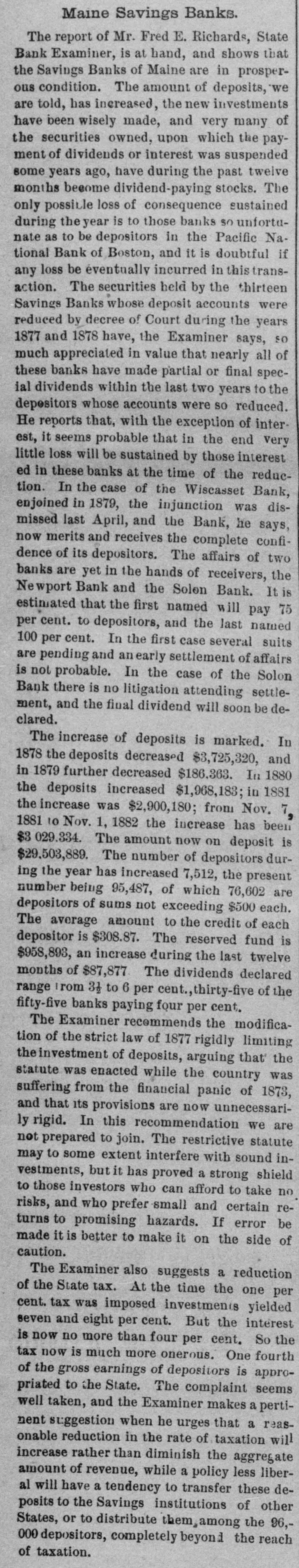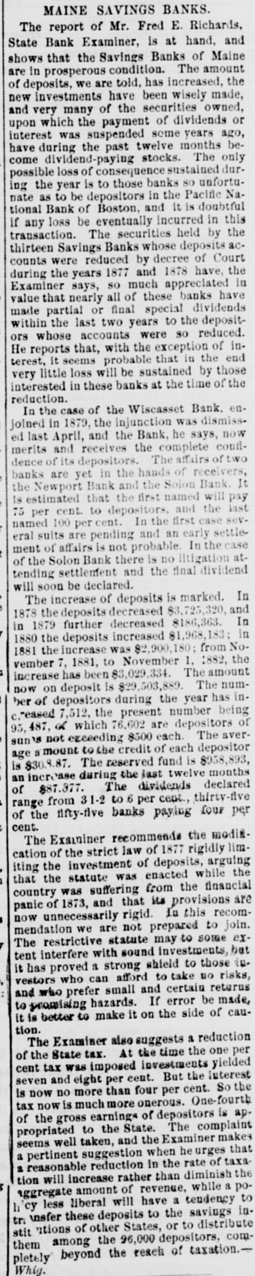MAINE SAVINGS BANKS. The report of Mr. Fred E. Richards, State Bank Examiner, is at hand, and shows that the Savings Banks of Maine are in prosperous condition. The amount of deposits, we are told, has increased, the new investments have been wisely made, and very many of the securities owned, upon which the payment of dividends or interest was suspended some years ago, have during the past twelve months become dividend-paying stocks. The only possible loss of consequence sustained during the year is to those banks so unfortunate as to be depositors in the Pacific National Bank of Boston, and it is doubtful if any loss be eventually incurred in this transaction. The securities held by the thirteen Savings Banks whose deposits accounts were reduced by decree of Court during the years 1877 and 1878 have, the Examiner says, so much appreciated in value that nearly all of these banks have made partial or final special dividends within the last two years to the depositors whose accounts were so reduced. He reports that, with the exception of interest, it seems probable that in the end very little loss will be sustained by those interested in these banks at the time of the reduction. In the case of the Wiscasset Bank, enjoined in 1879, the injunction was dismissed last April, and the Bank, he says, now merits and receives the complete countdence of its depositors. The affairs of two banks are yet in the hands of receivers, the Newport Bank and the Solon Bank. It is estimated that the first named will pay 75 per cent. to depositors, and the last named 100 per cent. In the first case several suits are pending and an early settlement of affairs is not probable. In the case of the Solon Bank there is no litigation attending settlement and the final dividend will soon be declared. The increase of deposits is marked. In 1878 the deposits decreased $3,725,320, and in 1879 further decreased 8186,363. In 1880 the deposits increased $1,968,183; in 1881 the increase was $2,900,180; from November 7, 1881, to November 1, 1882, the increase has been 83,029,334. The amount now on deposit is $29,503,889. The numher of depositors during the year has increased 7,512, the present number being 95,487, of which 76,602 are depositors or sun's not exceeding 8500 each. The average a mount to the credit of each depositor is $30.8.87. The reserved fund is $958,893, an increas during the last twelve months of $87.377. The dividends declared range from 31-2 to 6 per cent., thirty-five of the fifty-five banks paying four per cent. The Examiner recommends the modifcation of the strict law of 1877 rigidly limiting the investment of deposits, arguing that the statute was enacted while the country was suffering from the financial panic of 1873, and that its provisions are now unnecessarily rigid. 1u this recommendation we are not prepared to join. The restrictive statute may to some extent interfere with sound investments, but it has proved a strong shield to those in. vestors who can afford to take no risks, and who prefer small and certain returns to promising hazards. If error be made, it is better to make it on the side of caution. The Examiner also suggests a reduction of the State tax. At the time the one per cent tax was imposed investments yielded seven and eight per cent. But the interest is now no more than four per cent. So the tax now is much more onerous. One-fourth of the gross earnings of depositors is ap. propriated to the State. The complaint seems well taken, and the Examiner makes a pertinent suggestion when he urges that a reasonable reduction in the rate of taxa. tion will increase rather than diminish the 3 aggregate amount of revenue, while a po- to cy less liberal will have a tendency h insfer these deposits to the savings instit tr. utions of other States, or to distribute them among the 96,000 depositors, completely beyond the reach of taxation.Whig.