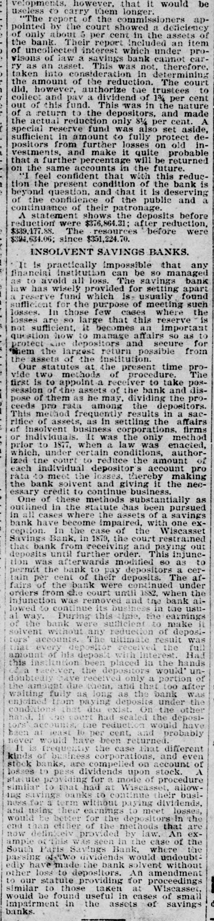 velopments. however. the longer. useless to carry of them the commissioners deficiency ap'The report by the court showed the a assets of pointed about 5 per cent in item of only Their report included under an prothe uncollected bank. interest which cannot carof law a savings bank therefore. visons of asset. This was not. as an consideration in court taken of the reduction. trustees ry the amount into determining The cent to authorize the per did, however, and pav a dividend of 134 the nature collect fund. This was in and made out of this to the depositors, cent. A of a return reduction only 81/4 per set aside, the actual reserve fund was also protect despecial in amount to fully old from further losses on positors sufficient probable inand make it quite returned vestments, further percentage will future. be that a same accounts in the this on the feel confident that with of the bank reduc- is tion 'I the present condition and that it is deserving and a of their beyond continuance of the question. confidence of patronage. the the deposits public before A statement shows $376,864.31; after reduction. reduction were The resources before were $339,177.88. $394,634.06; since $351,224.70. INSOLVENT SAVINGS BANKS. It is practically institution impossible can be so that managed bank any to provided for financial avoid all loss. The savings setting apart has fund which is: a reserve for the purpose of where sufficient law as wisely usually meeting found such the is losses. In so those large few that cases this reserve important losses are it becomes an as to not question sufficient, how to manage and affairs secure so for protect alle largest depositors return possible from 'them the the institution. the assets of at the present time pro- The Our statutes methods of procedure. vide two to appoint a receiver bank to take and pos- disfirst is of the assets of the dividing the propose session of them as he among may, the depositors. sacceeds method pro rata frequently results the in affairs a ritice This of assets, business as in settling corporations. method firms of insolvent It was the only enacted, or individuals. to 1877, when a conditions, law was authorprior which, under court certain to reduce the account amount pro of ized each the individual depositor's losses. thereby making rata to meet solvent the and giving business. it the necthe bank credit to continue substantially essary One of these methods has been pursued as outlined in the where statute the assets of a savings exin all cases become impaired. with Wiscasset one bank have the case of the restrained ception. Bank, In in 1879, the court and paying out Savings bank from receiving This afterwards was bank to pay depositors The a that deposits tion until further order. modified so injune- as cer- af- to permit the cent of their deposits. continued under tain per bank were when the fairs of from the the court until and 1882, the bank alinjunction orders was removed its business in the usulowed to continue During this time, the to earnings make it solvent al of way. the bank without were The any sufficient reduction ultimate result of deposi- was full tors accounts. depositor received interest. the Had that every his deposit with the hands amount of been placed in would' unthis institution the depositors portion of race.ver, ave received only that a too after doubtedly amount due them, and the bank was waiting the fully as long deposits as under the enjoined from paying exist. On the other conditions that court dia had scaled the deposi- have hand. if ounts, .00 the reduct. and would probably tors' acc least 10 per cent. been never at would have been case returned. that different It is frequently the corporations, account and even of kinds banks, of business are compelled on stock. A stock dividends upon procedure losses to providing pass for a mode of allowsimilar ute to that had at continue Wiscasset. their busi40g savings a term banks without to paying dividends, losses, ness and using for their earnings depositors to meet in the would be either better for of the the methods that An ex- are now end than definicelv provided seen in by the law. case of the the ample of this Savings was Bank, where undoubtSouth Paris (with dividends solvent would without passing have made the bank amendment edly to depositors. An proceedings other loss statute providing for Wiscasset, to our to those taken at of small banks. would similar impairment be found in the useful assets in cases of savings