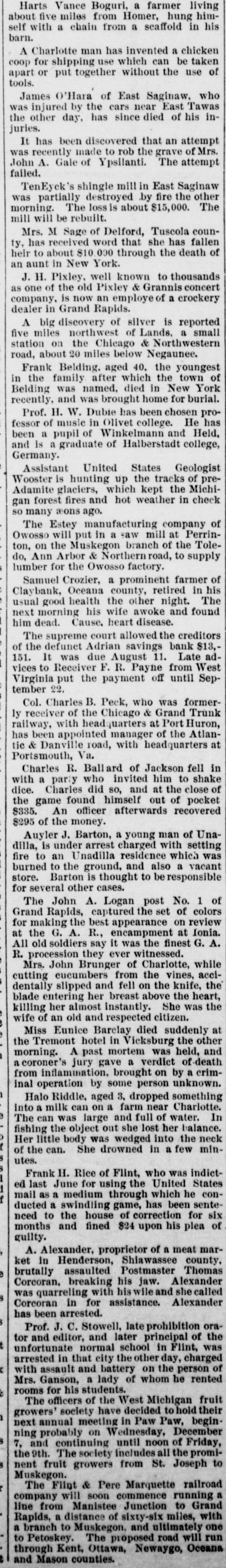 Harts Vance Boguri, a farmer living about five miles from Homer, hung himself with a chain from a scaffold in his barn. A Charlotte man has invented a chicken coop for shipping use which can be taken apart or put together without the use of tools. James O'Hara of East Saginaw, who was injured by the cars near East Tawas the other day, has since died of his injuries. It has been discovered that an attempt was recently made to rob the grave of Mrs. John A. Gale of Ypsilanti. The attempt failed. TenEyck's shingle mill in East Saginaw was partially destroyed by fire the other morning. The loss is about $15,000. The mill will be rebuilt. Mrs. M Sage of Delford, Tuscola county, has received word that she has fallen heir to about $10.000 through the death of an aunt in New York. J. H. Pixley, well known to thousands as one of the old Pixley & Grannis concert company, is now an employe of a crockery dealer in Grand Rapids. A big discovery of silver is reported five miles northwest of Lands, a small station on the Chicago & Northwestern road, about 20 miles below Negaunee. Frank Belding, aged 40, the youngest in the family after which the town of Belding was named, died in New York recently, and was brought home for burial. Prof. H. W. Dubie has been chosen professor of music in Olivet college. He has been a pupil of Winkelmann and Held, and is a graduate of Halberstadt college, Germany. Assistant United States Geologist Wooster is hunting up the tracks of pre-Adamite glaciers, which kept the Michigan forest fires and hot weather in check so many æons ago. The Estey manufacturing company of Owosso will put in a saw mill at Perrinton, on the Muskegon branch of the Toledo, Ann Arbor & Northern road, to supply lumber for the Owosso factory. Samuel Crozier, a prominent farmer of Claybank, Oceana county, retired in his usual good health the other night. The next morning his wife awoke and found him dead. Cause, heart disease. The supreme court allowed the creditors of the defunct Adrian savings bank $13,151. It was due August 11. Late advices to Receiver F. R. Payne from West Virginia put the payment off until September 22. Col. Charles B. Peck, who was formerly receiver of the Chicago & Grand Trunk railway, with headquarters at Port Huron, has been appointed manager of the Atlantic & Danville road, with headquarters at Portsmouth, Va. Charles R. Ballard of Jackson fell in with a party who invited him to shake dice. Charles did so, and at the close of the game found himself out of pocket $335. An officer afterwards recovered $295 of the money. Auyler J. Barton, a young man of Unadilla, is under arrest charged with setting fire to an Unadilla residence which was burned to the ground, and also a vacant store. Barton is thought to be responsible for several other cases. The John A. Logan post No. 1 of Grand Rapids, captured the set of colors for making the best appearance on review at the G. A. R., encampment at Ionia. All old soldiers say it was the finest G. A. R. procession they ever witnessed. Mrs. John Brunger of Charlotte, while cutting cucumbers from the vines, accidentally slipped and fell on the knife, the blade entering her breast above the heart, killing her almost instantly. She was the wife of an old and respected citizen. Miss Eunice Barclay died suddenly at the Tremont hotel in Vicksburg the other morning. A past mortem was held, and a coroner's jury gave a verdict of death from inflamination, brought on by a criminal operation by some person unknown. Halo Riddle, aged 3, dropped something into a milk can on a farm near Charlotte. The can was large and full of water. In fishing the object out she lost her balance. Her little body was wedged into the neck of the can. She drowned in a few minutes. Frank H. Rice of Flint, who was indicted last June for using the United States mail as a medium through which he conducted a swindling game, has been sentenced to the house of correction for six months and fined $24 upon his plea of guilty. A. Alexander, proprietor of a meat market in Henderson, Shiawassee county, brutally assaulted Postmaster Thomas Corcoran, breaking his jaw. Alexander was quarreling with his wile and she called Corcoran in for assistance. Alexander has been arrested. Prof. J. C. Stowell, late prohibition orator and editor, and later principal of the unfortunate normal school in Flint, was arrested in that city the other day, charged with assault and battery on the person of Mrs. Ganson, a lady of whom he rented rooms for his students. The officers of the West Michigan fruit growers' society have decided to hold their next annual meeting in Paw Paw, beginning probably on Wednesday, December 7, and continuing until noon of Friday, the 9th. The society includes all the prominent fruit growers from St. Joseph to Muskegon. The Flint & Pere Marquette railroad company will soon commence running a line from Manistee Junction to Grand Rapids, a distance of sixty-six miles, with a branch to Muskegon, and ultimately one to Petoskey. The proposed road will run through Kent, Ottawa, Newaygo, Oceana and Mason counties.