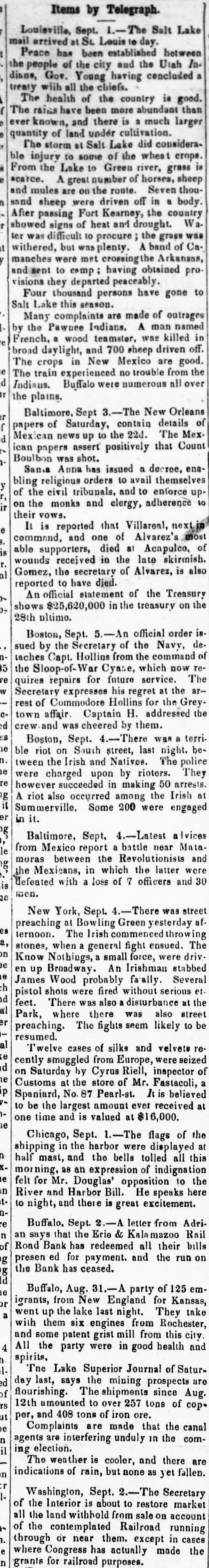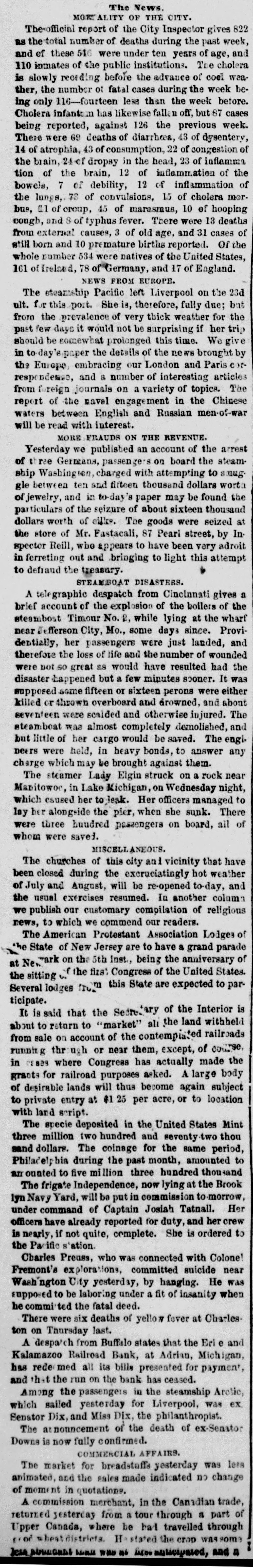 Therofficial report of the City Inspector gives 822 as the total number of deaths during the past week, and ef these 516 were under ten years of age, and 110 inmates of the public institutions. The cholera is slowly receding before the advance of coel weather, the number of fatal cases during the week being only 116-fourteen less than the week before. Cholera infantom has likewise fallen off, but cases being reported, against 126 the previous week. There were 69 deaths of diarrheea, 43 of dysentery, 14 of atrophia, 43 of consumption, 22 of congestion of the brain, 24 of dropsy in the head, 23 of inflamma tion of the brain, 12 of inflammation of the bowels, 7 of debility, 12 of inflammation of the lungs, 78 of convulsions, 15 of cholera mor. bue, 01 of croup, 45 of marasmus, 10 of hooping cough, and S of typhus fever. There were 13 deaths from external causes, 3 of old age, and 31 cases of still born and 10 premature births reported. Of the whole number 534 were natives of the United States, 161 of Ireland, 78 Germany, and 17 of England. NEWS FROM EUROPE. The steamship Pacific left Liverpool on the 23d ult. for this port. She is, therefore, fully due; but from the prevalence of very thick weather for the past few days it would not be surprising if her trip should be somewhat prolonged this time. We give in to paper the details of the ne brought by the Europe, embracing our London and Paris correspondemse, and a number of interesting articles from foreign journals on a variety of topics. The report of the navel engagement in the Chinese waters between English and Russian men-of-war will be read with interest. MORE FRAUDS ON THE REVENUE. Yesterday we published an account of the arrest of three Germans, passengers on board the steam. ship Washington, charged with attempting to smug. gle between ten and fifteen thousand dollars worth of jewelry, and in to-day's paper may be found the particulars of the seizure of about sixteen thousand dollars worth of silks. The goods were seized at the store of Mr. Fastacali, 87 Pearl street, by In spector Reill, who appears to have been very adroit in ferreting out and bringing to light this attempt to defraud the treasury. STEAMBOAT DISASTERS. A telegraphic despatch from Cincinnati gives a brief account of the explosion of the boilers of the steambost Timour No. 2, while lying at the wharf near Jefferson City, Mo., some days since. Providentially, her passengers were just landed, and therefore the loss of life and the number of wounded were not so great as would have resulted had the disaster happened but a few minutes sconer. It was supposed some fifteen or sixteen perons were either killed or thrown overboard and drowned, and about seventeen were scalded and otherwise injured. The steamboat was almost completely demolished, and but little of her cargo would be saved. The enginears were held, in heavy bonds, to answer any charge which may be brought against them. The steamer Lady Elgin struck on a rock near Manitowoc, in Lake Michigan, on Wednesday night, which caused her to leak. Her officers managed to lay her alongside the pier, when she sunk. There were three hundred passengers on board, all of whom were saved. MISCELLANEOUS. The churches of this city and vicinity that have been closed during the excruciatingly hot weather of July and August, will be re-opened to-day, and the usual exercises resumed. In another column we publish our customary compilation of religious news, to which we commend our readers. The American Protestant Association Lodges of the State of New Jersey are to have a grand parade at New work on the 5th inst, being the anniversary of the sitting the first Congress of the United States. Several lodges ITC." this State are expected to participate. It is said that the Secretary of the Interior is about to return to "market" all the land withheld from sale on account of the contemplated railroads running through or near them, except, of course. in *1889 where Congress has actually made the grants for railroad purposes asked. A large body of desirable lands will thus become again subject to private entry at $1 25 per acre, or to location with land script. The specie deposited in the United States Mint three million two hundred and seventy thou sand dollars. The coinage for the same period, Philadelph during the past month, amounted to an ounted to five llion three hundred thousand The frigate Independence, now lying at the Brook lyn Navy Yard, will be put in commission to-morrow, under command of Captain Josiah Tatnall. Her officers have already reported for duty, and her crew is nearly, if not quite, complete. She is ordered to the Pacific s'ation. Charles Preuss, who was connected with Colone! Fremont's explorations, committed suicide near Wash'ngton City yesterday, by hanging. He was supposed to be laboring under a fit of insanity when he commited the fatal deed. There were six deaths of yellow fever at Charles. ton on Thursday last. A despatch from Buffalo states that the Eri e and Kalamazoo Railroad Bank, at Adrian, Michigan, has rede med all its bills presented for payment, and that the run on the bank has ceased. Among the passengers in the steamship Arctic, which sailed yesterday for Liverpool, was ex Senator Dix, and Miss Dix, the philanthropist. The atnouncement of the death of ex-Senator Downs is now fully confirmed. COMMERCIAL AFFAIRS. The market for breadstuffs yesterday was less animated, and the sales made indicated no change of moment in quotations. A commission merchant, in the Canadian trade, returned yesterday from a tour through a part of Upper Canada, where be had travelled through or wheatdistricts H. stated the crop was some less airmount was was me MADE anticipated, and a