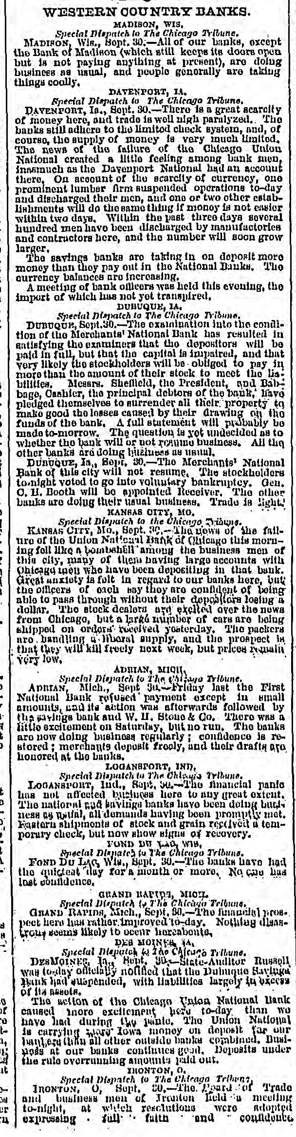 WESTERN COUNTRY BANKS. MADISON, WIS, Special Dispatch to The Chicago Tyliume. MADISON, Wis., Bopt. 30.-All of our banks, except the Bank of Madison (which still keeps its doors open but is not paying anything at present), are doing business as usual, and people genorally are taking things coally. DAVENPORT, IA. Special Dispatch to The Chicago Tribune. DAYENPORT, Ia., Sept. 30.-There is a great scarcity of money here, and trade is well nigh paralyzed. The banks still adhere to the limited check system, and, of courso, the supply of money la very much limited. The news of the failure of the Chicago Union National created a little feeling among bank men, innsmuch as the Dayenport National had an account there, On account of the scarcity of currency, our prominent lumber firm suspended operations to-day and discharged their men, and one or two other establiabments will do thesamo thing If money is not ensier within two days. Within the past three days several hundred men have been discharged by manufactories and contractors here, and the number will soon grow larger. The savings banks are taking in on deposit more money than they pay out in the National Banks. Tho currency balances are increasing. A meeting of bank officers was held this evening, the import of which has not yet transpired, DUBUQUE, IA, Special Dispatch to The Chicago Tribune. DUBUQUE, Sept.30.-The examination into the condition of the Merchants' National Bank has resulted in antisfying the examiners that the depositors will be paid in full, but that the capital in impaired, and that very likely the stockholders will be obliged to pay in more than the amount of their stock to meet the lis bilities. Messrs. Shefiield, the President, and Bab bage, Cashier, the principal debtors of the bank, Have pledged themselves to surrender all their property to make good the losses caused by their drawing on the funds of the bank. A full statement will probably be made to-morrow. The question is yet undecided as to whether the bank will or not require business. All the other banks ard doing bitéluens au usual. DUBUQUE, In, Bopt. 30,-The Merchante' National Bank of this city will not resume. The stockholders tonight voted to go into voluntary bankruptcy. Gen. O. 11. Booth will be appointed Receiver. The other banks are dolug their usual business. Trade is light KANGAS CITY, MO. Special Dispatch to the Chicago Discuss KANGAS CITY, Mo., Sept. 30. The LIOWS of the failuro of the Union National Bank of Chiloago this morning foll like n bombsbill among the business men of this city, many of them having largo accounts with Obleage tpen who have been depositing in that bank. Great unxiety is fult in regard to our banks here, but the officers of each bay they are confident of being able to pass through without their depositors loaing a dollar. The stock dealora are exclted over the nows from Chicago, but a larké number of care are being shipped on orders received yeaterday. The packers aro handling 4 liberal supply, and the prospect is that they will kill freely next week, but prices requality very low, ADRIAN, MIQII Special Dispatch to The Village Tribune. ADRIAN, Mich., Sept 31.-Friday last the First National Bank refused payment except in email amounts, and its action was afterwards followed by the savings bank and W. II. Stone & Co. There was a little excitement on Saturday, but no run. The bauka are now doing business regularly confidence is restored: merchants deposit freely, and their drafth ara honored at the banks. LOGANSTORT, IND, Special Dispatcle to The Ohlayia Iribune. LOGANSPORT, Ind., Rept. 344-The financial panic line not affected biletures here to any great extent, The national cod bavinge banks have been doing bud. HESH as Instal, all demanda having been promptly met. Fastorn shipments of stock and grain recover 11 temporary check, but now show signe or recovery. FOND DW HA WIB, Special Dispatch to The Chicago Tribuns. FOND Du LAB Wis., Sept. 30.-The banks have had the quicteat day for A month or more, No cau has lost confidence, GRAND HAPTON, MOIL Special Disputch (+ The Chicago Tribuns. GRAND RAPIDA, Mich., Sept. 30.-The financial 1:008 pect here lum rather improved 10-day. Nothing dianstrous seems likely to occur hereaboute, DEB MOINE& IA, Special Dispatch The Chicago Trilune. DESMOINES, In. Hept. JUL-State-Auditor Russell WITH today officially notified that the Dubuque Bayluga Bank had suspended, with liabilities largely 14 or 11a Assets. The action of the Chicago Union National Bank caused Inoro excitement have to-day than we have had during the plante. The Union National is carrying WAN Iowa money on deposit far our banle (11/11) all other outside banks combined. Dusinots at our banks continues good. Deposits under the rule overrunning amounts paid out. INONTON, o. Special Dispatch (o The Clienga Trillions IRONTON, o, Sept. 20.-The. Poard of Trade and business mon of Ironton hill u meeting to-night, at which resolutions were Rdopted and confidente faith full expressing