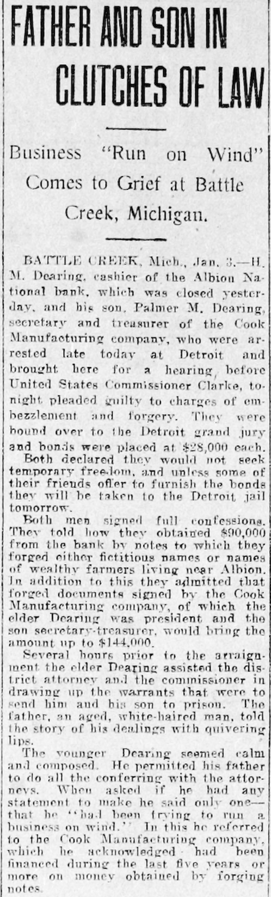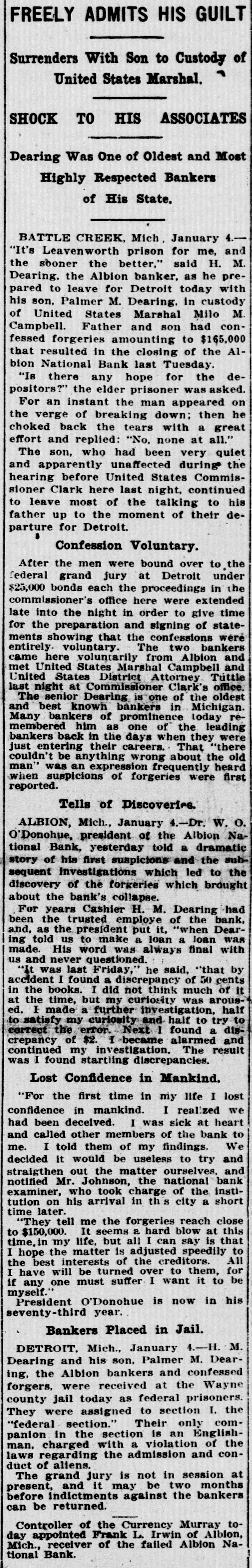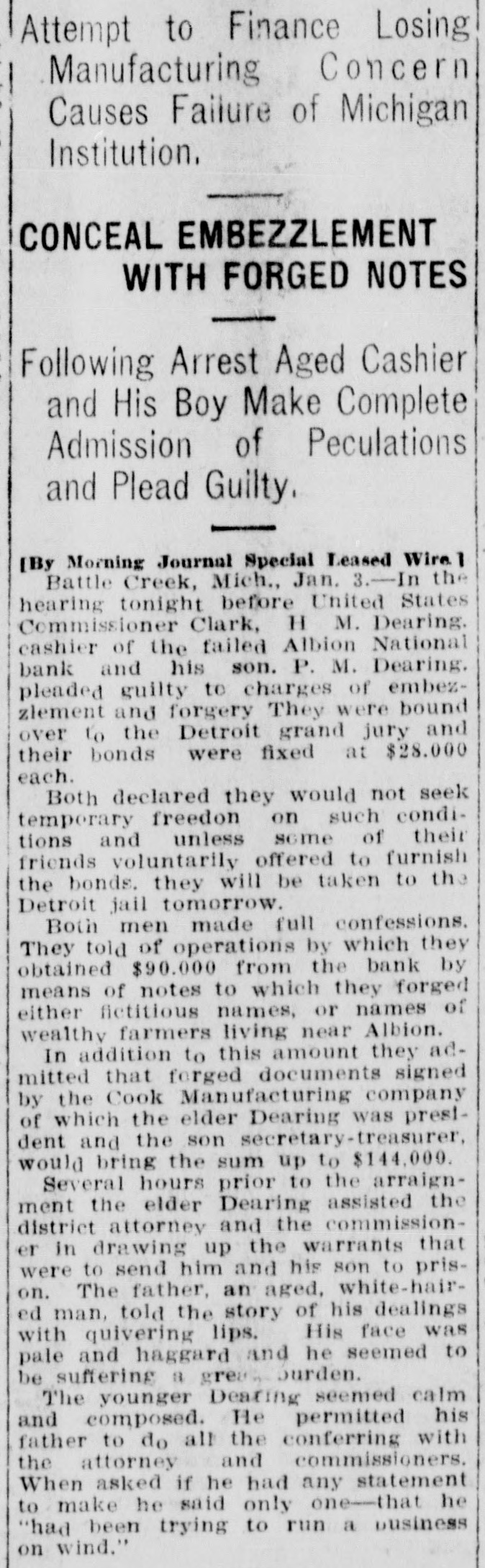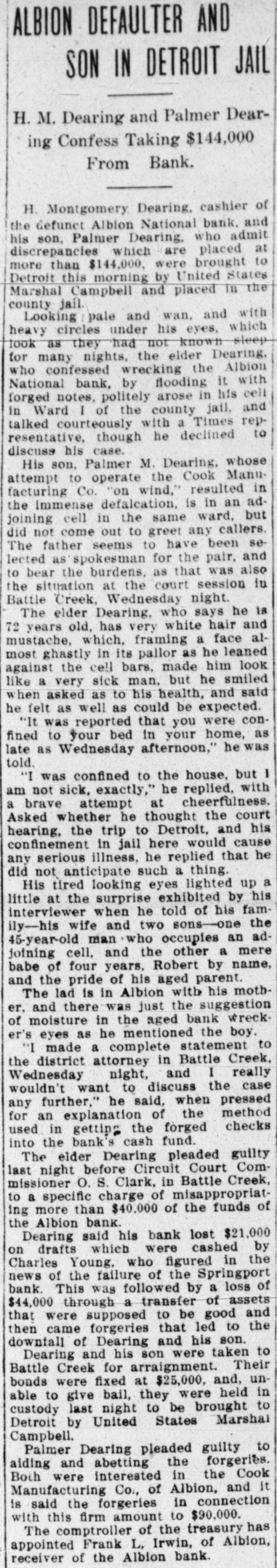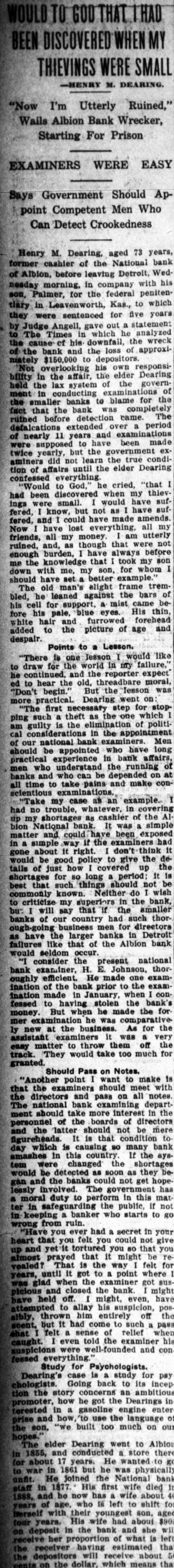 WOULD TO GOD THAT THAD BEEN DISCOVERED WHEN MY THIEVINGS WERE SMALL -HENRY M. DEARING. "Now I'm Utterly Ruined," Wails Albion Bank Wrecker, Starting For Prison EXAMINERS WERE EASY Says Government Should Ap1 point Competent Men Who Can Detect Crookedness Henry M. Dearing, aged 73 years, former cashier of the National bank of Albion, before leaving Detroit, Wednesday morning, in company with his son, Palmer, for the federal penitentiary in Leavenworth, Kas., to which they were sentenced for five years by Judge Angell, gave out a statement to The Times in which he analyzed the cause ef his downfall, the wreck of the bank and the loss of approximately $150,000 to depositors. 'Not overlooking his own responsibility in the affair, the elder Dearing held the lax system of the government in conducting examinations of the smaller banks to blame for the fact that the bank was completely ruined before detection came. The defalcations extended over period of nearly 11 years and examinations were supposed to have been made twice yearly, but the government examiners did not learn the true condition of affairs until the elder Dearing confessed everything. "Would to God, he cried, "that I had been discovered when my thievings were small. I would have suffered, know, but not as I have suffered, and could have made amends. Now I have lost everything, all my friends, all my money am utterly ruined, and, as though that were not enough burden, I have always before me the knowledge that I took my son down with me, my son, for whom I should have set a better example. The old man's slight frame trembled, he leaned against the bars of his cell for support, a mist came before his pale, blue eyes. His thin, white hair and furrowed forehead added to the picture of age and despair. Points to a Lesson. "There is one lesson I would like to draw for the world in my failure, he continued, and the reporter expect ed to hear the old, threadbare moral, "Don't begin. But the lesson was more practical. Dearing went on "The first necessary step for stopping such a theft as the one which am guilty is the elimination of political considerations in the appointment of our national bank examiners. Men should be appointed who have long practical experience in bank affairs, men who understand the running of banks and who can be depended on at all time to take pains and make conscientious examinations. "Take my case as an example. I had no trouble, whatever, in covering up my shortages as cashier of the Albion National bank. It was a simple matter and could have been exposed in a simple way If the examiners had gone about it right. I don't think it would be good policy to give the details of just how I covered up the shortages for so long a period; It is best that such things should not be commonly known. Neither do I wish to criticize my superiors in the bank, but I will say that if the smaller banks of our country had such thorough-going business men for directors as have the larger banks in Detroit failures like that of the Albion bank would seldom occur. "I consider the present national bank examiner, H. E. Johnson, thoroughly efficient. He made one examination of the bank prior to the examination made in January, when confessed to having stolen the bank's money. But when he made the for mer examination he was comparative ly new at the business. As for the assistant examiners it was a very easy matter to throw them off the track. They would take too much for granted. Should Pass on Notes. "Another point I want to make is that the examiners should meet with the directors and pass on all notes. The national bank examining department should take more interest in the personnel of the boards of directors and the latter should not be mere figureheads. It is that condition to day which is causing so many bank smashes in this country. If the system were changed the shortages would be detected as soon as they began and the banks could not get hopelessly involved. The government has a moral duty to perform in this mat ter in safeguarding the public, if not in keeping a banker who starts to go wrong from ruin. "Have you ever had a secret in your heart that you felt you could not give up and yet it tortured you so that you almost prayed that it might be revealed? That is the way I felt for years, until it got to a point where I was glad when the examiner got suspicious and closed the bank. I might have held off. I might, even, have attempted to allay his suspicion, possibly, thrown him entirely off the scent, but it had come to such a pass shat I felt a sense of relief when caught. I even told the examiner his suspicions were well-founded and con fessed everything. Study for Psychologists. Dearing's case is study for psy chologists. Going back to its Incep tion the story concerns an ambitious promoter, how he got the Dearings in terested in a gasoline engine enter prise and how, to use the language of the son, "we built too much on our hopes.' The elder Dearing went to Albion in 1855, and conducted a store there for about 17 years. He wanted to go to war in 1861 but he was physically unfit. He joined the National bank staff in 1877. His first wife died in 1888, and he now has a wife about 40 years of age, who is left to shift for Irerself with their youngest son, aged four years. His wife had about $90 on deposit in the bank and she will receive her proportion of what is left the receiver having estimated tha the depositors will receive about 5 cents on the dollar. which means that