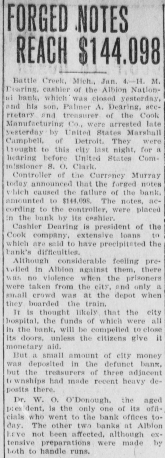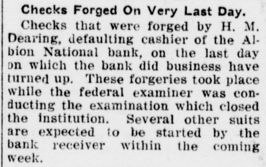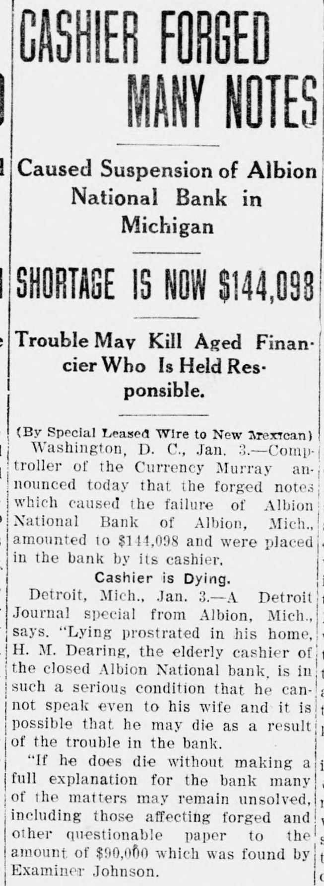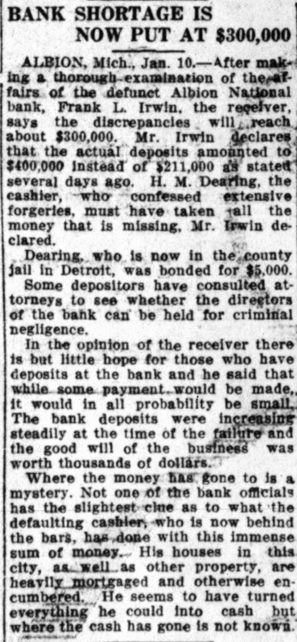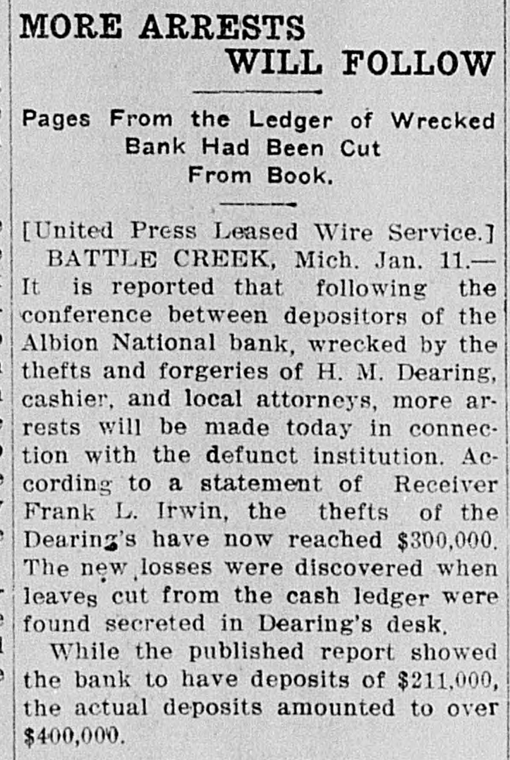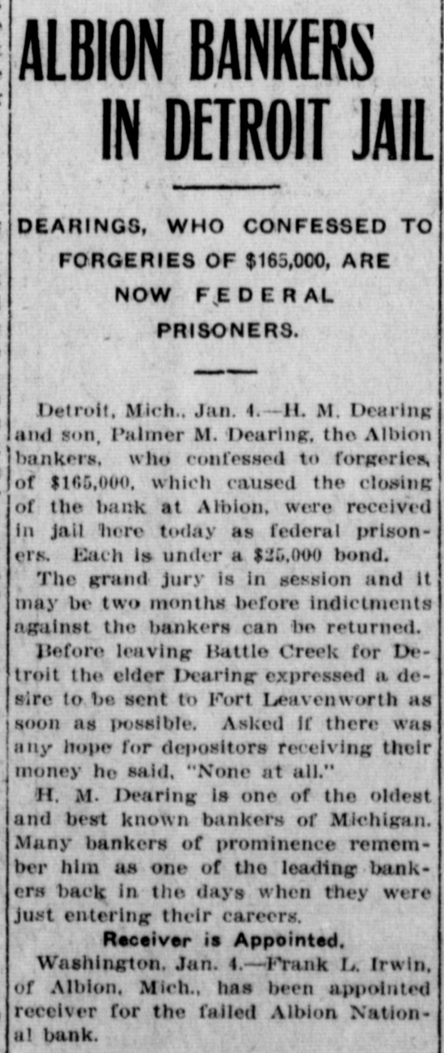 WOULD TO GOD THAT THAD BEEN DISCOVERED WHEN MY THIEVINGS WERE SMALL -HENRY M. DEARING. "Now I'm Utterly Ruined," Wails Albion Bank Wrecker, Starting For Prison EXAMINERS WERE EASY Says Government Should Ap1 point Competent Men Who Can Detect Crookedness Henry M. Dearing, aged 73 years, former cashier of the National bank of Albion, before leaving Detroit, Wednesday morning, in company with his son, Palmer, for the federal penitentiary in Leavenworth, Kas., to which they were sentenced for five years by Judge Angell, gave out a statement to The Times in which he analyzed the cause ef his downfall, the wreck of the bank and the loss of approximately $150,000 to depositors. 'Not overlooking his own responsibility in the affair, the elder Dearing held the lax system of the government in conducting examinations of the smaller banks to blame for the fact that the bank was completely ruined before detection came. The defalcations extended over period of nearly 11 years and examinations were supposed to have been made twice yearly, but the government examiners did not learn the true condition of affairs until the elder Dearing confessed everything. "Would to God, he cried, "that I had been discovered when my thievings were small. I would have suffered, know, but not as I have suffered, and could have made amends. Now I have lost everything, all my friends, all my money am utterly ruined, and, as though that were not enough burden, I have always before me the knowledge that I took my son down with me, my son, for whom I should have set a better example. The old man's slight frame trembled, he leaned against the bars of his cell for support, a mist came before his pale, blue eyes. His thin, white hair and furrowed forehead added to the picture of age and despair. Points to a Lesson. "There is one lesson I would like to draw for the world in my failure, he continued, and the reporter expect ed to hear the old, threadbare moral, "Don't begin. But the lesson was more practical. Dearing went on "The first necessary step for stopping such a theft as the one which am guilty is the elimination of political considerations in the appointment of our national bank examiners. Men should be appointed who have long practical experience in bank affairs, men who understand the running of banks and who can be depended on at all time to take pains and make conscientious examinations. "Take my case as an example. I had no trouble, whatever, in covering up my shortages as cashier of the Albion National bank. It was a simple matter and could have been exposed in a simple way If the examiners had gone about it right. I don't think it would be good policy to give the details of just how I covered up the shortages for so long a period; It is best that such things should not be commonly known. Neither do I wish to criticize my superiors in the bank, but I will say that if the smaller banks of our country had such thorough-going business men for directors as have the larger banks in Detroit failures like that of the Albion bank would seldom occur. "I consider the present national bank examiner, H. E. Johnson, thoroughly efficient. He made one examination of the bank prior to the examination made in January, when confessed to having stolen the bank's money. But when he made the for mer examination he was comparative ly new at the business. As for the assistant examiners it was a very easy matter to throw them off the track. They would take too much for granted. Should Pass on Notes. "Another point I want to make is that the examiners should meet with the directors and pass on all notes. The national bank examining department should take more interest in the personnel of the boards of directors and the latter should not be mere figureheads. It is that condition to day which is causing so many bank smashes in this country. If the system were changed the shortages would be detected as soon as they began and the banks could not get hopelessly involved. The government has a moral duty to perform in this mat ter in safeguarding the public, if not in keeping a banker who starts to go wrong from ruin. "Have you ever had a secret in your heart that you felt you could not give up and yet it tortured you so that you almost prayed that it might be revealed? That is the way I felt for years, until it got to a point where I was glad when the examiner got suspicious and closed the bank. I might have held off. I might, even, have attempted to allay his suspicion, possibly, thrown him entirely off the scent, but it had come to such a pass shat I felt a sense of relief when caught. I even told the examiner his suspicions were well-founded and con fessed everything. Study for Psychologists. Dearing's case is study for psy chologists. Going back to its Incep tion the story concerns an ambitious promoter, how he got the Dearings in terested in a gasoline engine enter prise and how, to use the language of the son, "we built too much on our hopes.' The elder Dearing went to Albion in 1855, and conducted a store there for about 17 years. He wanted to go to war in 1861 but he was physically unfit. He joined the National bank staff in 1877. His first wife died in 1888, and he now has a wife about 40 years of age, who is left to shift for Irerself with their youngest son, aged four years. His wife had about $90 on deposit in the bank and she will receive her proportion of what is left the receiver having estimated tha the depositors will receive about 5 cents on the dollar. which means that