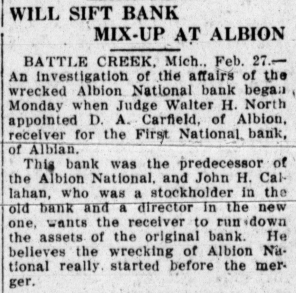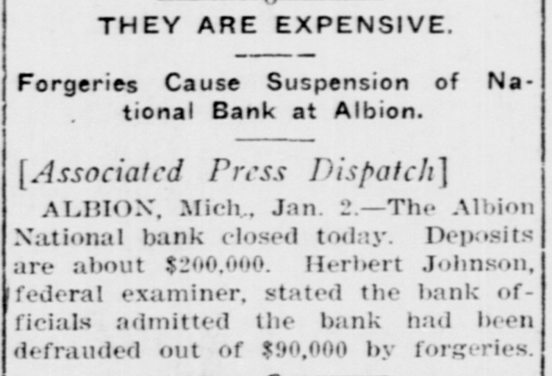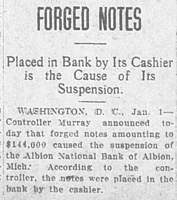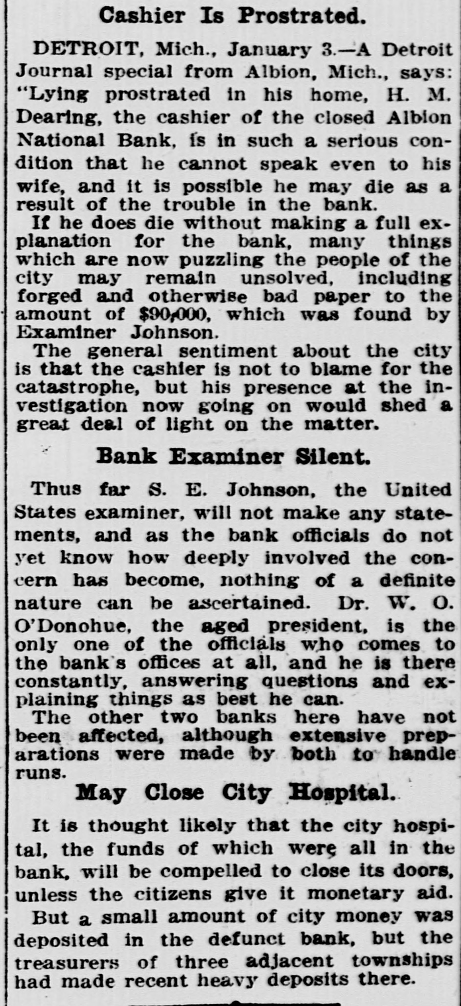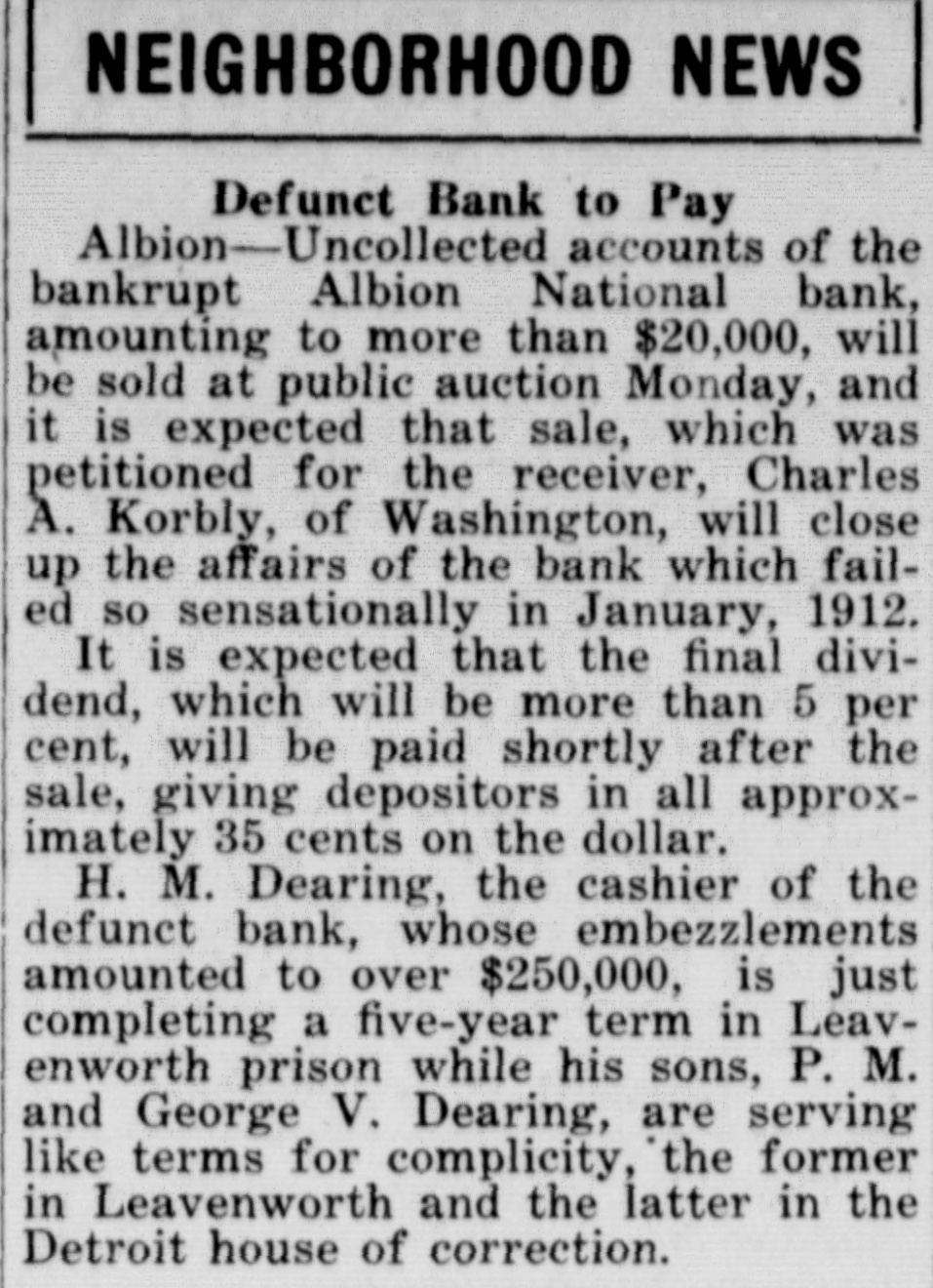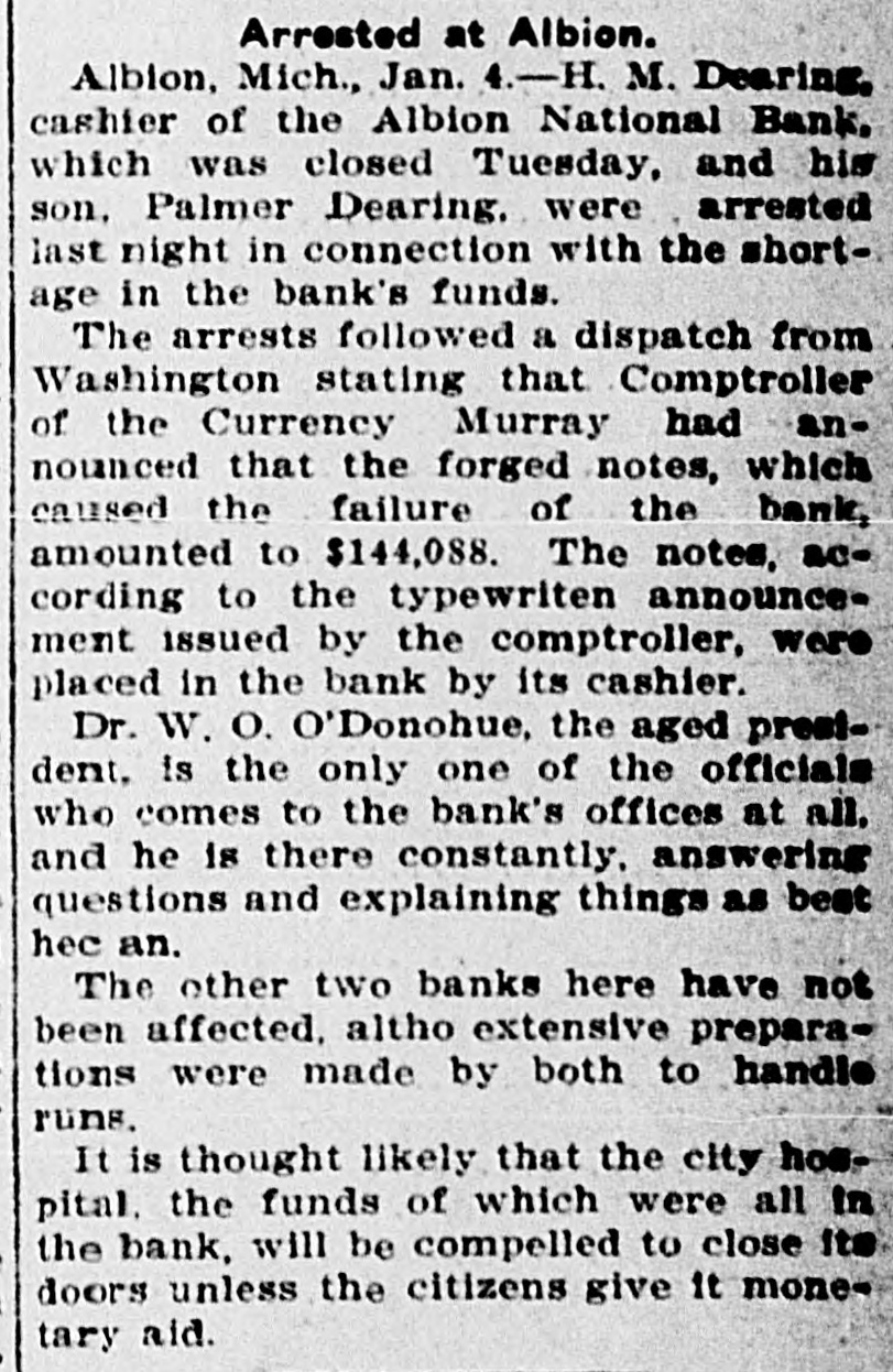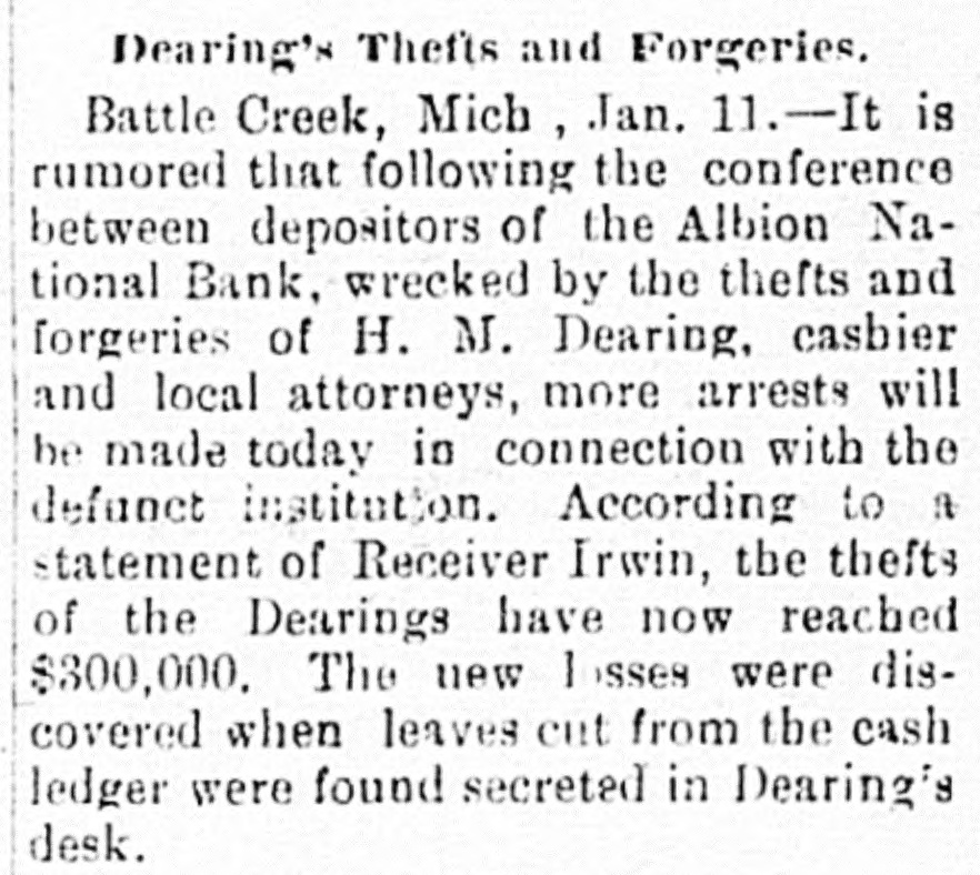 WOULD TO GOD THAT THAD BEEN DISCOVERED WHEN MY THIEVINGS WERE SMALL -HENRY M. DEARING. "Now I'm Utterly Ruined," Wails Albion Bank Wrecker, Starting For Prison EXAMINERS WERE EASY Says Government Should Ap1 point Competent Men Who Can Detect Crookedness Henry M. Dearing, aged 73 years, former cashier of the National bank of Albion, before leaving Detroit, Wednesday morning, in company with his son, Palmer, for the federal penitentiary in Leavenworth, Kas., to which they were sentenced for five years by Judge Angell, gave out a statement to The Times in which he analyzed the cause ef his downfall, the wreck of the bank and the loss of approximately $150,000 to depositors. 'Not overlooking his own responsibility in the affair, the elder Dearing held the lax system of the government in conducting examinations of the smaller banks to blame for the fact that the bank was completely ruined before detection came. The defalcations extended over period of nearly 11 years and examinations were supposed to have been made twice yearly, but the government examiners did not learn the true condition of affairs until the elder Dearing confessed everything. "Would to God, he cried, "that I had been discovered when my thievings were small. I would have suffered, know, but not as I have suffered, and could have made amends. Now I have lost everything, all my friends, all my money am utterly ruined, and, as though that were not enough burden, I have always before me the knowledge that I took my son down with me, my son, for whom I should have set a better example. The old man's slight frame trembled, he leaned against the bars of his cell for support, a mist came before his pale, blue eyes. His thin, white hair and furrowed forehead added to the picture of age and despair. Points to a Lesson. "There is one lesson I would like to draw for the world in my failure, he continued, and the reporter expect ed to hear the old, threadbare moral, "Don't begin. But the lesson was more practical. Dearing went on "The first necessary step for stopping such a theft as the one which am guilty is the elimination of political considerations in the appointment of our national bank examiners. Men should be appointed who have long practical experience in bank affairs, men who understand the running of banks and who can be depended on at all time to take pains and make conscientious examinations. "Take my case as an example. I had no trouble, whatever, in covering up my shortages as cashier of the Albion National bank. It was a simple matter and could have been exposed in a simple way If the examiners had gone about it right. I don't think it would be good policy to give the details of just how I covered up the shortages for so long a period; It is best that such things should not be commonly known. Neither do I wish to criticize my superiors in the bank, but I will say that if the smaller banks of our country had such thorough-going business men for directors as have the larger banks in Detroit failures like that of the Albion bank would seldom occur. "I consider the present national bank examiner, H. E. Johnson, thoroughly efficient. He made one examination of the bank prior to the examination made in January, when confessed to having stolen the bank's money. But when he made the for mer examination he was comparative ly new at the business. As for the assistant examiners it was a very easy matter to throw them off the track. They would take too much for granted. Should Pass on Notes. "Another point I want to make is that the examiners should meet with the directors and pass on all notes. The national bank examining department should take more interest in the personnel of the boards of directors and the latter should not be mere figureheads. It is that condition to day which is causing so many bank smashes in this country. If the system were changed the shortages would be detected as soon as they began and the banks could not get hopelessly involved. The government has a moral duty to perform in this mat ter in safeguarding the public, if not in keeping a banker who starts to go wrong from ruin. "Have you ever had a secret in your heart that you felt you could not give up and yet it tortured you so that you almost prayed that it might be revealed? That is the way I felt for years, until it got to a point where I was glad when the examiner got suspicious and closed the bank. I might have held off. I might, even, have attempted to allay his suspicion, possibly, thrown him entirely off the scent, but it had come to such a pass shat I felt a sense of relief when caught. I even told the examiner his suspicions were well-founded and con fessed everything. Study for Psychologists. Dearing's case is study for psy chologists. Going back to its Incep tion the story concerns an ambitious promoter, how he got the Dearings in terested in a gasoline engine enter prise and how, to use the language of the son, "we built too much on our hopes.' The elder Dearing went to Albion in 1855, and conducted a store there for about 17 years. He wanted to go to war in 1861 but he was physically unfit. He joined the National bank staff in 1877. His first wife died in 1888, and he now has a wife about 40 years of age, who is left to shift for Irerself with their youngest son, aged four years. His wife had about $90 on deposit in the bank and she will receive her proportion of what is left the receiver having estimated tha the depositors will receive about 5 cents on the dollar. which means that