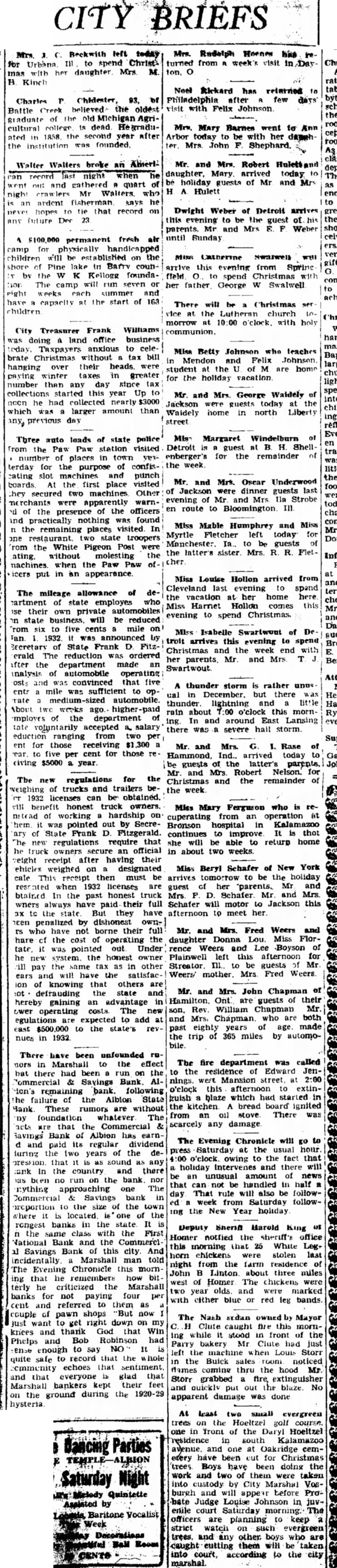 Dwight Weber of Detroit arrives this evening to be the guest of his parents. Mr and Mrs E. F Weber until Sunday arrive this evening from Spring field O. to spend Christmas with her father George W Swalwell