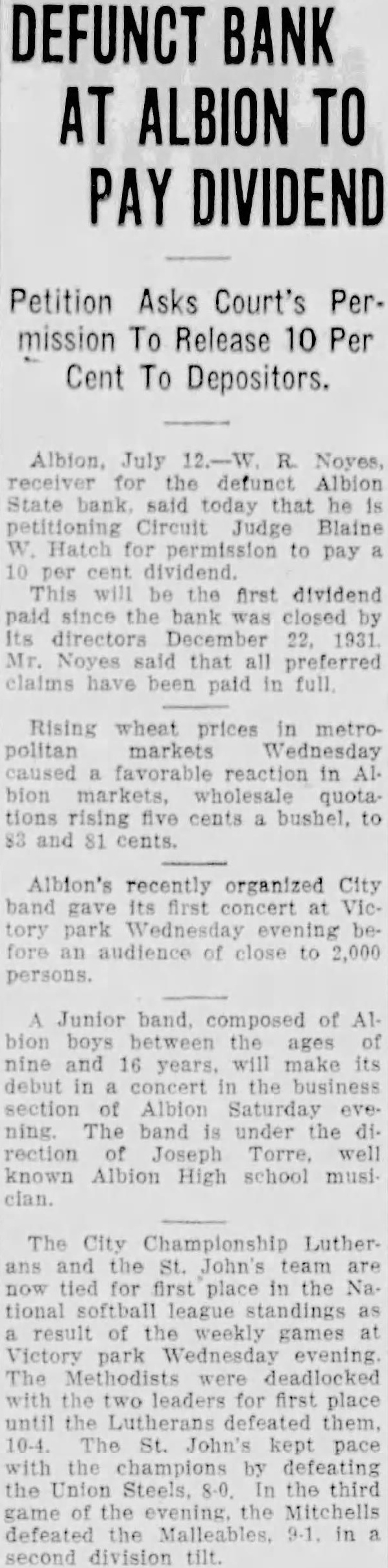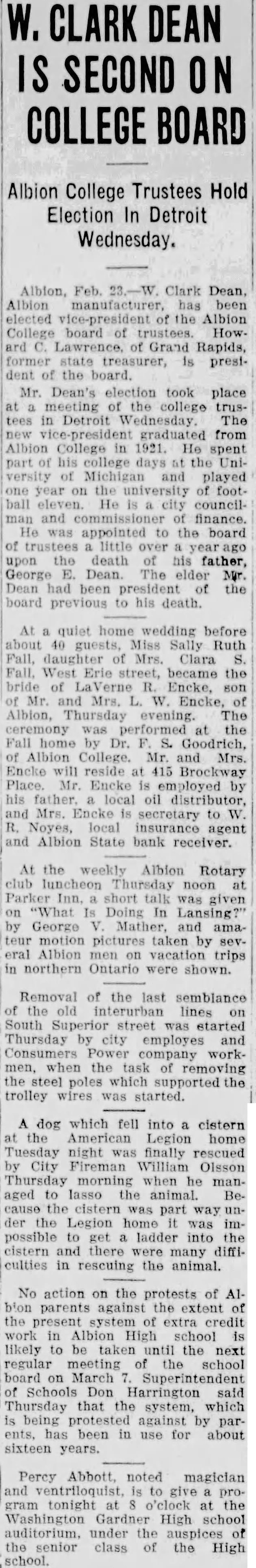 CLARK DEAN IS SECOND ON COLLEGE BOARD Albion College Trustees Hold Election In Detroit Wednesday. Albion, Feb. Clark Dean, Albion manufacturer, has been elected vice-president of the Albion College board of trustees. Howard Lawrence, of Grand Rapids, former state treasurer, is president the board. Mr. Dean's election took place meeting of the college trustees in Detroit Wednesday. The graduated from Albion College in 1921. He spent part his college days the University Michigan and played year on the university of football eleven. He is city counciland commissioner of finance. He appointed to the board trustees little over upon death of his father, George The Mr. Dean been of the board to his death. At quiet home wedding before about 40 Sally Ruth Fall, of Mrs. Clara Fall. West Erie street, became the bride of Encke, son Mr Mrs. W. Encke, Albion, evening. was performed at the Fall home by Dr. S. Goodrich, Albion College. Mr. and Mrs. Encke reside at 415 Brockway Place. Mr Encke is employed by his father. local oil distributor, and Mrs. secretary to W. R. Noyes, local insurance agent and Albion State bank receiver. At the weekly Albion Rotary club noon at Parker Inn. short talk was given on "What Doing In Lansing by George Mather, and amateur motion taken by several Albion on vacation trips in northern Ontario were shown. Removal of the last semblance the lines South Superior street was started Thursday by city employes and Consumers Power workmen, when the of removing the steel which supported the trolley wires was started. A dog which fell into a cistern the American Legion home Tuesday night was finally rescued City Fireman William Olsson Thursday when managed animal. Because the cistern was part way unLegion home was impossible ladder into the cistern and there were many difficulties in rescuing the animal. No action on the protests of Albion parents against the extent of the present system extra credit work Albion High school likely to taken until the next regular meeting of school board on March Superintendent Schools Don Harrington said Thursday that the system, which is being protested against by parents, has been in use for about sixteen years. Percy Abbott, noted magician and ventriloquist, is to program tonight at o'clock the Washington Gardner High school auditorium. under the auspices the senior class of the High