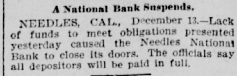 A National Bank Suspends. NEEDLES, CAL., December 13.-Lack of funds to meet obligations presented yesterday caused the Needles National Bank to close its doors. The officials say all depositors will be paid in full.