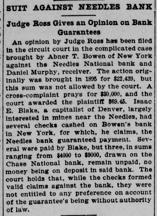 # SUIT AGAINST NEEDLES BANK Judge Ross Gives an Opinion on Bank Guarantees An opinion by Judge Ross has been filed in the circuit court in the complicated case brought by Abner T. Bowen of New York against the Needles National bank and Daniel Murphy, receiver. The action originally was brought in 1895 for $22,439, but this sum was not allowed by the court. A cross-complaint prays for $30,000, and the court awarded the plaintiff $69.45. Isaac E. Blake, a capitalist of Denver, largely interested in mines near the Needles, had several checks cashed on Bowen's bank in New York, for which, he claims, the Needles bank guaranteed payment. Several were paid by Blake, but three, in sums ranging from $4000 to $9000, drawn on the Chase National bank, remain unpaid, no money being on deposit in said bank. The court holds that, while the checks formed valid claims against the bank, they were not entitled to any preference on account of the guarantee's being without authority of law.