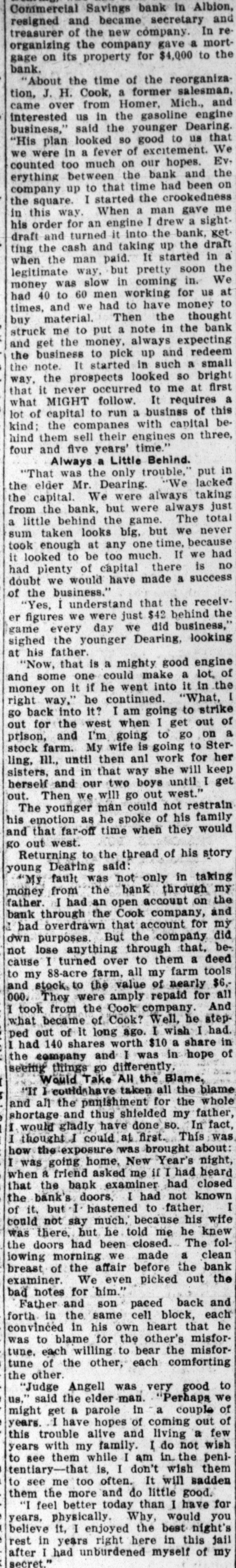 Commercial Savings bank in Albion, resigned and became secretary and treasurer of the new company. In re-organizing the company gave a mortgage on its property for $4,000 to the bank. "About the time of the reorganization, J. H. Cook, a former salesman, came over from Homer, Mich., and interested us in the gasoline engine business," said the younger Dearing. "His plan looked so good to us that we were in a fever of excitement. We counted too much on our hopes. Everything between the bank and the company up to that time had been on the square. I started the crookedness in this way. When a man gave me his order for an engine I drew a sight-draft and turned it into the bank, getting the cash and taking up the draft when the man paid. It started in a legitimate way, but pretty soon the money was slow in coming in. We had 40 to 60 men working for us at times, and we had to have money to buy material. Then the thought struck me to put a note in the bank and get the money, always expecting the business to pick up and redeem the note. It started in such a small way, the prospects looked so bright that it never occurred to me at first what MIGHT follow. It requires a lot of capital to run a businss of this kind; the companes with capital behind them sell their engines on three, four and five years' time." ### Always a Little Behind. "That was the only trouble," put in the elder Mr. Dearing. "We lacked the capital. We were always taking from the bank, but were always just a little behind the game. The total sum taken looks big, but we never took enough at any one time, because it looked to be too much. If we had had plenty of capital there is no doubt we would have made a success of the business." "Yes, I understand that the receiver figures we were just $42 behind the game every day we did business," sighed the younger Dearing, looking at his father. "Now, that is a mighty good engine and some one could make a lot of money on it if he went into it in the right way," he continued. "What, I go back into it? I am going to strike out for the west when I get out of prison, and I'm going to go on a stock farm. My wife is going to Sterling, Ill., until then anl work for her sisters, and in that way she will keep herself and our two boys until I get out. Then we will go out west." The younger man could not restrain his emotion as he spoke of his family and that far-off time when they would go out west. Returning to the thread of his story young Dearing said: "My fault was not only in taking money from the bank through my father. I had an open account on the bank through the Cook company, and had overdrawn that account for my own purposes. But the company did not lose anything through that, because I turned over to them a deed to my 88-acre farm, all my farm tools and stock, to the value of nearly $6,000. They were amply repaid for all I took from the Cook company. And what became of Cook? Well, he stepped out of it long ago. I wish I had. I had 140 shares worth $10 a share in the company and I was in hope of seeing things go differently. ### Would Take All the Blame, "If I could have taken all the blame and all the punishment for the whole shortage and thus shielded my father, I would gladly have done so. In fact, I thought I could at first. This was how the exposure was brought about: I was going home, New Year's night, when a friend asked me if I had heard that the bank examiner had closed the bank's doors, I had not known of it, but I hastened to father. I could not say much, because his wife was there, but he told me he knew the doors had been closed. The following morning we made a clean breast of the affair before the bank examiner. We even picked out the bad notes for him." Father and son paced back and forth in the same cell block, each convinced in his own heart that he was to blame for the other's misfortune, each willing to bear the misfortune of the other, each comforting the other. "Judge Angell was very good to us," said the elder man. "Perhaps we might get a parole in a couple of years. I have hopes of coming out of this trouble alive and living a few years with my family. I do not wish to see them while I am in the penitentiary-that is, I don't wish them to see me too often. It will sadden them the more and do little good. "I feel better today than I have for years, physically. Why, would you believe it, I enjoyed the best night's rest in years right here in this jail after I had unburdened myself of my secret."