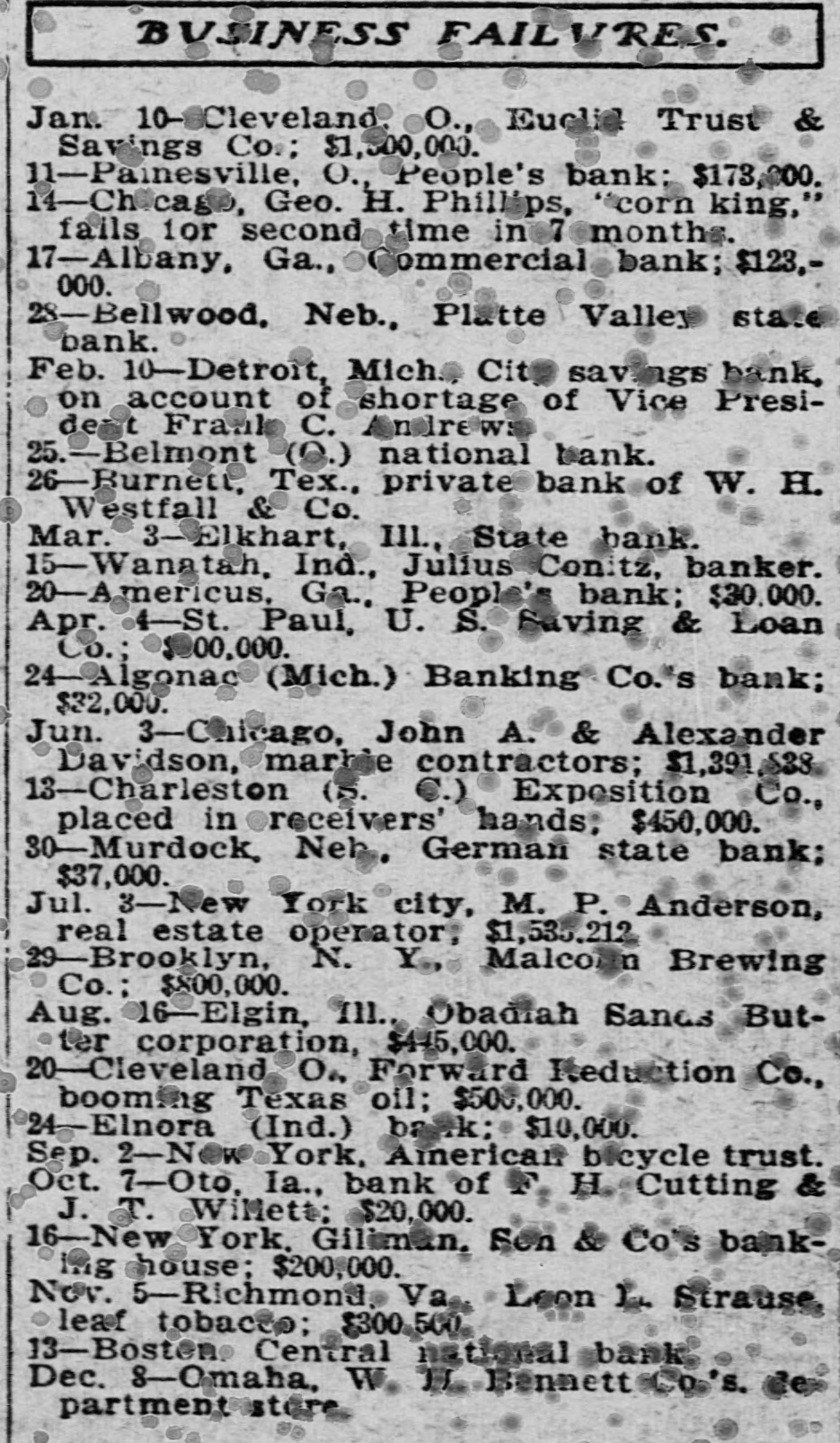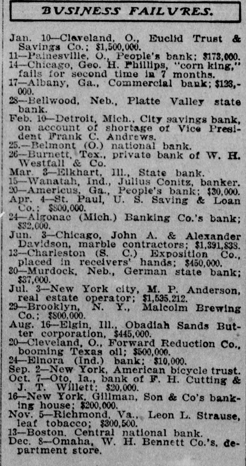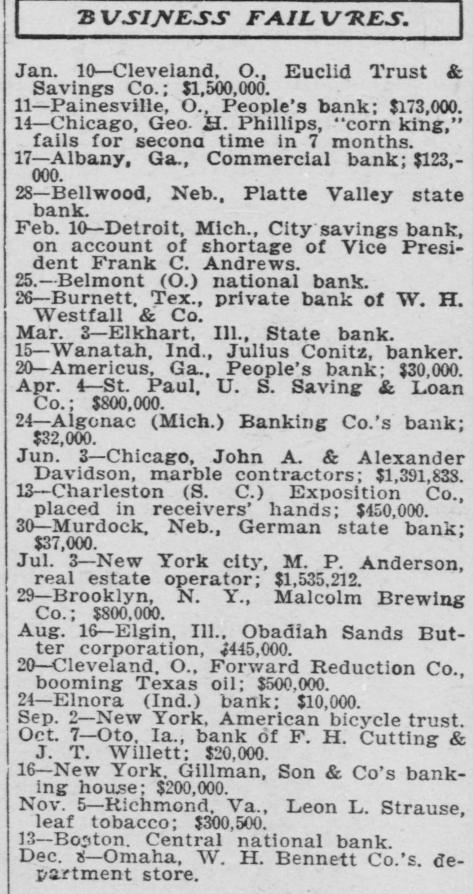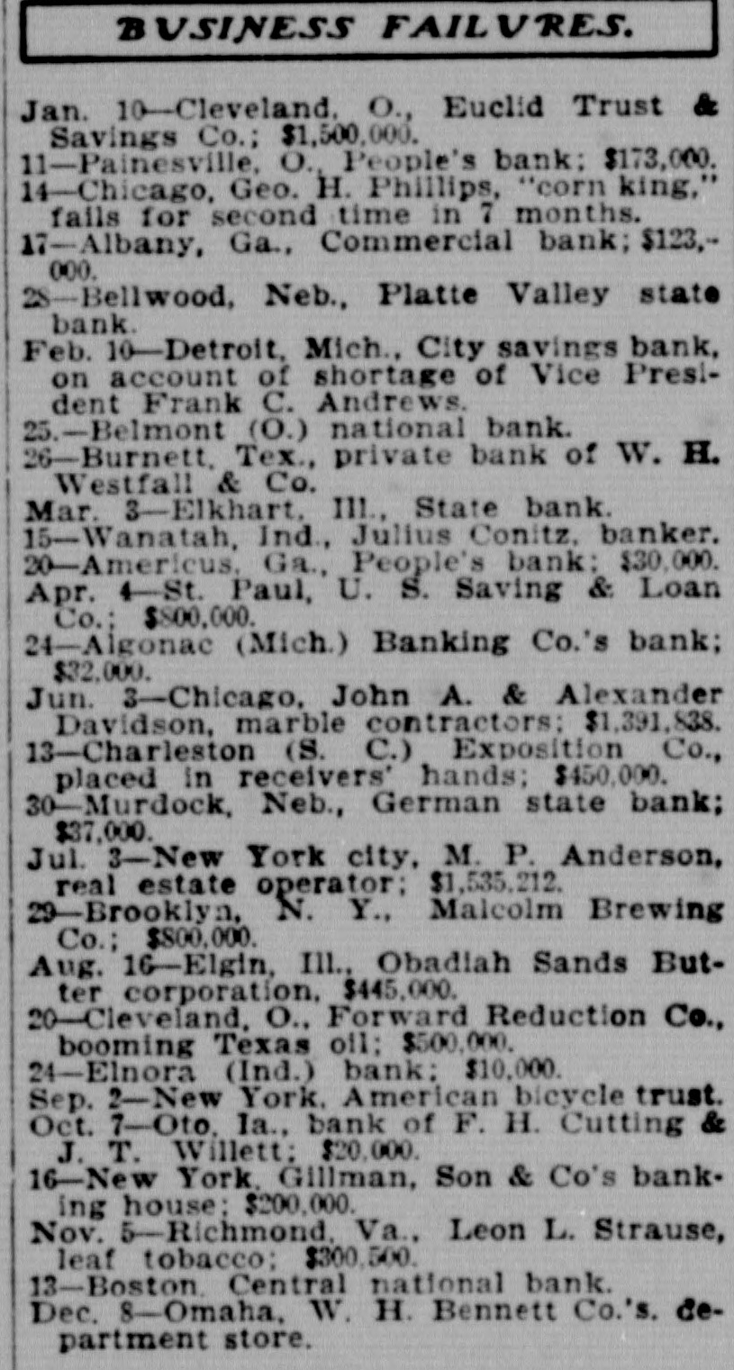 BUSINESS FAILURES. Jan. 10-Cleveland, O., Euclid Trust & Savings Co.: $1,500,000. 11-Painesville, O., People's bank: $173,000. 14-Chicago, Geo. H. Phillips, "corn king," fails for second time in 7 months. 17-Albany, Ga., Commercial bank; $123,000. 28-Bellwood, Neb., Platte Valley state bank. Feb. 10-Detroit, Mich., City savings bank, on account of shortage of Vice President Frank C. Andrews. 25.-Belmont (O.) national bank. 26-Burnett, Tex., private bank of W. H. Westfall & Co. Mar. 3-Elkhart, III., State bank. 15-Wanatah, Ind., Julius Conitz, banker. 20-Americus, Ga., People's bank: $30,000. Apr. 4-St. Paul, U. S. Saving & Loan Co.: $800,000. 24-Algonac (Mich.) Banking Co.'s bank; $32,000. Jun. 3-Chicago, John A. & Alexander Davidson, marble contractors; $1,391,838. 13-Charleston (S. C.) Exposition Co., placed in receivers' hands; $450,000. 30-Murdock, Neb., German state bank; $37,000. Jul. 3-New York city, M. P. Anderson, real estate operator; $1,535,212. 29-Brooklyn, N. Y., Malcolm Brewing Co.: $800,000. Aug. 16-Elgin, Ill., Obadiah Sands Butter corporation, $445,000. 20-Cleveland, O., Forward Reduction Co., booming Texas oil; $500,000. 24-Elnora (Ind.) bank: $10,000. Sep. 2-New York, American bicycle trust. Oct. 7-Oto, Ia., bank of F. H. Cutting & J. T. Willett: $20,000. 16-New York, Gillman, Son & Co's banking house: $200,000. Nov. 5-Richmond, Va., Leon L. Strause, leaf tobacco; $300,500. 13-Boston. Central national bank. Dec. 8--Omaha, W. H. Bennett Co.'s. department store.