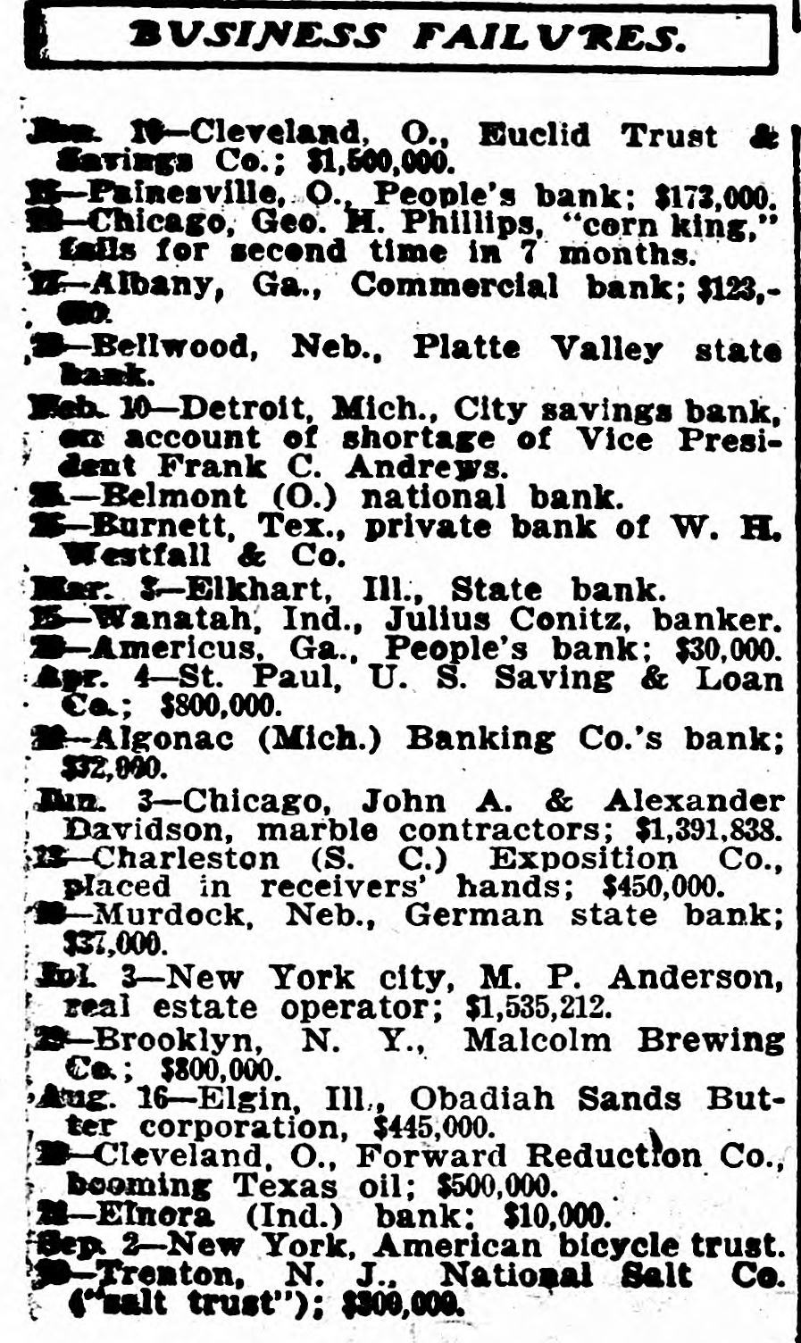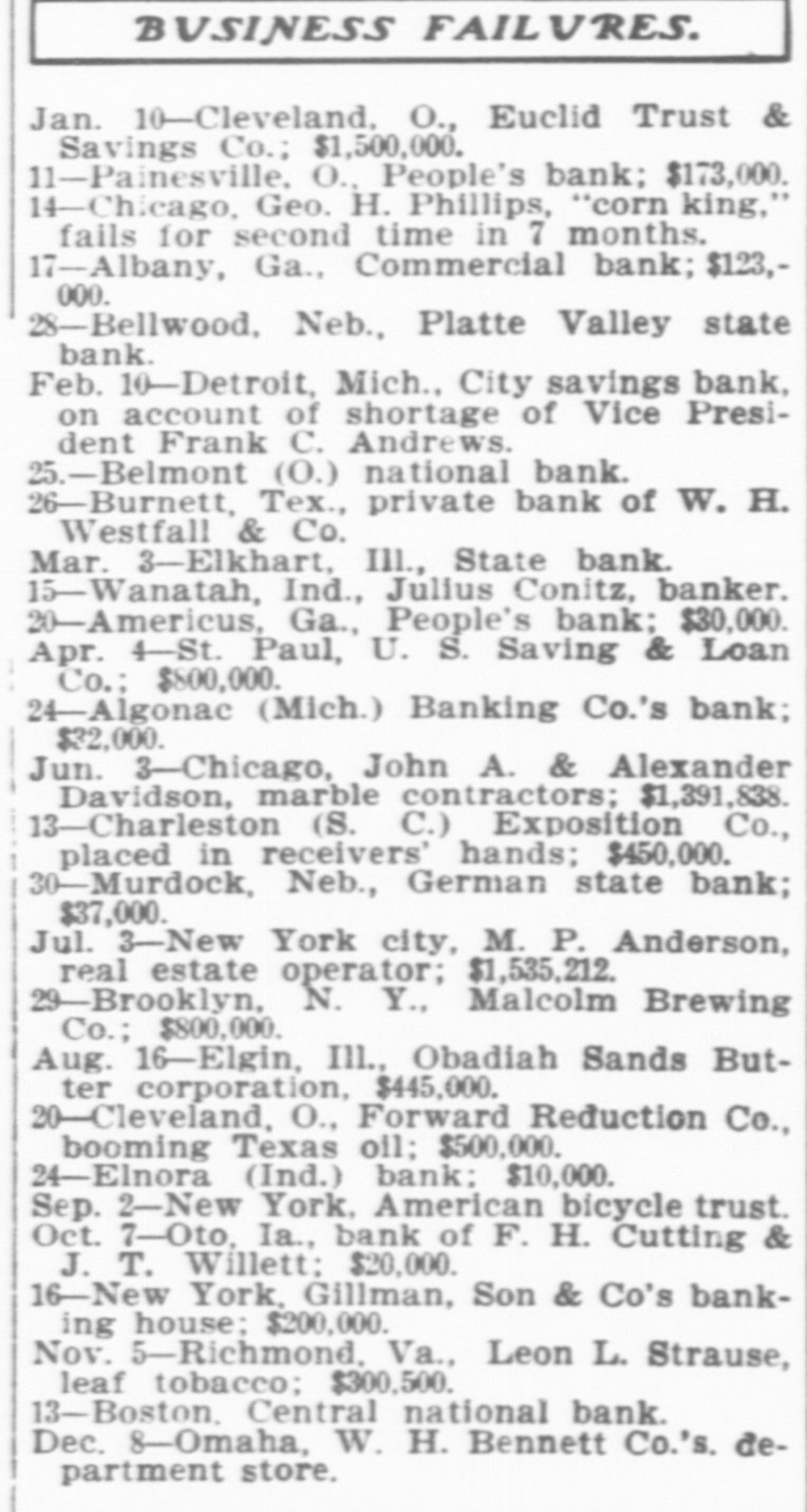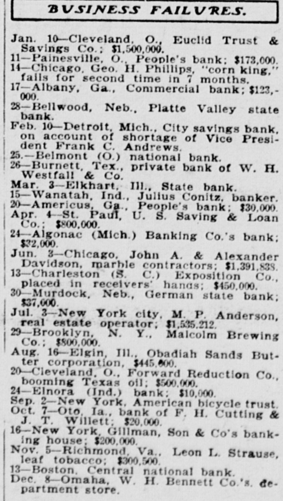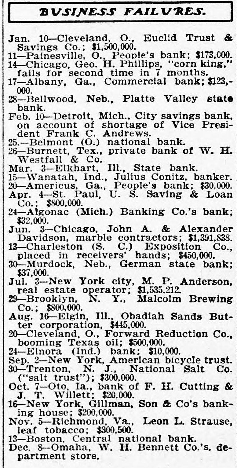 BUSINESS FAILURES. Jan. 10- Cleveland O., Euclid Trust & Savings Co.; $1,500,000. 11-Painesville, O., People's bank: $173,000. 14-Ch cago, Geo. H. Phill ps, corn king," fails 1or second time in 7 months. 17-Albany, Ga., Commercial bank; $123,000. 28-Bellwood, Neb., Platte Valley state bank. Feb. 10-Detroit, Mich Cit sav ags bank, on account of shortage of Vice Presidest Frank C. Andrews 25.-Belmont (0.) national bank. 26-Rurnett, Tex., private bank of W. H. Westfall & Co. Mar. 3- Elkhart, III., State bank. 15-Wanatah, Ind., Julius Conitz, banker. 20-Americus, Ga., People's bank; $30,000. Apr. 4-St. Paul, U. S. Saving & Loan Co.; $ 00,000. 24-Algonac (Mich.) Banking Co."s bank; $32,000. Jun. 3-Chicago, John A. & Alexander Davidson, marbie contractors; $1,391,538 13-Charleston (S. C.) Exposition Co., placed in receivers' hands, $450,000. 30-Murdock, Neh, German state bank; $37,000. Jul. 3-New York city, M. P. Anderson, real estate operator, $1,535,212 29-Brooklyn, N. Y,, Malco n Brewing Co.; $800,000. Aug. 16-Elgin, III., Obadiah Sands Butter corporation, $445,000. 20-Cleveland On Forward Reduction Co., booming Texas oil; $500,000. 24-Elnora (Ind.) bank; $10,000. Sep. 2-No York, American blcycle trust. Oct. 7-Oto, Ia., bank of F H Cutting & J. T. Willett: $20,000. 16-New York, Giliman. Sen & Co's banking house; $200,000. Nov. 5-Richmond Va Leon L. Strause leaf tobacco; $300,500 13-Bosten Central national bank Dec. 8-Omaha, W. 11 Bennett Co's. department store