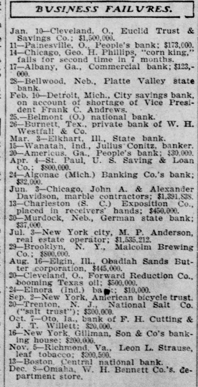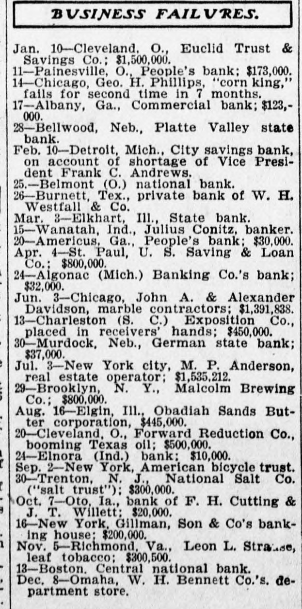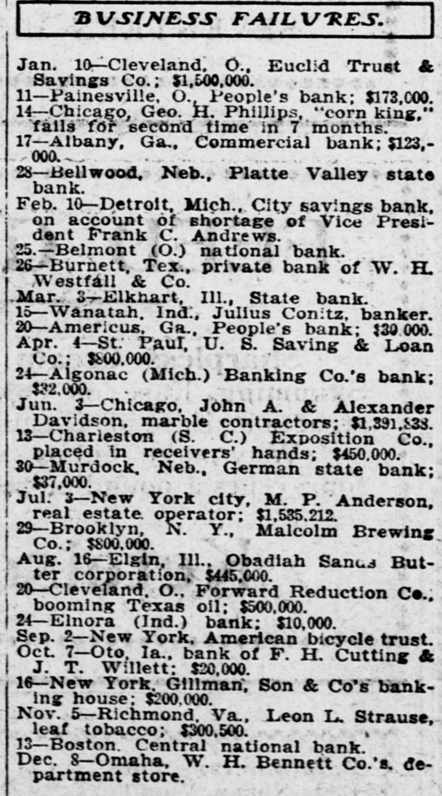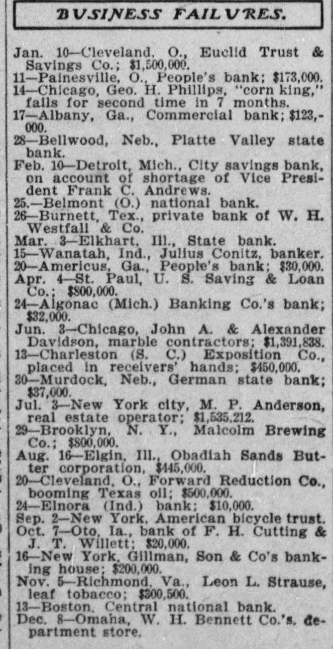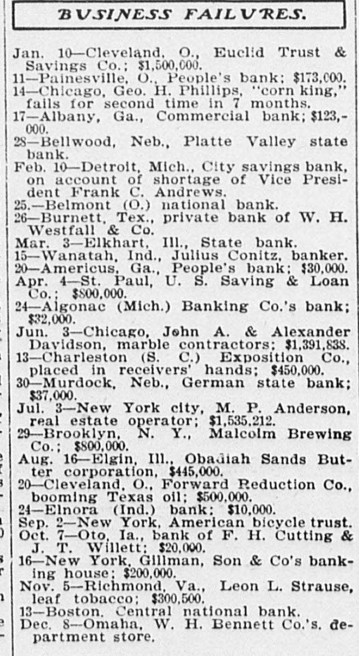 : BUSINESS FAILVRES. Jan. 10-Cleveland, O., Euclid Trust & Savings Co.; $1,500,000. 11-Painesville, O., People's bank: $173,000. 14-Chicago, Geo. H. Phillips, "corn king," fails for second time in 7 months. 17-Albany, Ga., Commercial bank; $123,000. 28-Bellwood, Neb., Platte Valley state bank. Feb. 10-Detroit, Mich., City savings bank, on account of shortage of Vice President Frank C. Andrews. 25.-Belmont (O.) national bank. 26-Burnett, Tex., private bank of W. H. Westfall & Co. Mar. 3-Elkhart, III., State bank. 15-Wanatah, Ind., Julius Conitz. banker. 20-Americus. Ga., People's bank; $30,000. Apr. 4-St. Paul, U. S. Saving & Loan Co.: $800,000. 24-Algonac (Mich.) Banking Co.'s bank; $32,000. Jun. 3-Chicago, John A. & Alexander Davidson, marble contractors; $1,391,838. 13-Charleston (S. C.) Exposition Co., placed in receivers' hands; $450,000. 30-Murdock, Neb., German state bank; $37,000. Jul. 3-New York city, M. P. Anderson, real estate operator; $1,535,212. 29-Brooklyn, N. Y., Malcolm Brewing Co.; $800,000. Aug. 16-Elgin, III., Obadiah Sands Butter corporation, $445,000. 20-Cleveland, O., Forward Reduction Co., booming Texas oil; $500,000. 24-Elnora (Ind.) ba $10,000. Sep. 2-New York, American bicycle trust. 20-Trenton, N. J., National Salt Co. ("salt trust"): $300,000. Oct. 7-Oto. la., bank of F. H. Cutting & J. T. Willett: $20,000. 16-New York, Gillman, Son & Co's banking house: $200,000. Nov. 5-Richmond, Va., Leon L. Strause, leaf tobacco: $300,500. 13-Boston Central national bank. Dec. S-Omaha, W. H. Bennett Co.'s. department store.