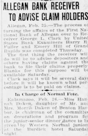 ALLEGAN BANK RECEIVER TO ADVISE CLAIM HOLDERS Bank of Allegan over United Bank Harry Hill of Grand the do the be be several be what is claims. In Charge of Normal Fete. Feb. Miss Mr Benton Har the committee bor is and on the -senior dinner to be Normal at hotel Saturday night
