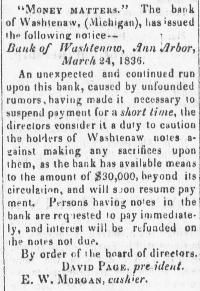 "MONEY MATTERS." The bank of Washtenaw, (Michigan), has issued the following notice-Bank of Washtenaw, Ann Arbor, March 24, 1836. An unexpected and continued run upon this bank, caused by unfounded rumors, having made it necessary 10 suspend payment for a short lime, the directors consider it a duty to caution the holders of Washtenaw notes against making any sacrifices upon them, as the bank has available means to the amount of $30,000, beyond its circulation, and will SOOO resume pay ment. Persons having notes in the bank are req ested 10 pay immediate. ly, and interest will be refunded on the notes not due. By order of the board of directors. DAVID PAGE. pre ident. E. W. MORGAN, cashier.