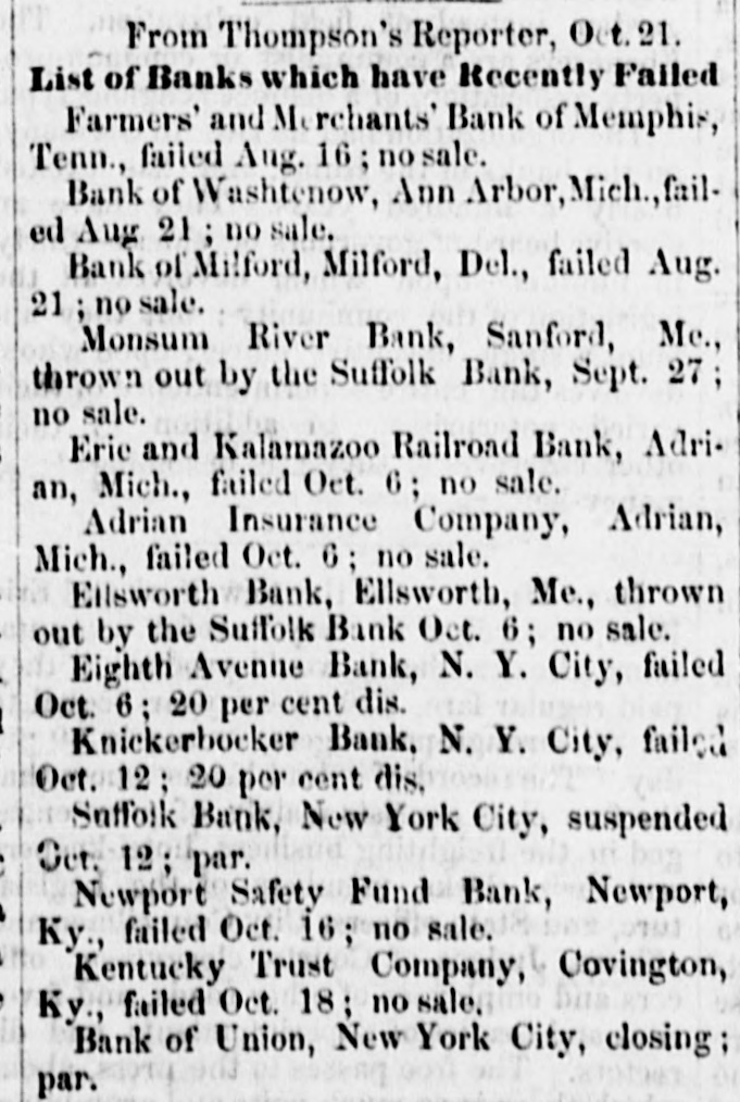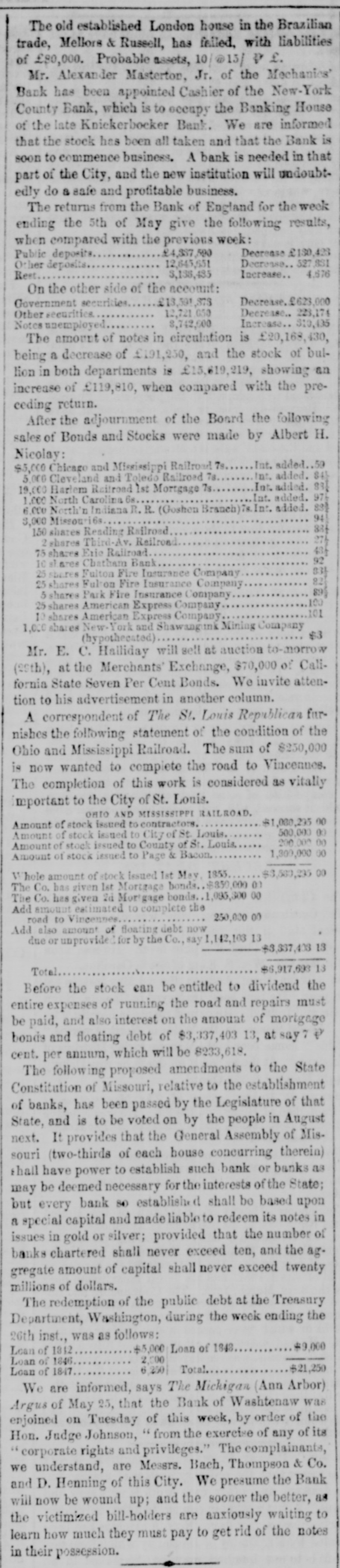 The old established London house in the Brazilian trade, Mellors & Russell, has failed, with liabilities of £80,000. Probable assets, 10/@15/ P £. Mr. Alexander Masterton, Jr. of the Mechanics' Bank has been appointed Cashier of the New-York County Bank, which is to occupy the Banking House of the late Knickerbocker Bank. We are informed that the stock has been all taken and that the Bank is soon to commence business. A bank is needed in that part of the City, and the new institution will undoubtedly do & safe and profitable business. The returns from the Bank of England for the week ending the 5th of May give the following results, when compared with the previous week: Decrease £180,423 £4,387,590 Public deposits Decrease.. 527,881 12,645,651 Other deposits Increase. 4,676 3,136,485 Rest On the other side of the account: Decrease. £623,000 £13,591,873 Government securities. Decrease., 223,174 12,721,050 Other securities. Increase. 310,495 8,742,600 Notes unemployed The amount of notes in circulation is £20,168,430, being a decrease of £191,250, and the stock of butlion in both departments is £15,619,219, showing an increase of £119,810, when compared with the preceding return. After the adjournment of the Board the following sales of Bonds and Stocks were made by Albert H. Nicolay: Int. added 59 $5,000 Chicago and Mississippi Railroad 7s Int. added. 841 5,000 Cleveland and Toledo Railroed 7a Int. added. 83 19,000 Harlem Reilroad 1st Mortgage 7s Int. added. 97 1,000 North Carolina 6s 6,000 North'n Indiana R. R. (Goshen Branch)7s. added. 83 94 3,000 Missouri6s 834 150 shares Reading Railroad 27! 2 shares Third-Av. Reilroad 484 75 shares Eric Railroad 92 10 ares Chatham Bank 831 25 shares Fulton Fire Insurance Company 82 25 shares Fulson Fire Insurance Company 891 shares Park Fire Insurance Company 100 25 shares American Express Company 101 10 shares American Express Company 1,000 shares New- and Shawangunk Mining Company 23 (hypothecated) Mr. E. C. Halliday will sell at auction to-morrow (29th), at the Merchants' Exchange, $70,000 of California State Seven Per Cent Bonds. We invite attention to his advertisement in another column. A correspondent of The St. Louis Republican furnishes the following statement of the condition of the Ohio and Mississippi Railroad. The sum of $250,000 is now wanted to complete the road to Vincennes. The completion of this work is considered as vitally important to the City of St. Louis. onto AND MISSISSIPPI RAILROAD. $1,080,295.00 Amount of stock issued to contractors. 500,000.00 Amount of stock issued to City of St. Louis. 200,000.00 Amount of stock issued to County of St. Louis. 1,300,000.00 Amount of stock issued to Page & Bacon. $3,580,235.00 Whole amount of stock issued 1st May. 1855 The Co. has given 1st Mortgage bonds. $850,000 00 The Co. has given 2d Mortgage bonds. 1,095,300 00 Add amount estimated to complete the 250,000.00 road to Vincennes. Add also amount of floating debt now due or unprovide for by the Co., say 1,142,103 18 $3,337,403 13 $6,917,693 13 Total Before the stock can be entitled to dividend the entire expenses of running the road and repairs must be paid, and also interest on the amount of mortgage bonds and floating debt of $3,337,403 13, at say P cent. per annum, which will be $233,618. The following proposed amendments to the State Constitution of Missouri, relative to the establishment of banks, has been passed by the Legislature of that State, and is to be voted on by the people in August next. It provides that the General Assembly of Missouri (two-thirds of each house concurring therein) shall have power to establish such bank or banks as may be deemed necessary for theinterests of the State: but every bank 80 establish shall be based upon a special capital and madeliableto redeem its notes in issues in gold or silver; provided that the number of banks chartered shall never exceed ten, and the aggregate amount of capital shall never exceed twenty millions of dollars. The redemption of the public debt at the Treasury Department, Washington, during the week ending the 26th inst., was as follows: $9,000 $5,000 Loan of 1848 Loan of 1812 2,000 Loan of 1846 Total $21,250 6,250 Loan of 1847 We are informed, says The Michigan (Ann Arbor) Argus of May 25, that the Bank of Washtenaw was enjoined on Tuesday of this week, by order of the Hon. Judge Johnson, from the exercise of any of its corporate rights and privileges." The complainants, we understand, are Messrs. Bach, Thompson & Co. and D. Henning of this City. We presume the Bank will now be wound up; and the sooner the better, as the victimized bill-holders are anxiously waiting to learn how much they must pay to get rid of the notes in their possession.