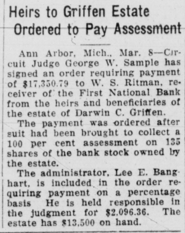 Heirs to Griffen Estate Ordered to Pay Assessment Ann Arbor, Mich., Mar. 8-Circuit Judge George W. Sample has signed an order requiring payment of $17,350.79 to W. S. Ritman, receiver of the First National Bank from the heirs and beneficiaries of the estate of Darwin C. Griffen. The payment was ordered after suit had been brought to collect a 100 per cent assessment on 135 shares of the bank stock owned by the estate. The administrator, Lee E. Banghart, is included in the order requiring payment on a percentage basis He is held responsible in the judgment for $2,096.36. The estate has $13,500 on hand.