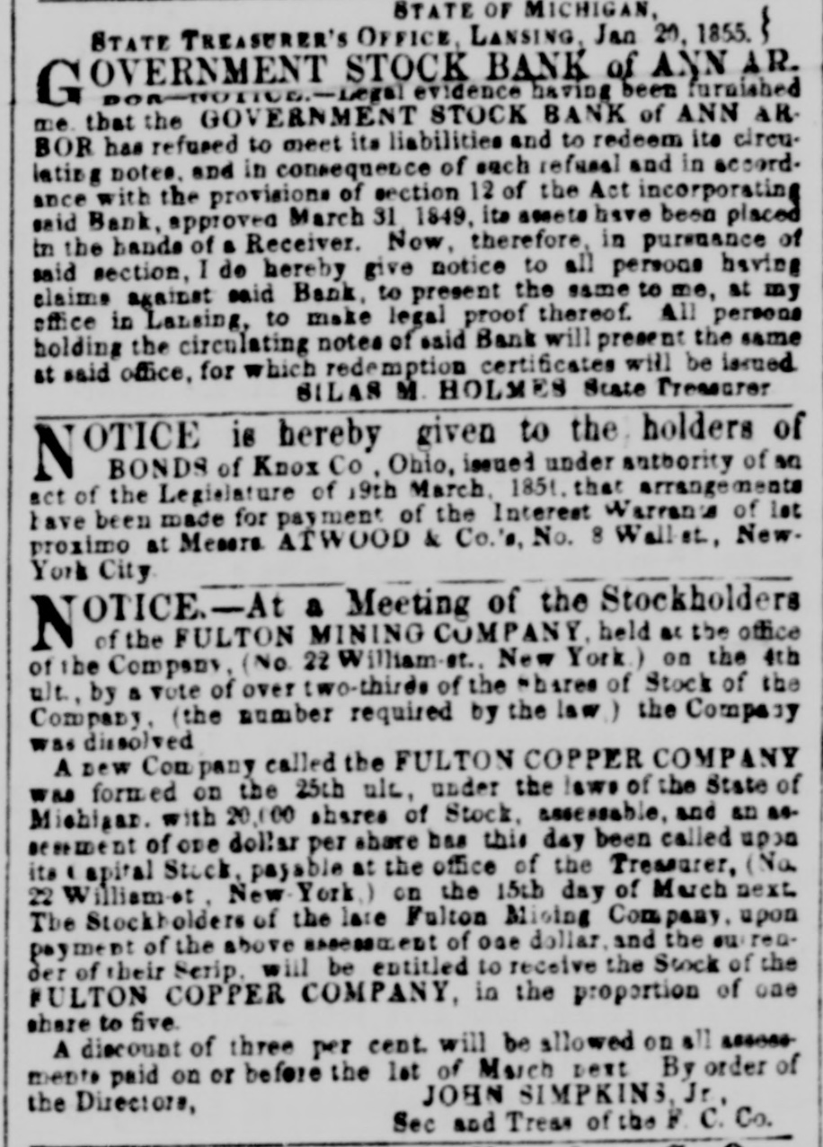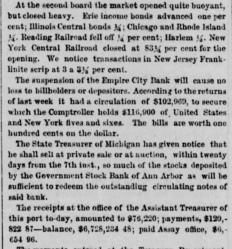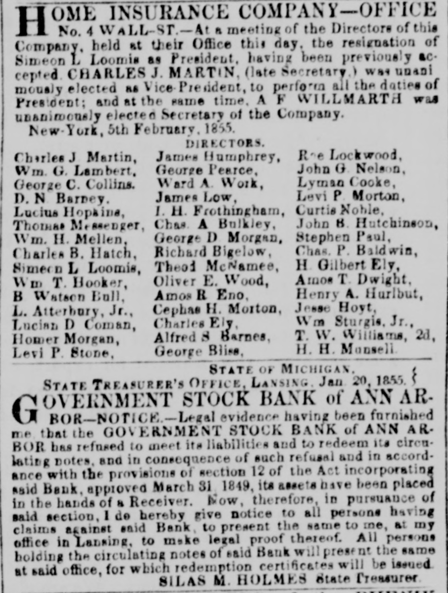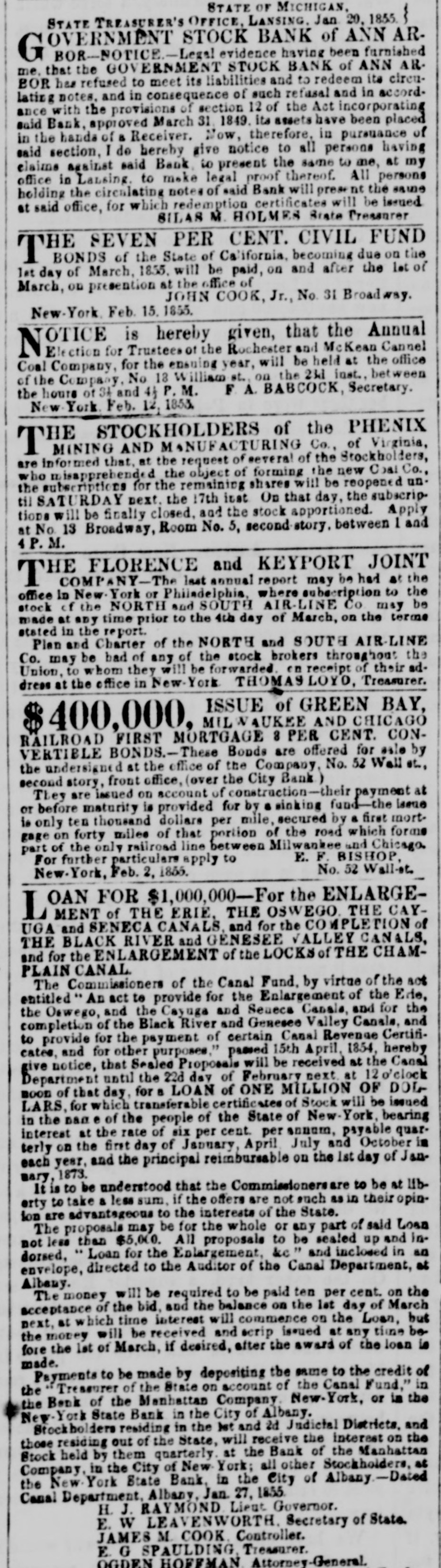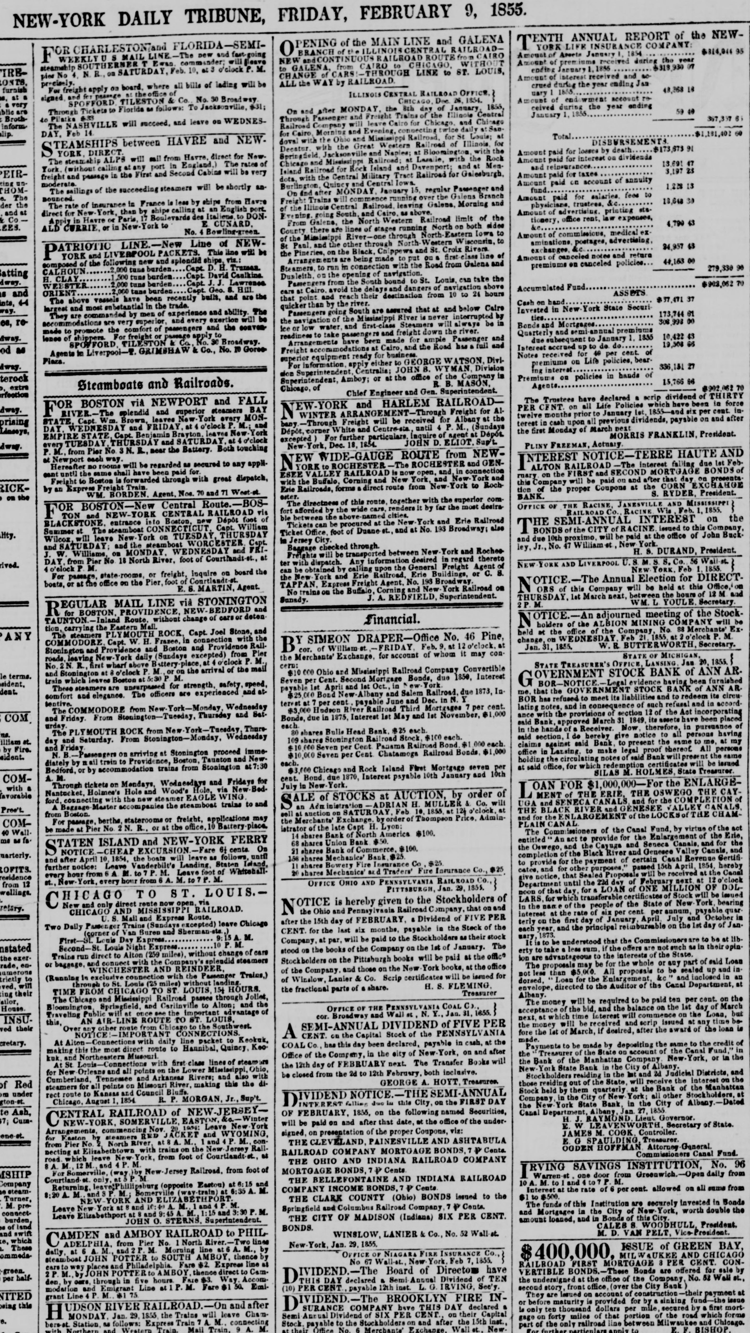 1855. 9, FEBRUARY FRIDAY, TRIBUNE, DAILY NEW-YORK TENTH ANNUAL REPORT of the NEWPENING of the MAIN and GALENA YORK LIFE INSURANCE COMPANY: 95 FOR CHARLESTON|and FLORIDA-SEMI$314,044 BRANCH of CENTRAL RAILROADAmount of Assets Jenuary 1854 NEW AILROAD ROUTE from CAIRO WEEKLY MAIL Ewan. commander; new and will leave 1856 Amount of received during $318,930 the year 07 to GALENA from CAIRO to January ending CHANGE of THROUGH LINE to ST. LOUIS, steamship pier No 4. N. on SATURDAY, Feb. 10, o'clock P. M. Amount of interest received and acALL the WAY by RAILROAD. crued during the year ending Jan 18 furnish 48,368 precisely. For freight apply on board, where all bills of lading will be usry ILLINOIS CENTRAL RAILROAD OFFICE, at Amount of endowment account reCHICAGO, Dec. 26. 1854. signed, and SPOFFORD TILESTON & Co. No. 30 Broadway. very ceived during the year ending 10 On and after MONDAY, the 8th day of January, 1855, Through Tickets to Florida M follows: To Jacksonville, $31; 1855. January BrothThrough Passenger and Freight Trains of the Illinois Central 367,357 Railroad Company will leave Cairo for Chicago, Chicago inform. to The Pilatks NASHVILLE $33 will succeed, and leave on WEDNESfor Cairo, Morning and Evening. daily San. $1,181,402 60 DAY. Feb 14. Total doval with the Ohio and Mississippi Railroad, for St Louis; at DISBURSEMENTS TEAMSHIPS between HAVRE and NEW91 Decatur. with the Great Western Railroad of Illinois, for $173,673 Amount paid for losses by death YORK, DIRECT. Springfield, Jacksonville and Naples; at Bloomington, with the Amount paid for interest on dividends The steamship ALPS will sail from Havre. direct for New13.691 47 Chicago and Mississippi Railroad; at Lasalle, with the Rock and reinsurances York, (without calling at any port in England,) The rates of Island Railroad for Rock Island and Davenport; and at Men3,197 23 taxes for freight and passage in the First and Second Cabins will be very dota, with the Central Military Tract Railroad for Galesburgh, unAmount Amount paid paid on account of annuity Burlington, Quincy and Central Iowa. 1,228 13 fund. The sailings of the succeeding steamers will be shortly anOn and after MONDAY, January 15, regular Passenger and The Amount paid for salaries. fees to 18,648 30 Freight Trains will commence running over the Galena Branch the physicians, trustees, Bounced. The rate of insurance in France is less by ships from Havre at and Amount of advertising. printing stsof the Illinois Central Railroad, leaving above. Galena, Morning and direct for than by ships calling at an English port. Co tiomery, office rent, law expenses, Evening. From Galena, going South, the North and Cairo, Western as Railroad limit of the 4,790 43 Apply in Havre or Paris, New.York Boulevards to des E Italiens CUNARD, to DONin or ALD CURRIE, County there lines of stages running North on both sides No. 4 Bowling-green. Amount of commissions, medical exof the Mississippi River-one through North Eastern lows to to aminations, postages, advertising, 43 St Paul. and the other through North Western Wisconsin, 84,957 DATRIOTIC LINE.-New Line of NEWexchanges, the Pineries, on the Black, and St. Croix Rivers. YORK and LIVERPOOL PACKETS. This line will be Amount of canceled notes and return 00 Arrangements are being made to put on a first class line of 44,163 premiums on canceled policies. 90 Truman. Steamers, to run in connection with the Road from Galena and 279,330 composed of the following new and splendid Cept. ships, D. H. vis.: burden tune 2,000 CALHOUN Caulkina. David burden Capt. Dusleith, on the opening of navigation. tuns 1,500 H. CLAY. 70 Lawrence. Capt. Passengers from the South bound to St. Louis, can take the burden tune 2,000 $902,062 WEBSTER Accumulated Fund 8. Hill Geo. Capt. burden care at Cairo, avoid the delays dangers of navigation above tane 2,000 ASSETS and that point and reach their destination from 10 to 24 hours $37,471 37 ORIENT The above vessels have been recently built, and are the 44 Cash on hand largest and most substantial in the trade. Invested in State Securiquicker Passengers than by going the South river. are assured that at and below Caire 173,744 61 They are commanded by men of experience and ability. The ties. the navigation of the Mississippi River is never interrupted by 308,998 00 reaccommodations are very superior, and every exertion will be Mortgages... and Ice or low water, and first-class Steamers will always be in made to promote the comfort of passengers and the convenBonds Quarterly and premiums readiness to take passenge and freight down the river. 10,422 43 lenee of shippers. For freight or passage apply to due subsequent to January 1. 1835 Arrangements have been made for ample Passenger and 66 19,508 SPOFFORD, TILESTON & Co. No. 30 Broadway. Interest accrued up to de do as Freight accommodations at Cairo, and the Road has a full and Agents in Liverpool-P. GRIMSHAW & Co., No. 10 GoreeNotes received for 40 per cent. of superior equipment ready for business. Plaza. premiums on Life policies, bearFor information, apply either to GEORGE WATSON, Divi27 336,151 interest. sion Superintendent Centralia; JOHN B. WYMAN, Division is Premiums ing on policies in hands of 66 15,766 Superintendent, Amboy; or at the office R. of B. the MASON, Company Agents.. extra Steamboats and Railroads. 70 Chicago, of Chief Engineer and Gen. Superintendent. rfection The Trustees have declared a scrip dividend of THIRTY FOR BOSTON via NEWPORT and FALL NEW-YORK and HARLEM RAILROADPER CFNT. on all Life Policies which have been in force splendid and superior steamers BAY WINTER Freight for Altwelve months prior to January let, six per cent. inSTATE, Capt. Brown, leaves New York every MONterest in cash upon all previous dividends, payable on and after -Through Freight will be received for Albany at the next of March DAY. WEDNESDAY and FRIDAY, at 4 o'elock P. and first Monday the bany Dépôt, corner White Centre-sta, until 4 M., (Sundays President. FRANKLI