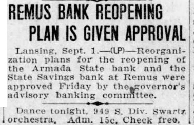 REMUS BANK REOPENING PLAN IS GIVEN APPROVAL Lansing, Sept. zation plans for the the Armada State bank and the State Savings bank at Remus were approved Friday by advisory banking committee. Dance 949 Div. Swartz orchestra, Adm. 15c. Check free,