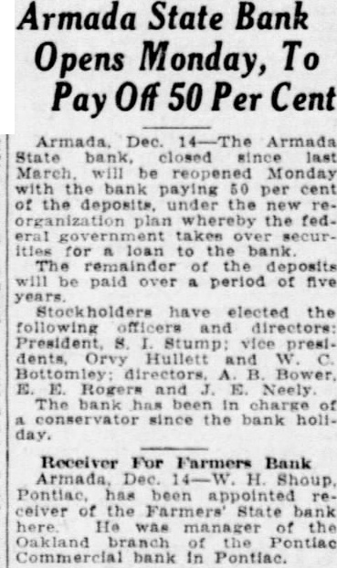 Armada State Bank Opens Monday, To Pay Off 50 Per Cent Armada. Dec. The Armada State bank, closed since March will be reopened Monday with the bank paying 50 per cent of the deposits under the the feditles for loan to the bank The of the deposits will be paid over a period of five Stockholders have elected the directors: dents, Hullett and W E. Rogers and E. Neely The bank In charge of conservator since the bank hollday. Receiver For Farmers Bank Pontiac, has been appointed receiver of the Farmers' State bank here. He manager of the Oakland branch of the Pontiac Commercial bank in Pontiac.