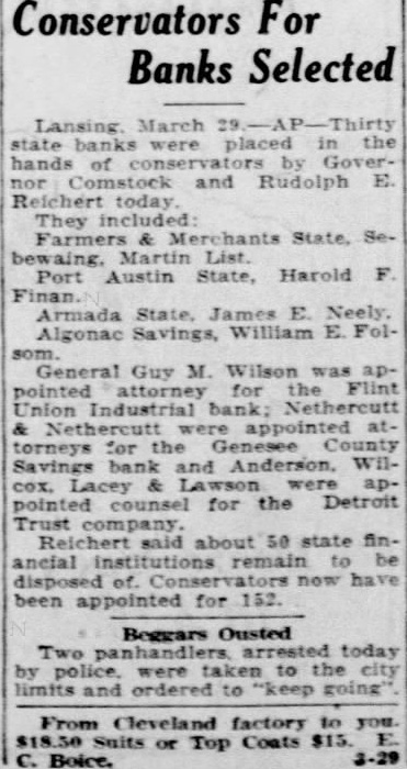 Conservators For Banks Selected March Thirty state placed hands of by Comstock and Rudolph E. Reichert today They Farmers Merchants State. Martin Port Austin State, Harold Finan. Armada State, E. Neely. Algonac William E. General Guy M. Wilson was appointed the Flint Union Industrial bank; Nethercutt Nethercutt appointed attorneys for the Savings bank and Anderson. apfor the Detroit Trust about 50 state financial remain be disposed of. been appointed for 152. Beggars Ousted Two today police. were to limits ordered to "keep From Cleveland factory to you. or Top Coats