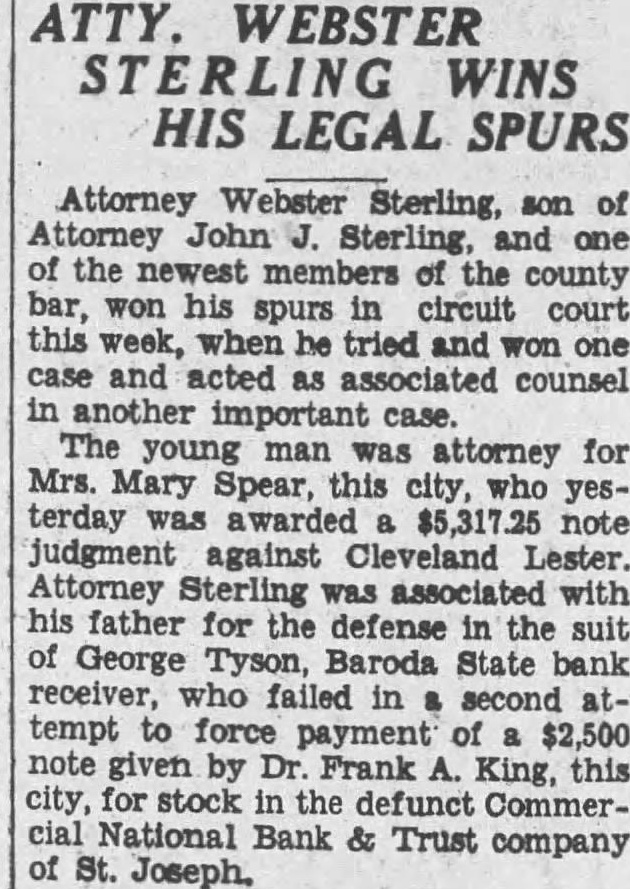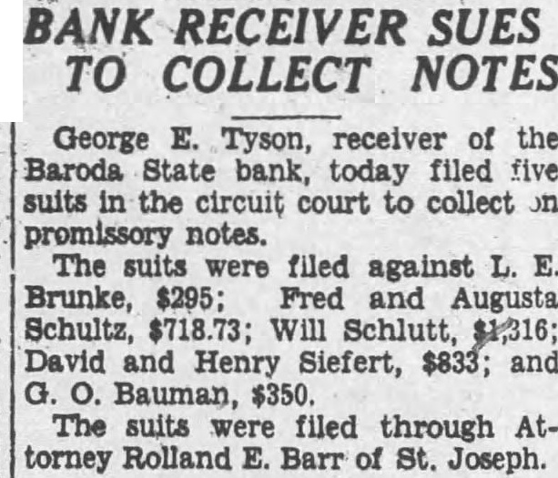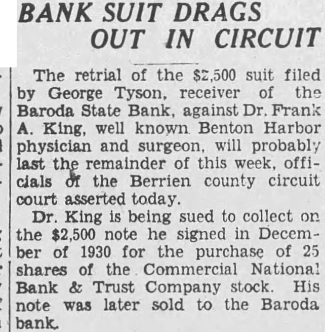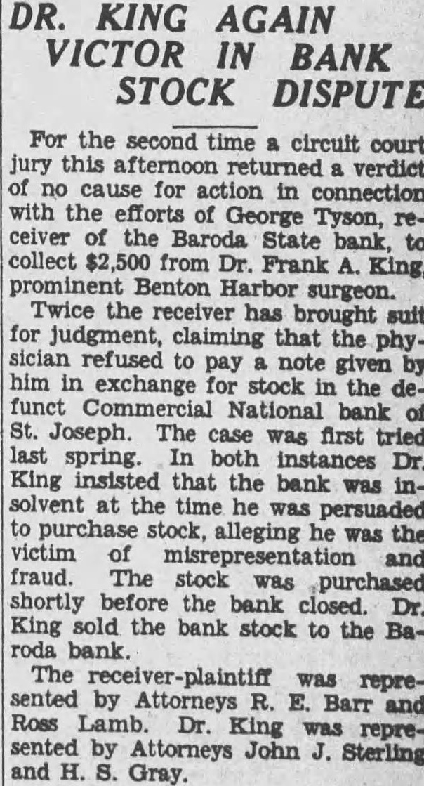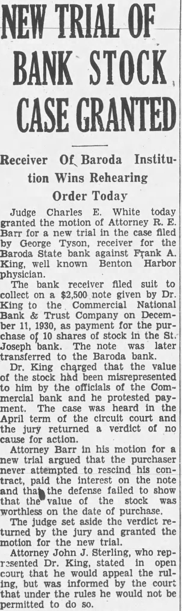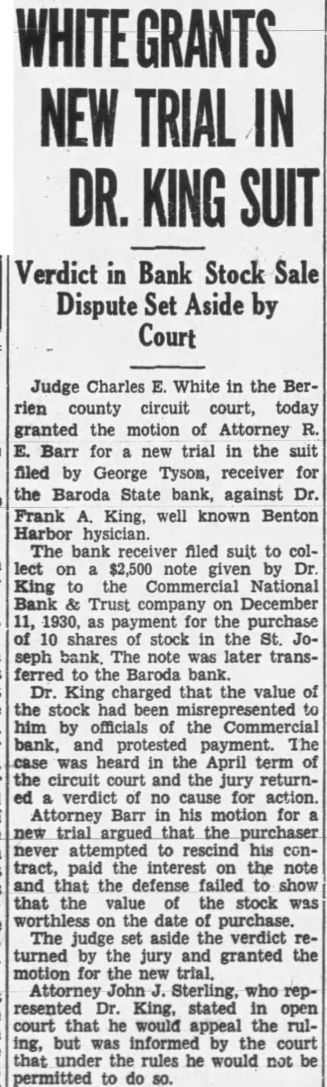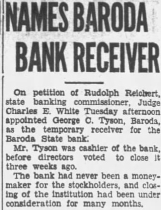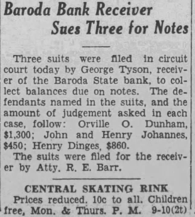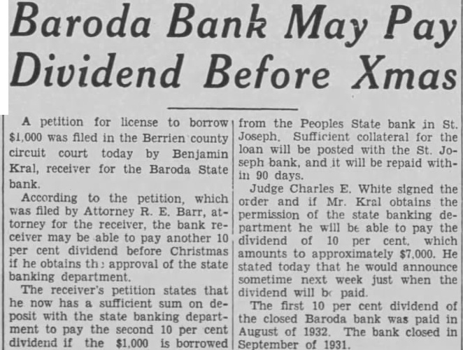 Another bright spot in the closed bank situation in Berrien shown through today when Circuit Judge Charles E. White signed an order permitting the Baroda State bank to pay depositors 10 percent dividend. This will amount to approximately $12,000, according to Attorney Rolland Barr, attorney for the receiver. The dividend will be paid as soon the state treasury department sends the money to the bank, which is expected to be the first part of next week. The petition relative to the opening up of the Benton Harbor State bank was made by Rudolph E. Reichert, state banking commissioner, and filed through State Attorney General Paul H. Voorheis and Assistant Attorney General Sid A. Erwin. It states that more than the necessary 85 percent the depositors have signed the depositors' agreement, copy of which is attached. Judge White expected to set date for hearing of the details of the plan soon. At that time, too, date for hearing objections also will be set. Objections must be filed in writing. Will Have $50,000 Capital The plan provides for the reopening of the bank with capital stock of least $60,000. The depositors have agreed to set aside 45 percent their deposits in liquidation trust fund. The balance of 55 percent will be paid out to de positors over period of five years. Fifteen percent will be paid within the first year, 15 percent the second, 20 percent the third and fourth years, and 30 percent the fifth year. The reorganization is in the hands of depositors' committee which some time ago concluded successful campaign to secure 85 percent of the depositors' signatures on the agreement. In signing the order for the payment percent dividend general claims in the Baroda State bank, Judge White also authorized the payment of $2,957.21 of preferred claims, all public funds. These will be paid as follows: Baroda village $203.54; Baroda township, Baroda school district No $537.96; district No. $748.71; No. $410.25, and No. 1, fractional, $35.