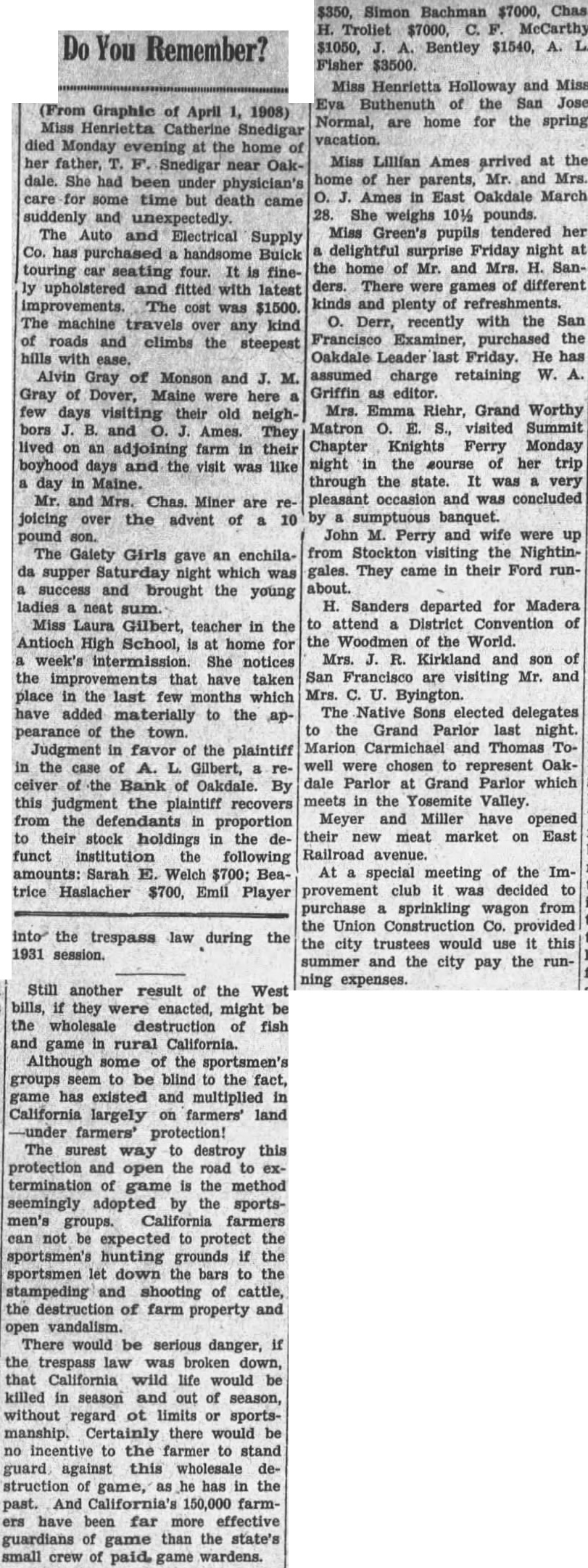 Do You Remember? (From Graphic of April 1, 1908) Miss Henrietta Catherine Snedigar died Monday evening at the home of her father, T. F. Snedigar near Oakdale. She had been under physician's care for some time but death came suddenly and unexpectedly. The Auto and Electrical Supply Co. has purchased a handsome Buick touring car seating four. It is finely upholstered and fitted with latest improvements. The cost was $1500. The machine travels over any kind of roads and climbs the steepest hills with ease. Alvin Gray of Monson and J. M. Gray of Dover, Maine were here a few days visiting their old neighbors J. B. and O. J. Ames. They lived on an adjoining farm in their boyhood days and the visit was like a day in Maine. Mr. and Mrs. Chas. Miner are rejoicing over the advent of a 10 pound son. The Galety Girls gave an enchilada supper Saturday night which was a success and brought the young ladies neat sum. Miss Laura Gilbert, teacher in the Antioch High School, is at home for a week's intermission. She notices the improvements that have taken place in the last few months which have added materially to the appearance of the town. Judgment in favor of the plaintiff in the case of A. L. Gilbert, a receiver of the Bank of Oakdale. By this judgment the plaintiff recovers from the defendants in proportion to their stock holdings in the defunct institution the following amounts: Sarah E. Welch $700; Beatrice Haslacher $700, Emil Player into the trespass law during the 1931 session. Still another result of the West bills, if they were enacted, might be the wholesale destruction of fish and game in rural California. Although some of the sportsmen's groups seem to be blind to the fact, game has existed and multiplied in California largely on farmers' land -under farmers' protection! The surest way to destroy this protection and open the road to extermination of game is the method seemingly adopted by the sportsmen's groups. California farmers can not be expected to protect the sportsmen's hunting grounds if the sportsmen let down the bars to the stampeding and shooting of cattle, the destruction of farm property and open vandalism. There would be serious danger, if the trespass law was broken down, that California wild life would be killed in season and out of season, without regard ot limits or sportsmanship. Certainly there would be no incentive to the farmer to stand guard against this wholesale destruction of game, as he has in the past. And California's 150,000 farmers have been far more effective guardians of game than the state's small crew of paid. game wardens. $350, Simon Bachman $7000, Chas. H. Troliet $7000, C. F. McCarthy $1050, J. A. Bentley $1540, A. L. Fisher $3500. Miss Henrietta Holloway and Miss Eva Buthenuth of the San Jose Normal, are home for the spring vacation. Miss Lillian Ames arrived at the home of her parents, Mr. and Mrs. O. J. Ames in East Oakdale March 28. She weighs 101/2 pounds. Miss Green's pupils tendered her a delightful surprise Friday night at the home of Mr. and Mrs. H. Sanders. There were games of different kinds and plenty of refreshments. O. Derr, recently with the San Francisco Examiner, purchased the Oakdale Leader last Friday. He has assumed charge retaining W. A. Griffin as editor. Mrs. Emma Riehr, Grand Worthy Matron O. E. S., visited Summit Chapter Knights Ferry Monday night in the course of her trip through the state. It was a very pleasant occasion and was concluded by a sumptuous banquet. John M. Perry and wife were up from Stockton visiting the Nightingales. They came in their Ford runabout. H. Sanders departed for Madera to attend a District Convention of the Woodmen of the World. Mrs. J. R. Kirkland and son of San Francisco are visiting Mr. and Mrs. C. U. Byington. The Native Sons elected delegates to the Grand Parlor last night. Marion Carmichael and Thomas Towell were chosen to represent Oakdale Parlor at Grand Parlor which meets in the Yosemite Valley. Meyer and Miller have opened their new meat market on East Railroad avenue. At a special meeting of the Improvement club it was decided to purchase a sprinkling wagon from the Union Construction Co. provided the city trustees would use it this summer and the city pay the running expenses.