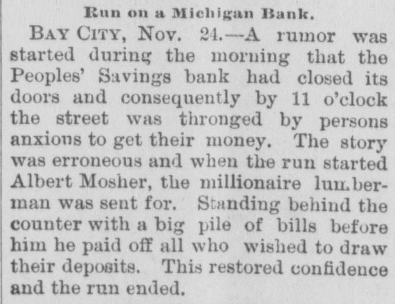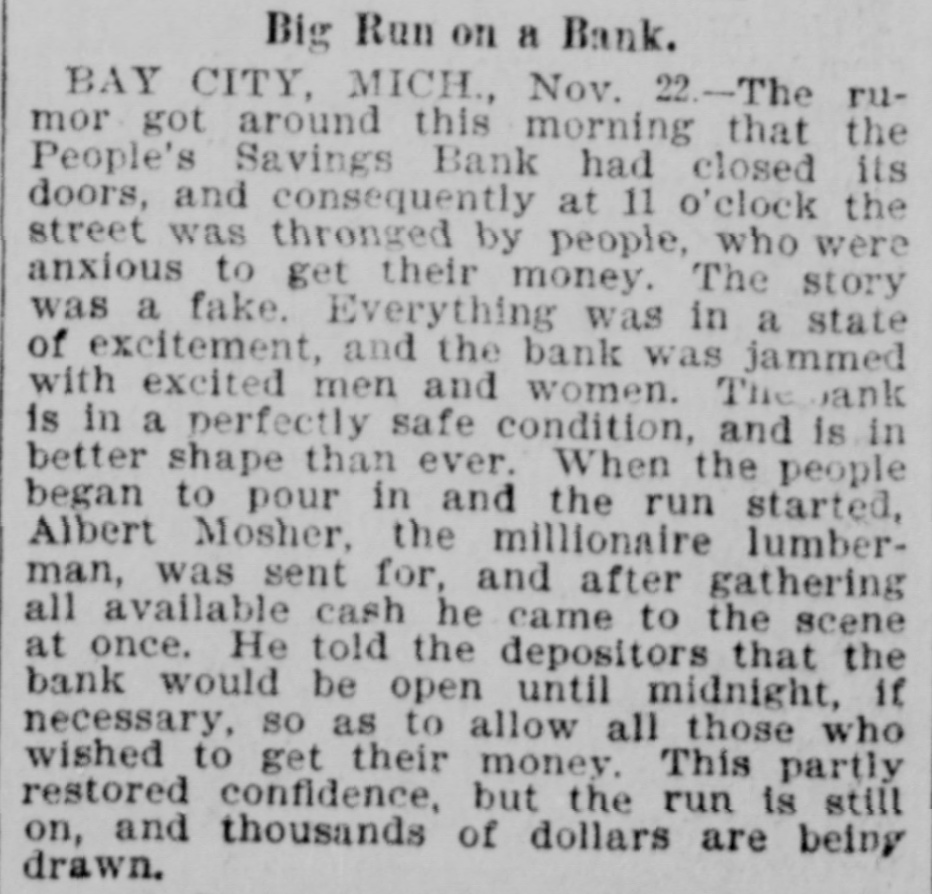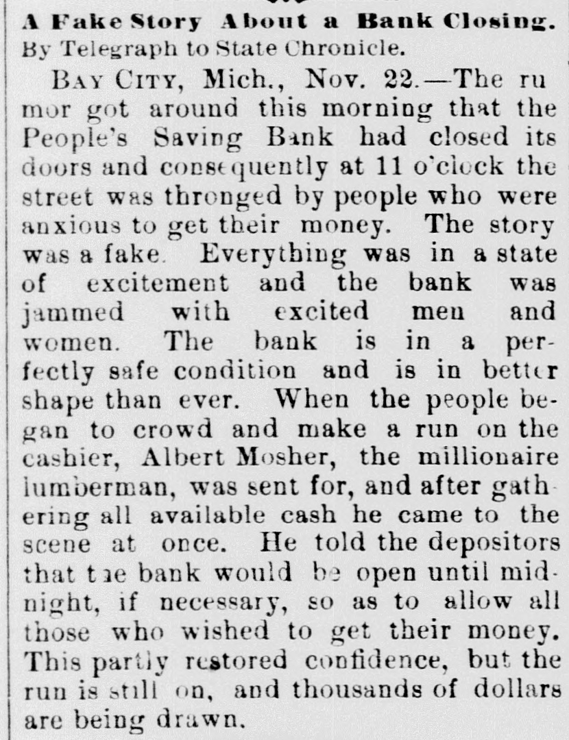 A Fake Story About a Bank Closing. By Telegraph to State Chronicle. BAY CITY, Mich., Nov. 22.-The ru mor got around this morning that the People's Saving Bank had closed its doors and conse quently at 11 o'clock the street was thronged by people who were anxious to get their money. The story was a fake. Everything was in a state of excitement and the bank was jammed with excited men and women. The bank is in a perfectly safe condition and is in better shape than ever. When the people began to crowd and make a run on the cashier, Albert Mosher, the millionaire lumberman, was sent for, and after gath ering all available cash he came to the scene at once. He told the depositors that the bank would be open until midnight, if necessary, so as to allow all those who wished to get their money. This partly restored confidence, but the run is still on, and thousands of dollars are being drawn.